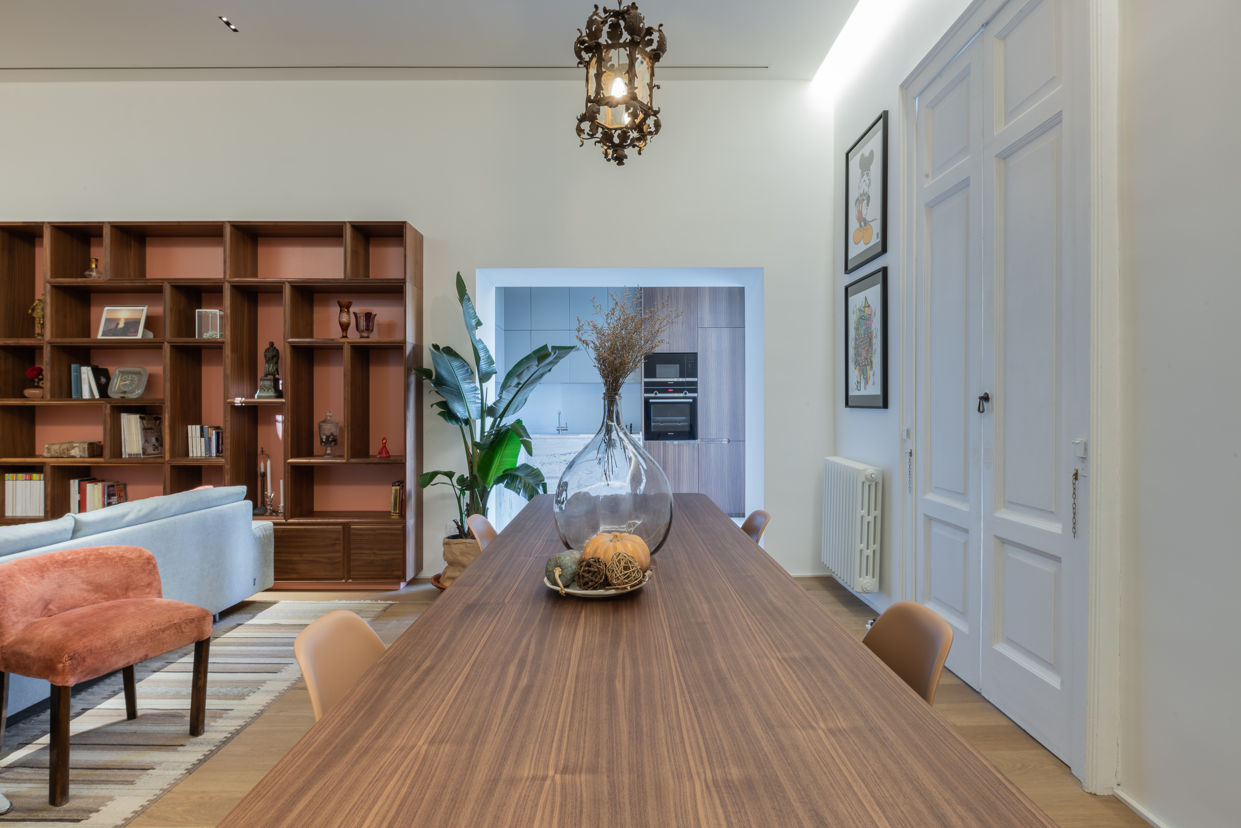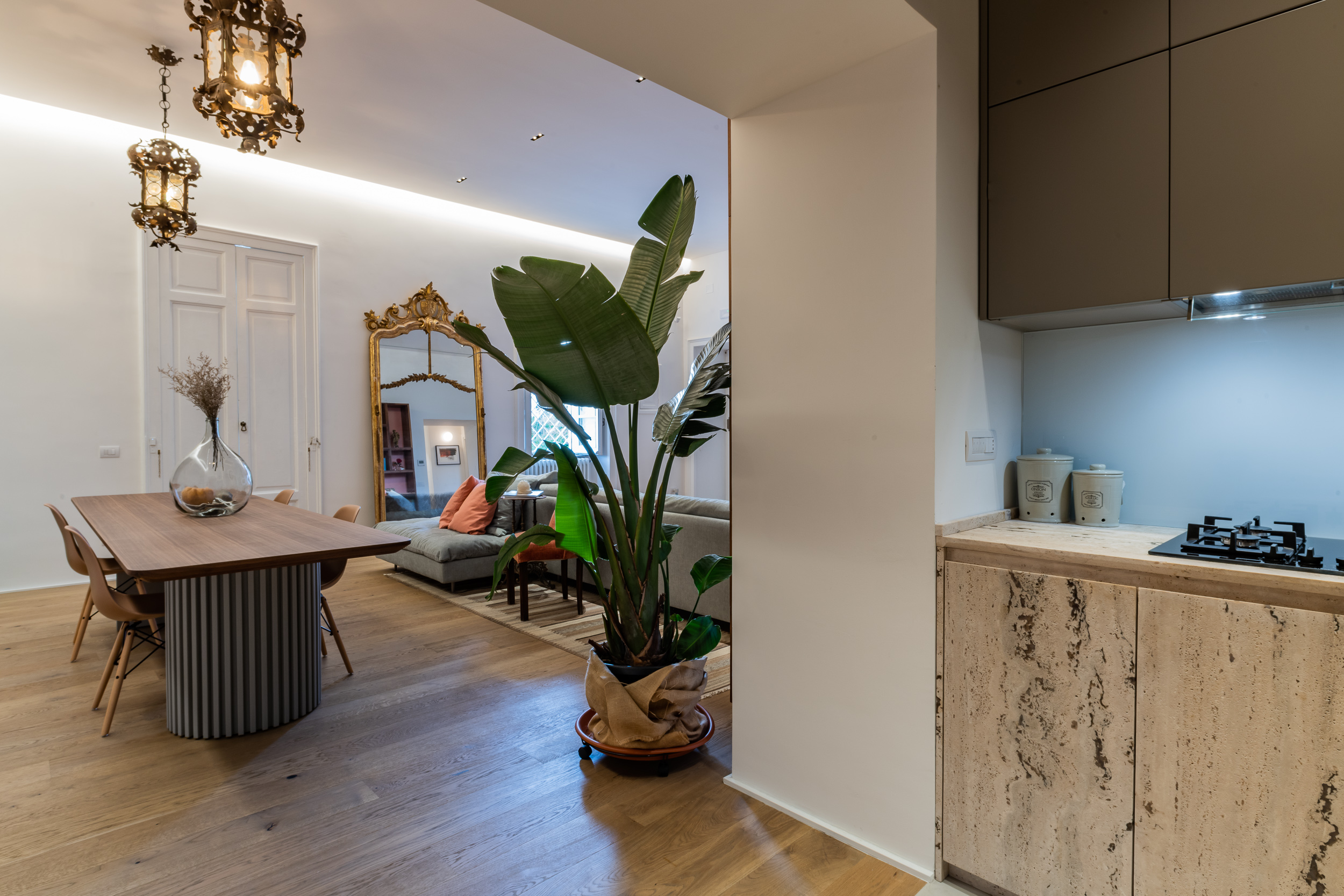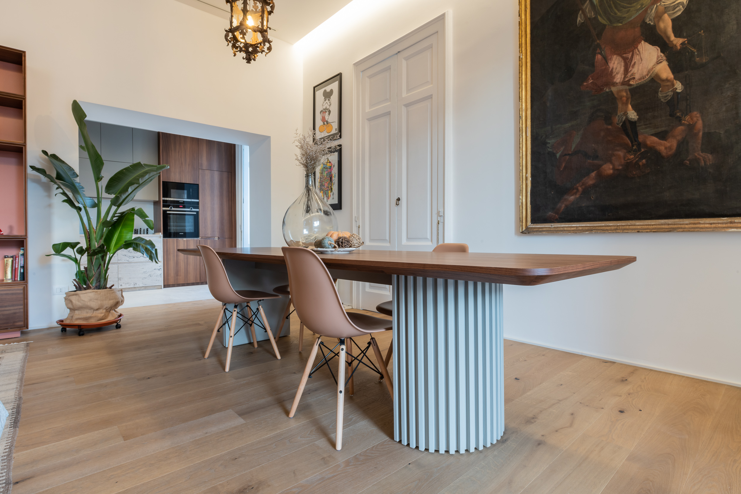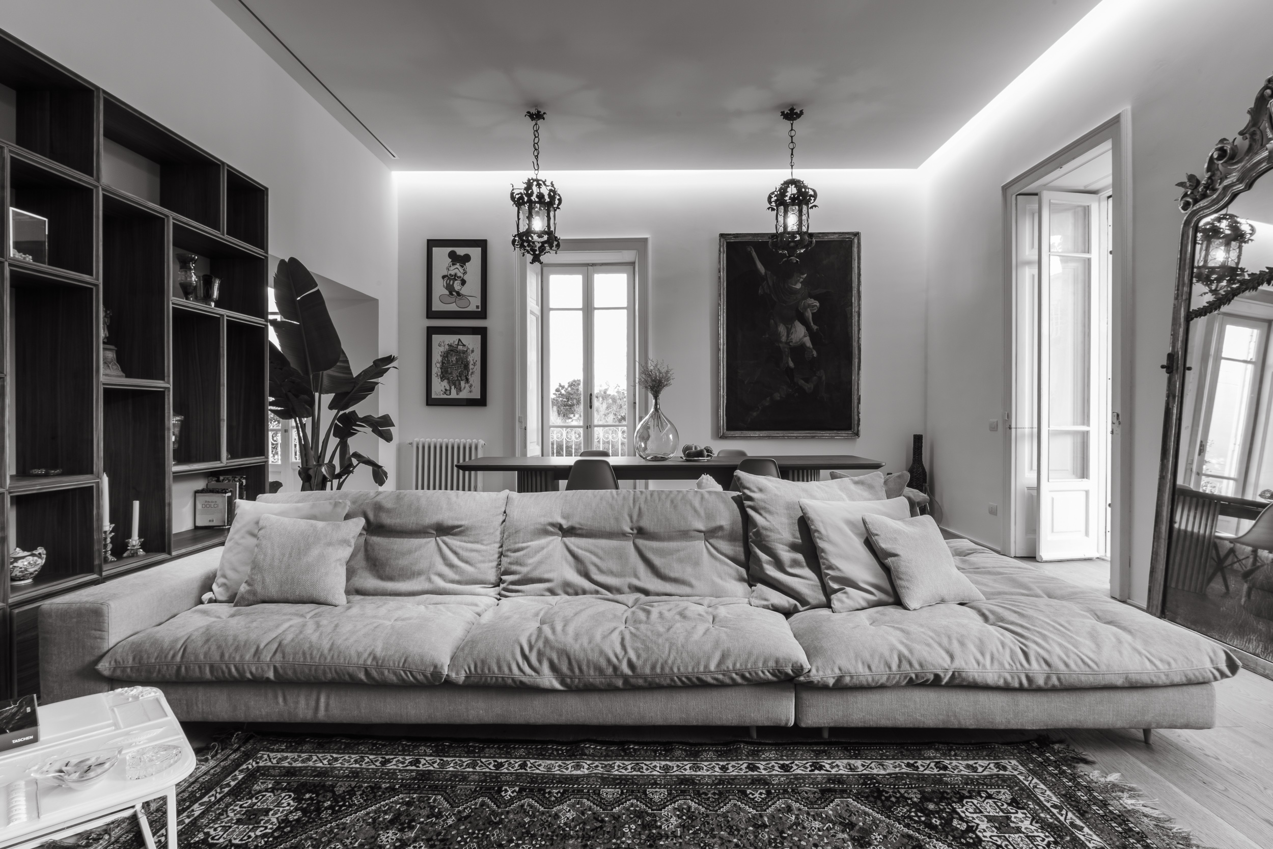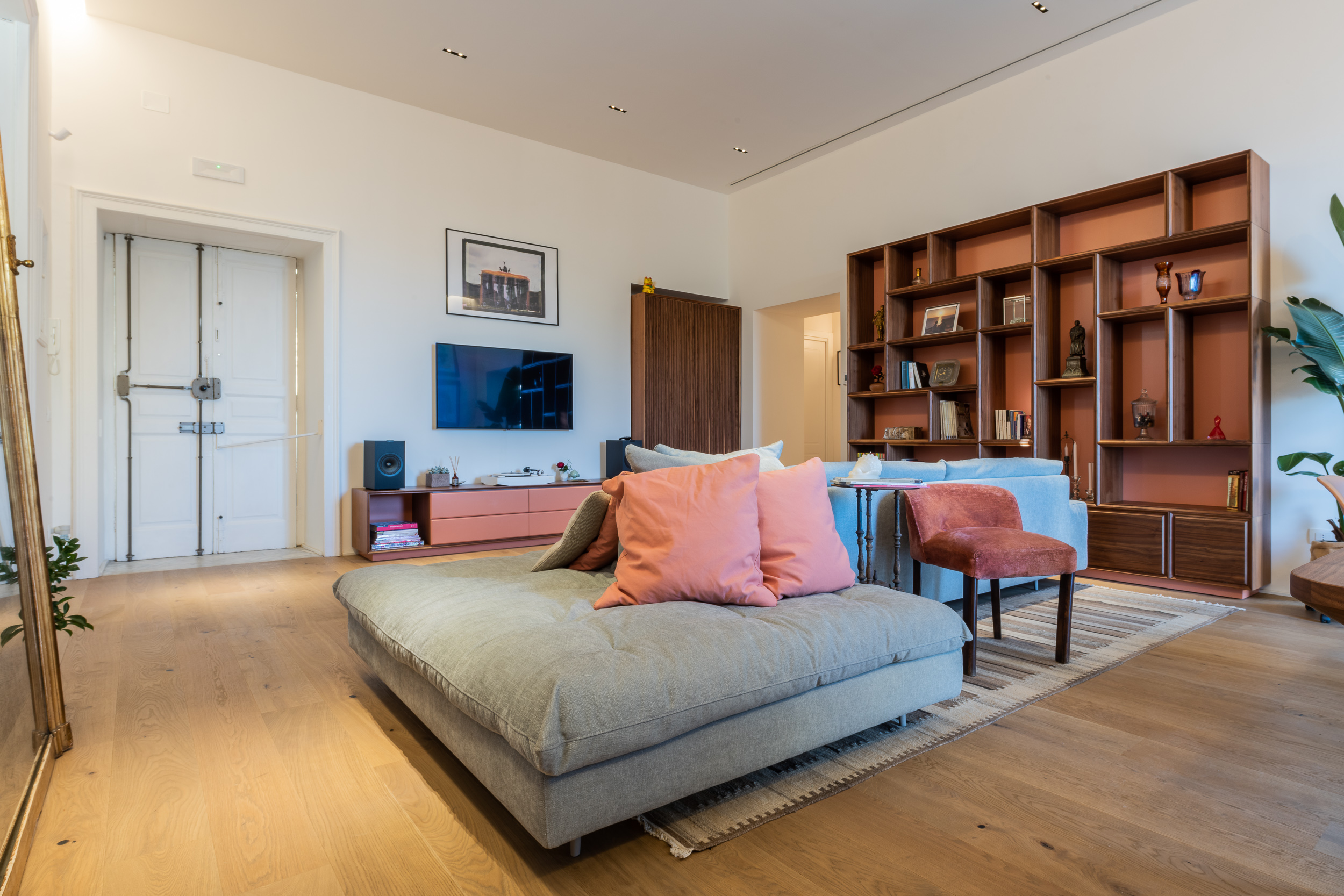 L’appartamento è in stile contemporaneo e abbiamo giocato con le contrapposizione non solo per gli elementi architettonici interni, ma anche con i materiali. Tutta la cucina, ad esempio, è rifinita in marmo massello a contrasto con elementi più classici della zona living. Anche il progetto illumino-tecnico ha tenuto conto delle caratteristiche storiche dell’immobile, visto che abbiamo soffitti alti oltre i 4 metri.