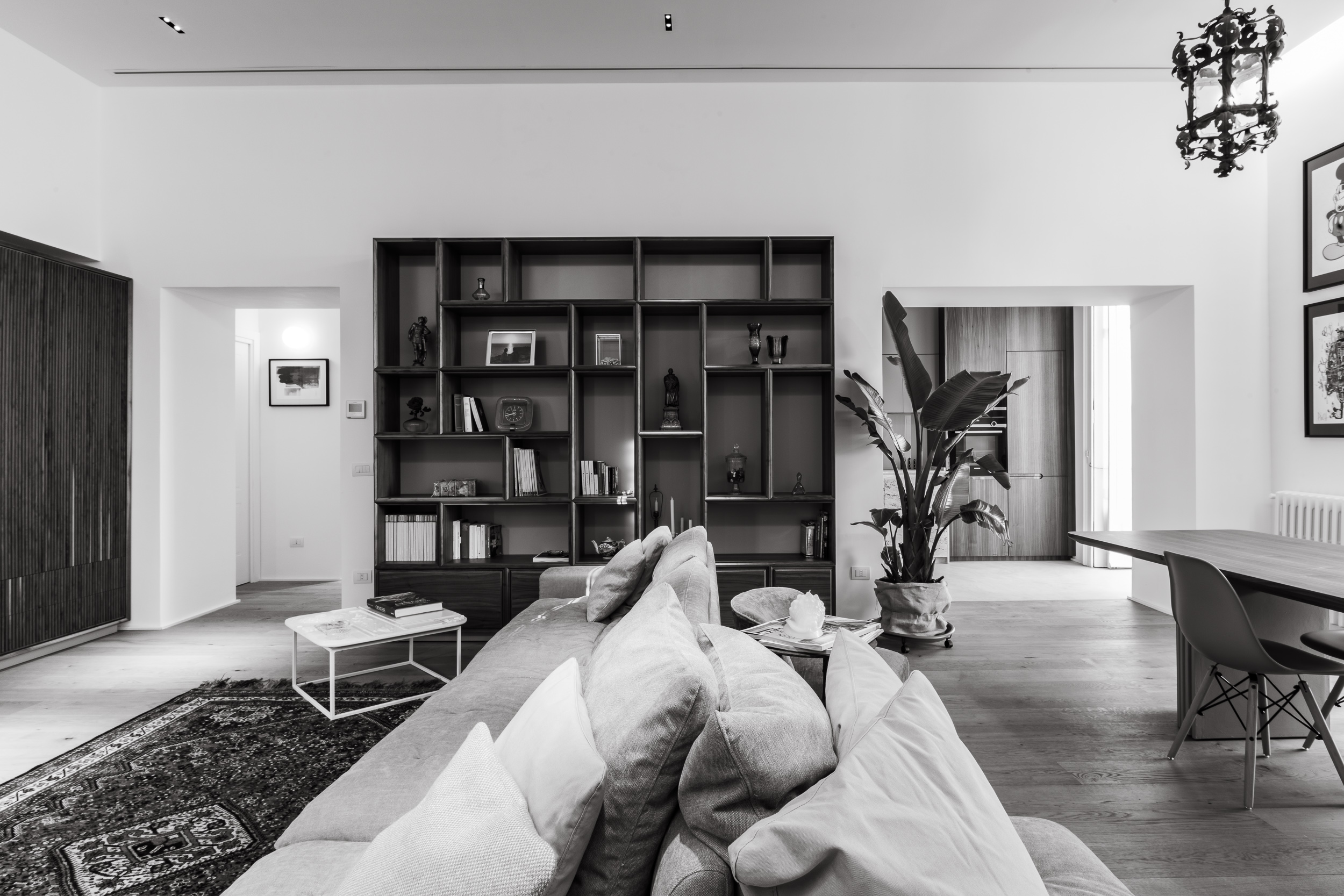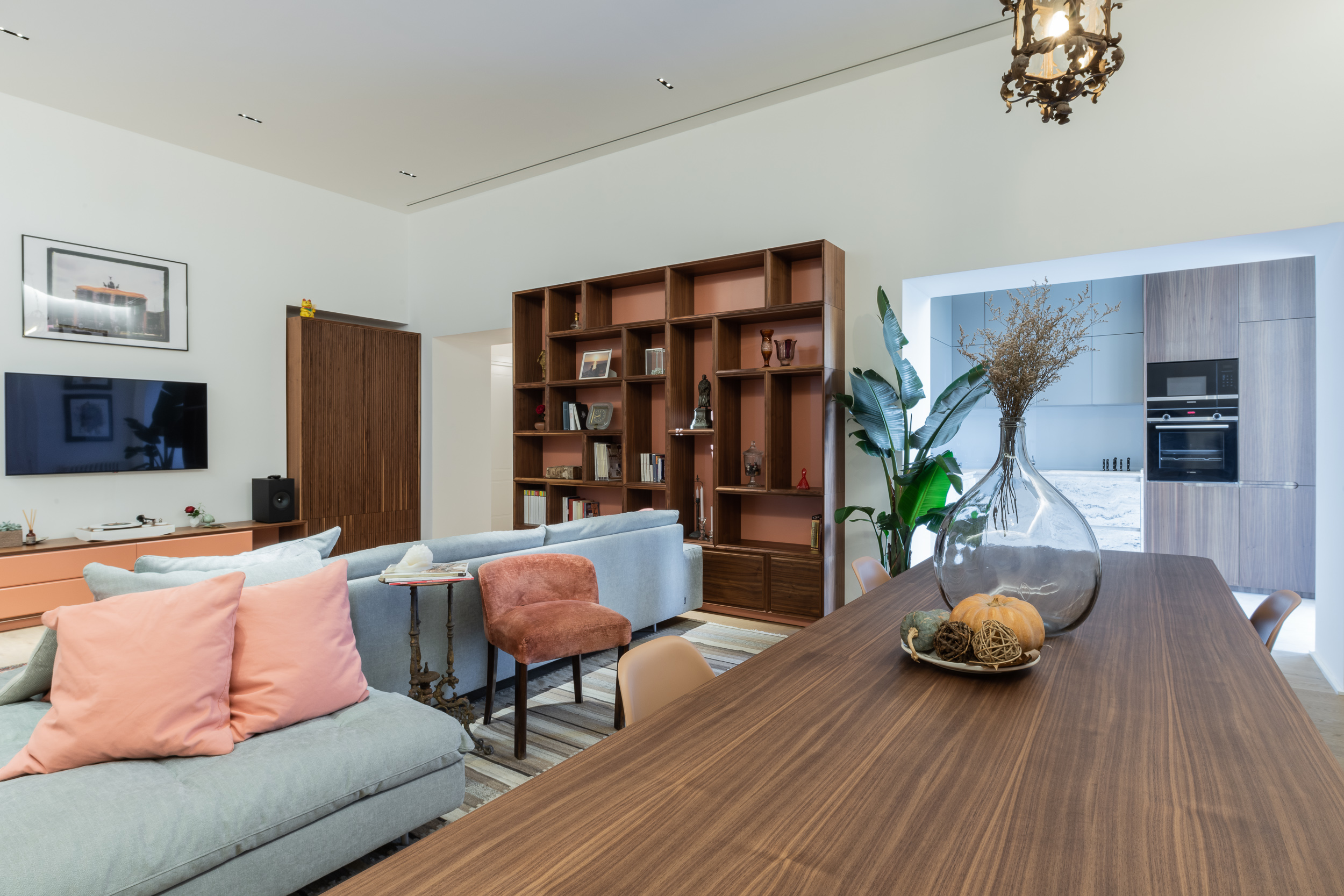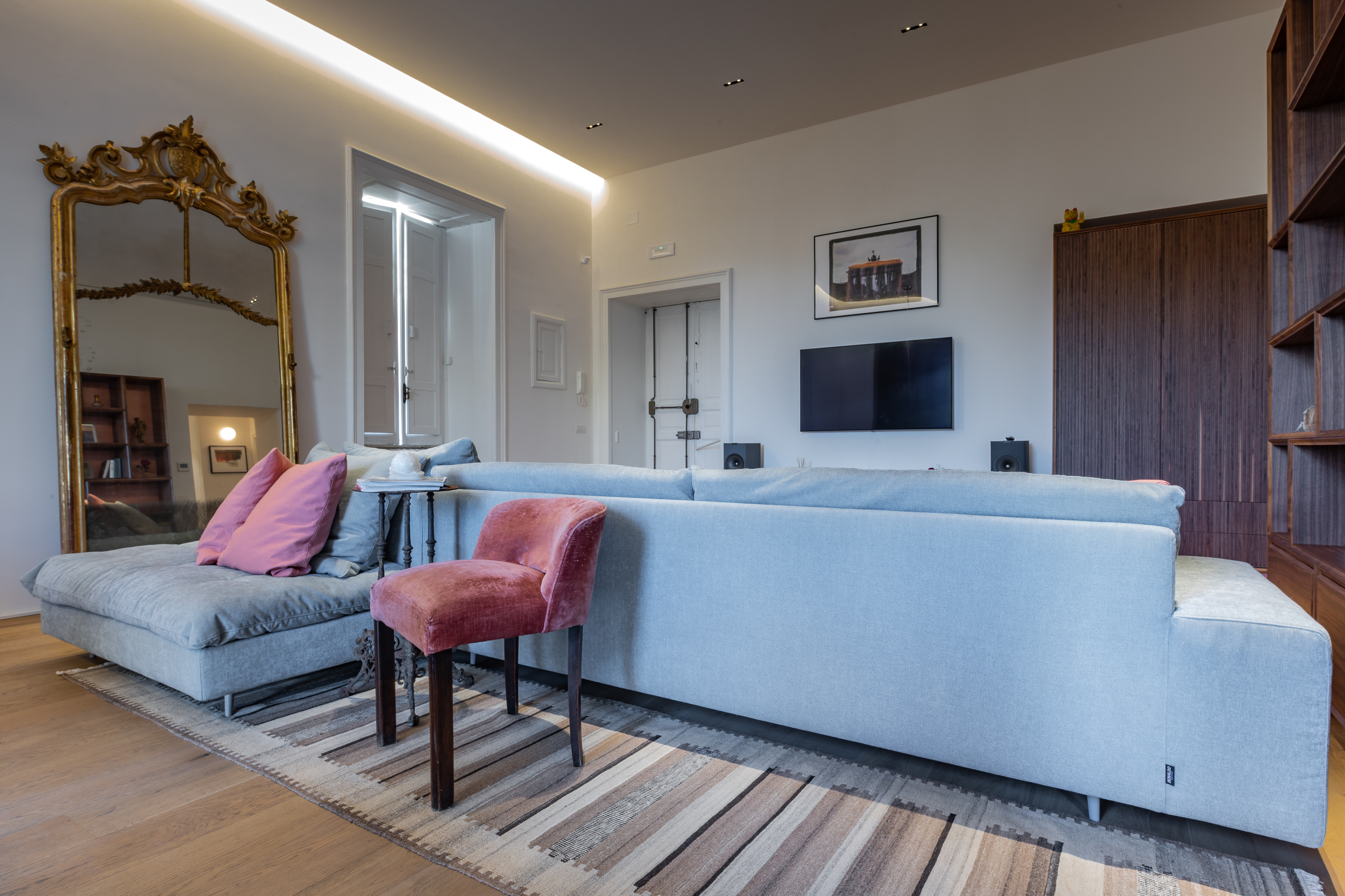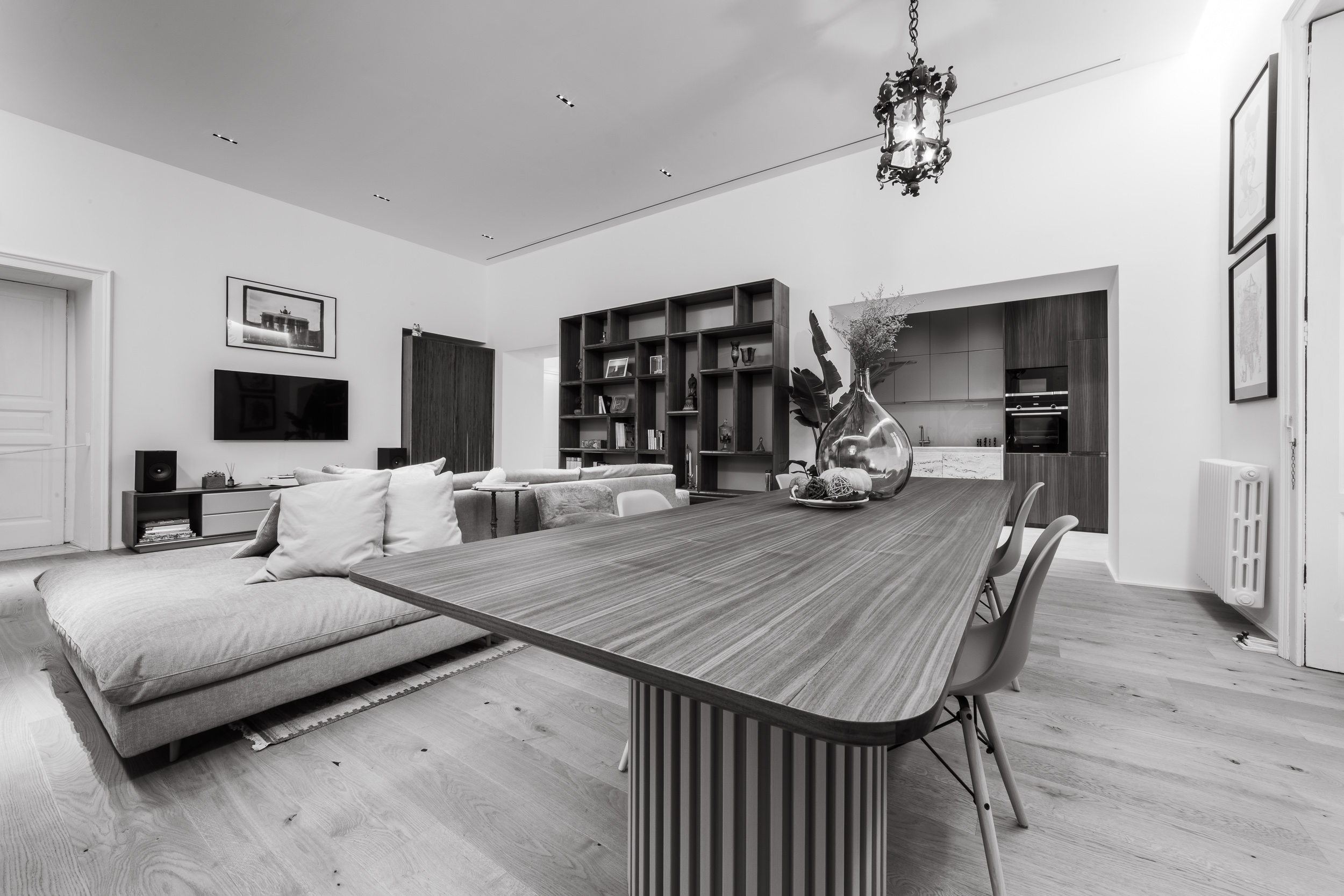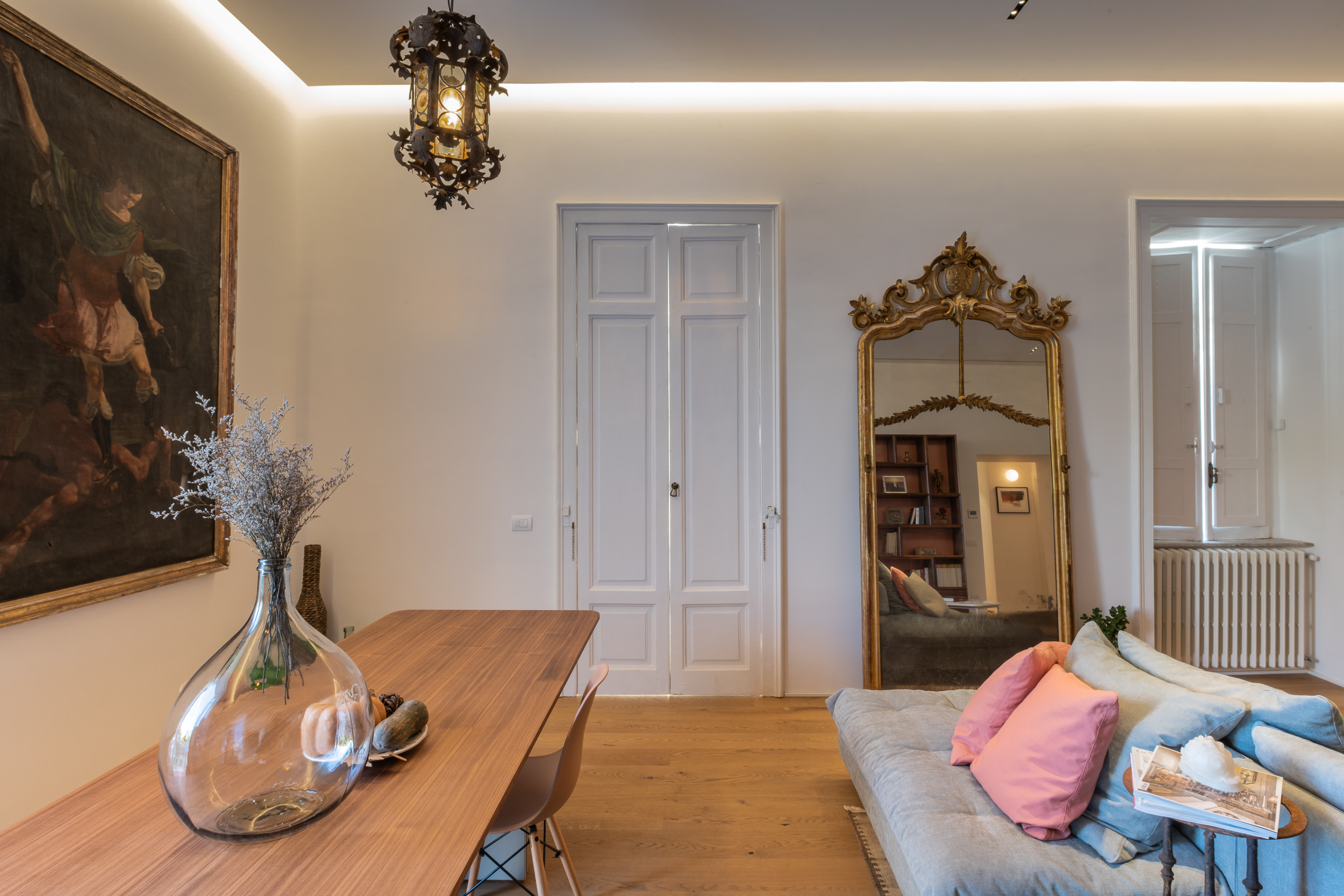 L’appartamento è in stile contemporaneo e abbiamo giocato con le contrapposizione non solo per gli elementi architettonici interni, ma anche con i materiali. Tutta la cucina, ad esempio, è rifinita in marmo massello a contrasto con elementi più classici della zona living. Anche il progetto illumino-tecnico ha tenuto conto delle caratteristiche storiche dell’immobile, visto che abbiamo soffitti alti oltre i 4 metri.