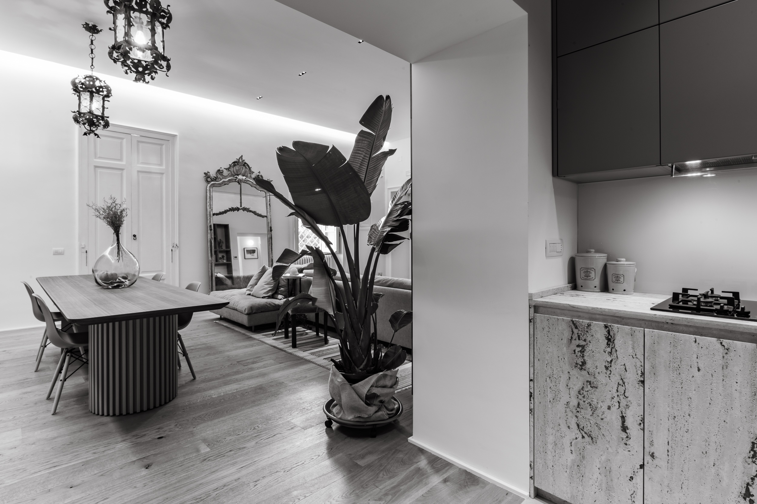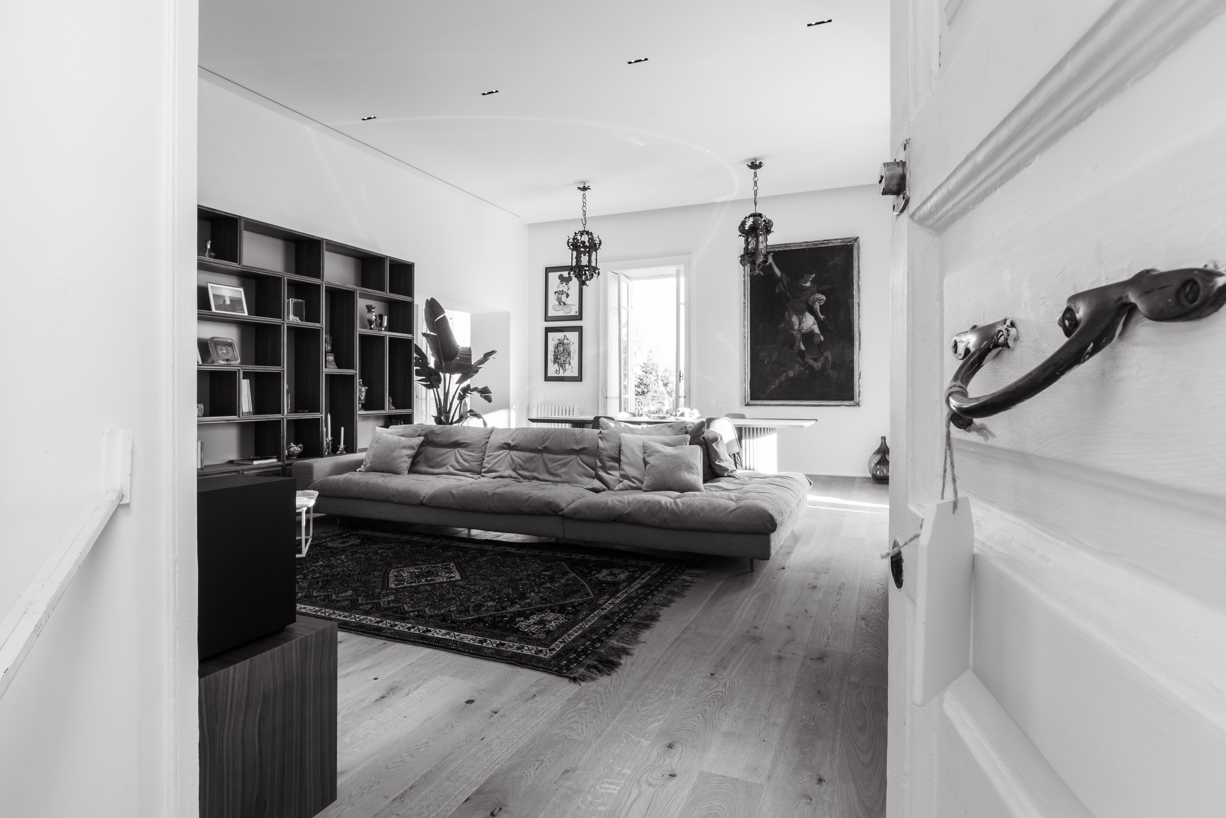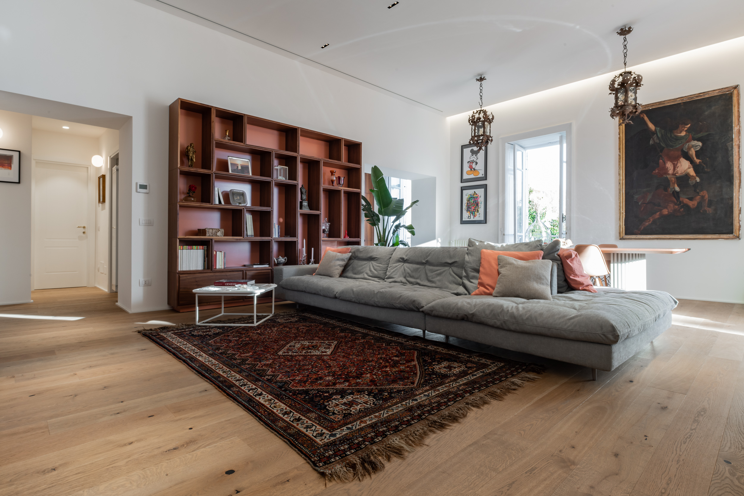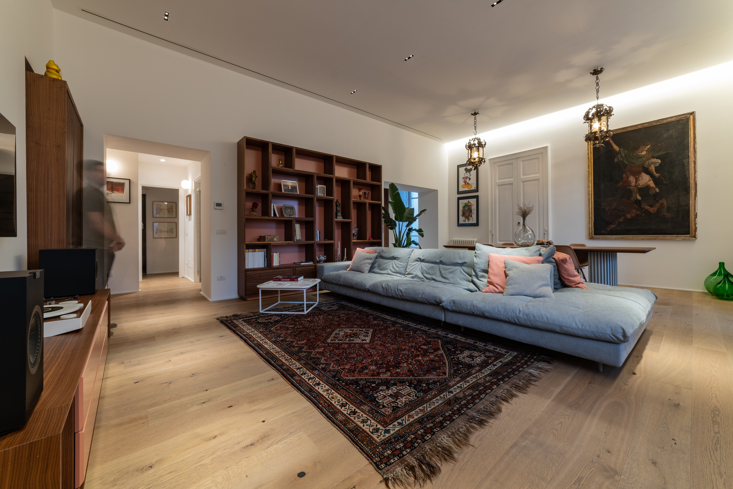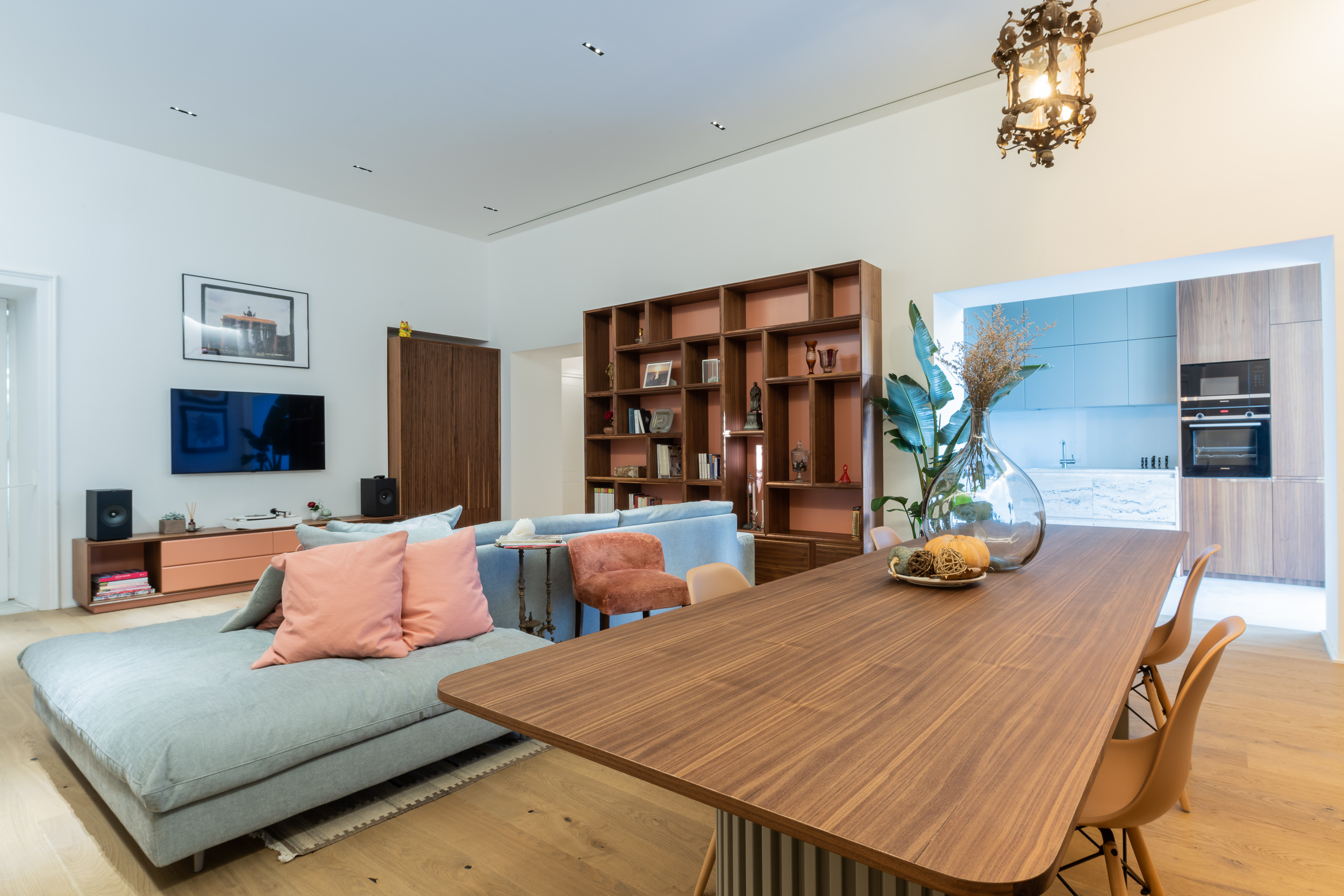 L’appartamento è in stile contemporaneo e abbiamo giocato con le contrapposizione non solo per gli elementi architettonici interni, ma anche con i materiali. Tutta la cucina, ad esempio, è rifinita in marmo massello a contrasto con elementi più classici della zona living. Anche il progetto illumino-tecnico ha tenuto conto delle caratteristiche storiche dell’immobile, visto che abbiamo soffitti alti oltre i 4 metri.