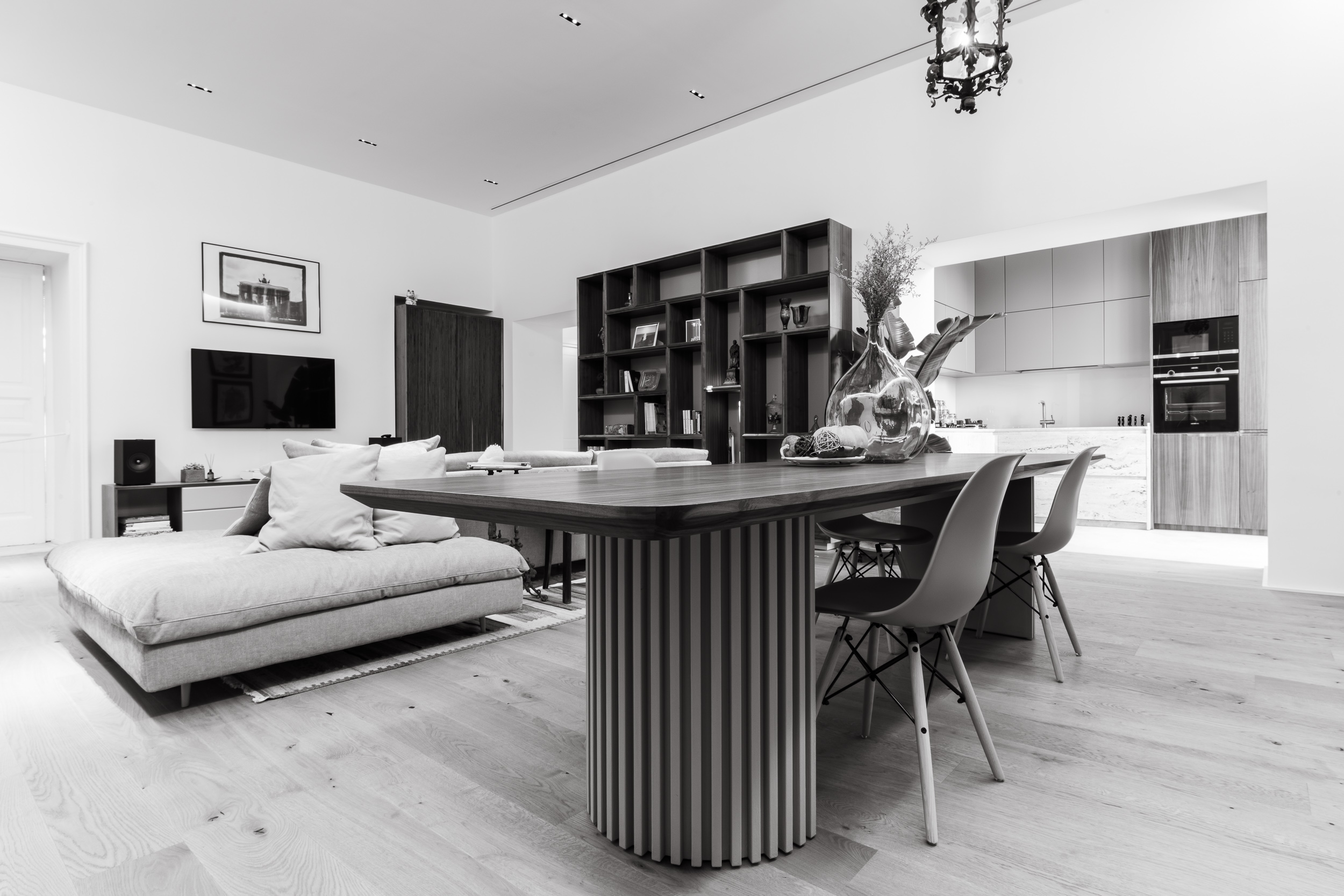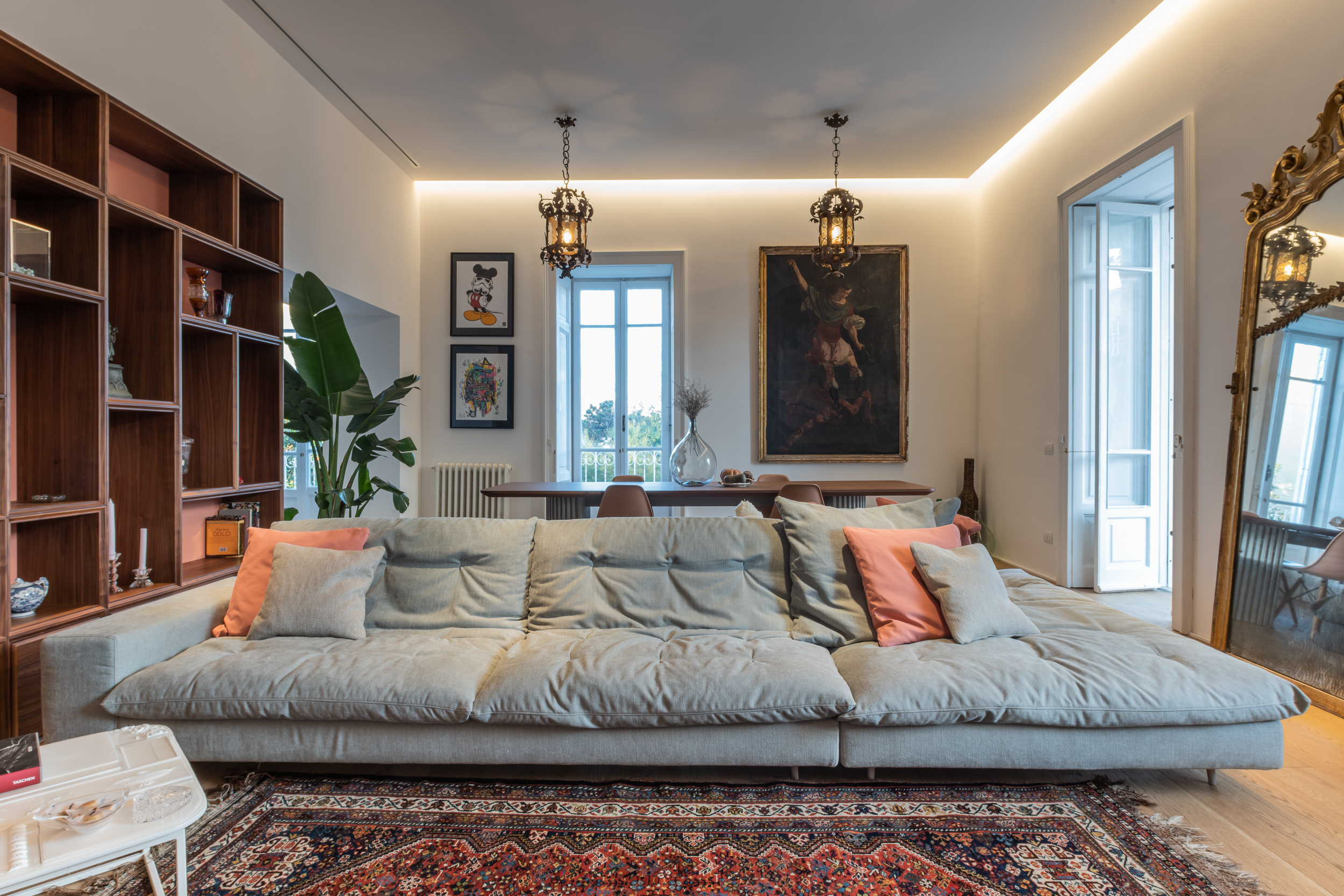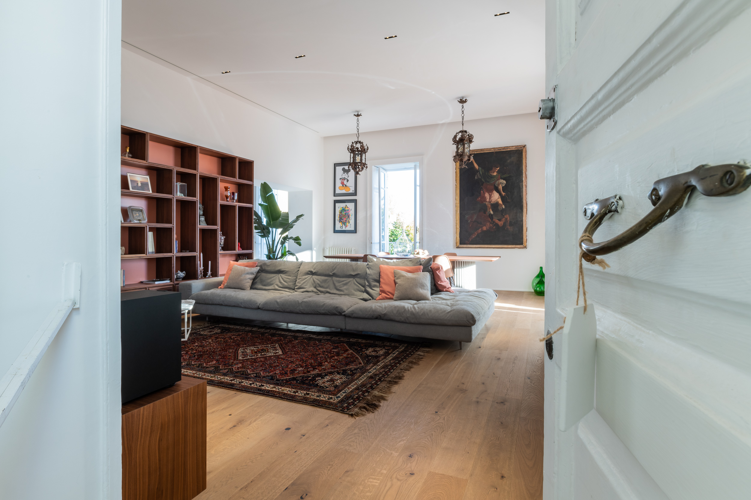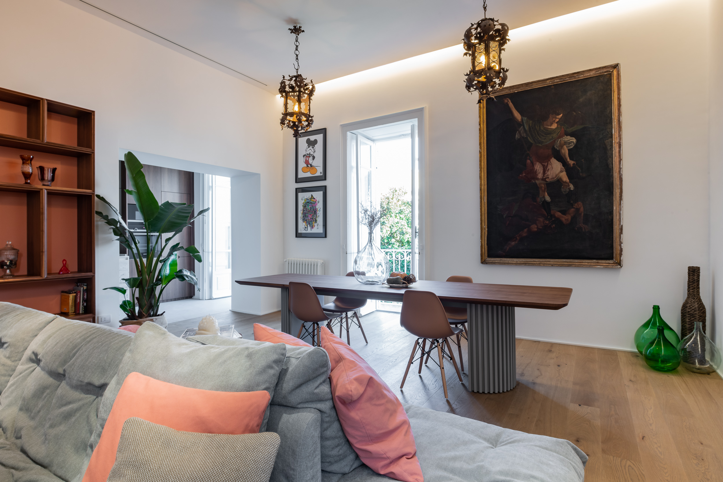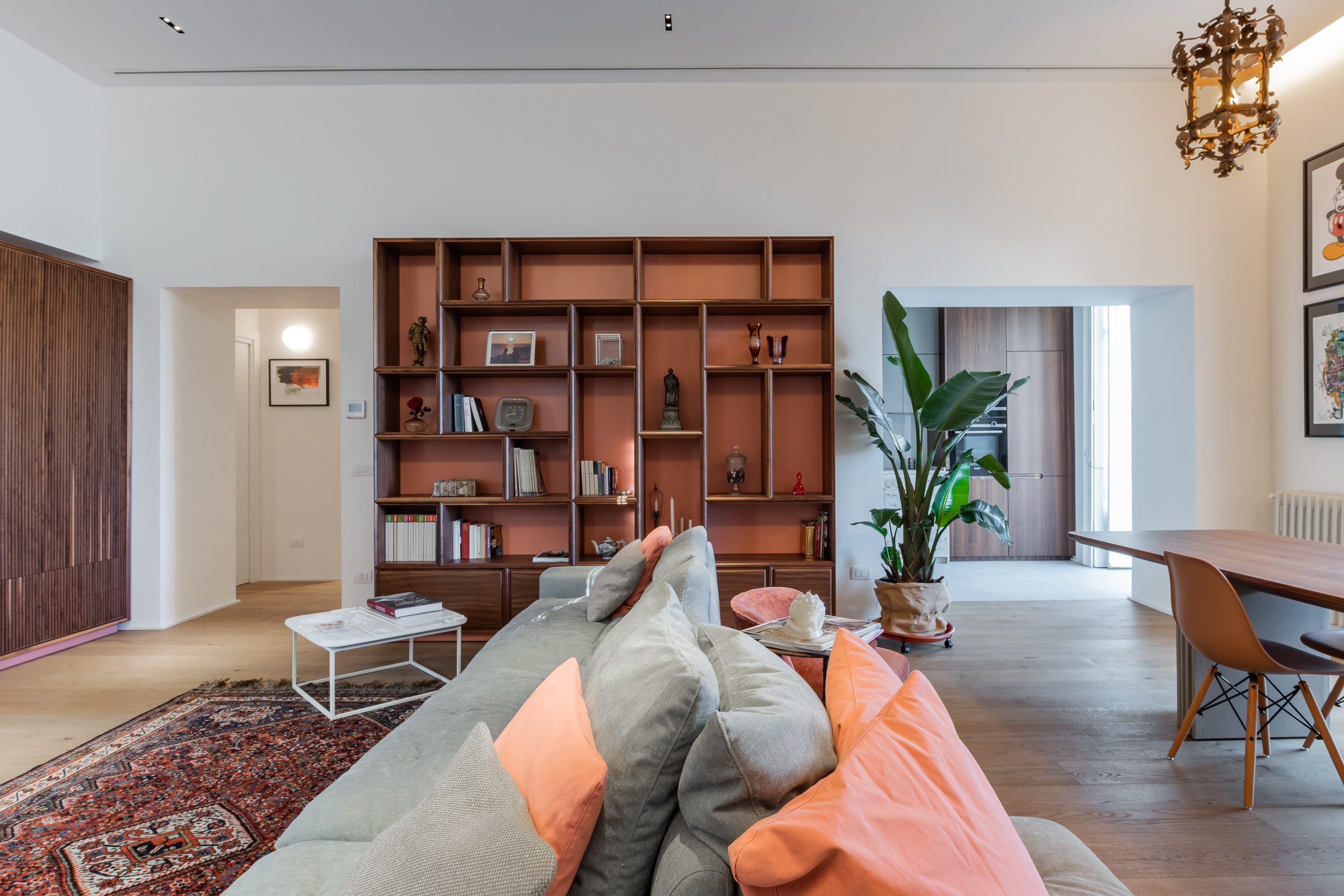 L’appartamento è in stile contemporaneo e abbiamo giocato con le contrapposizione non solo per gli elementi architettonici interni, ma anche con i materiali. Tutta la cucina, ad esempio, è rifinita in marmo massello a contrasto con elementi più classici della zona living. Anche il progetto illumino-tecnico ha tenuto conto delle caratteristiche storiche dell’immobile, visto che abbiamo soffitti alti oltre i 4 metri.