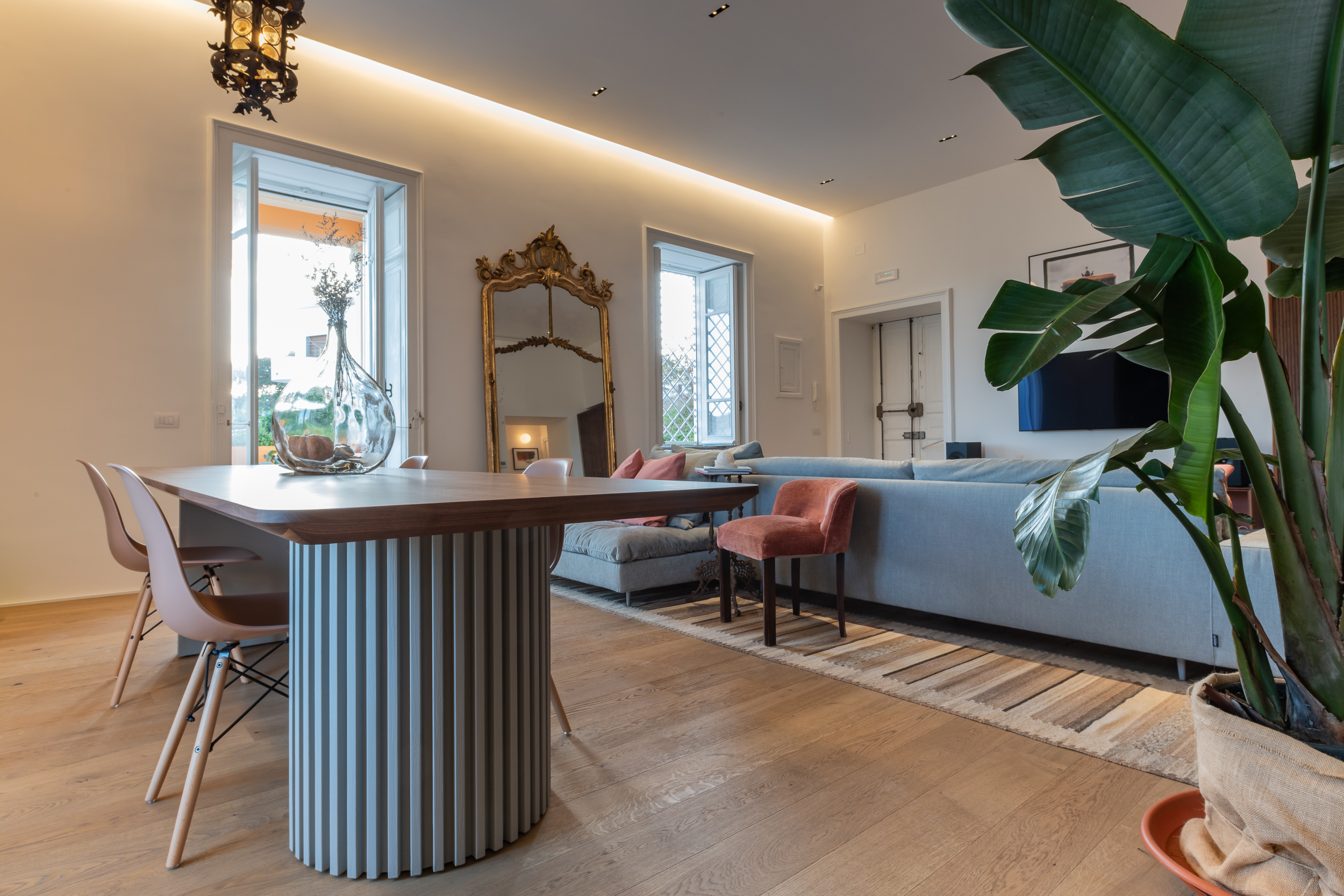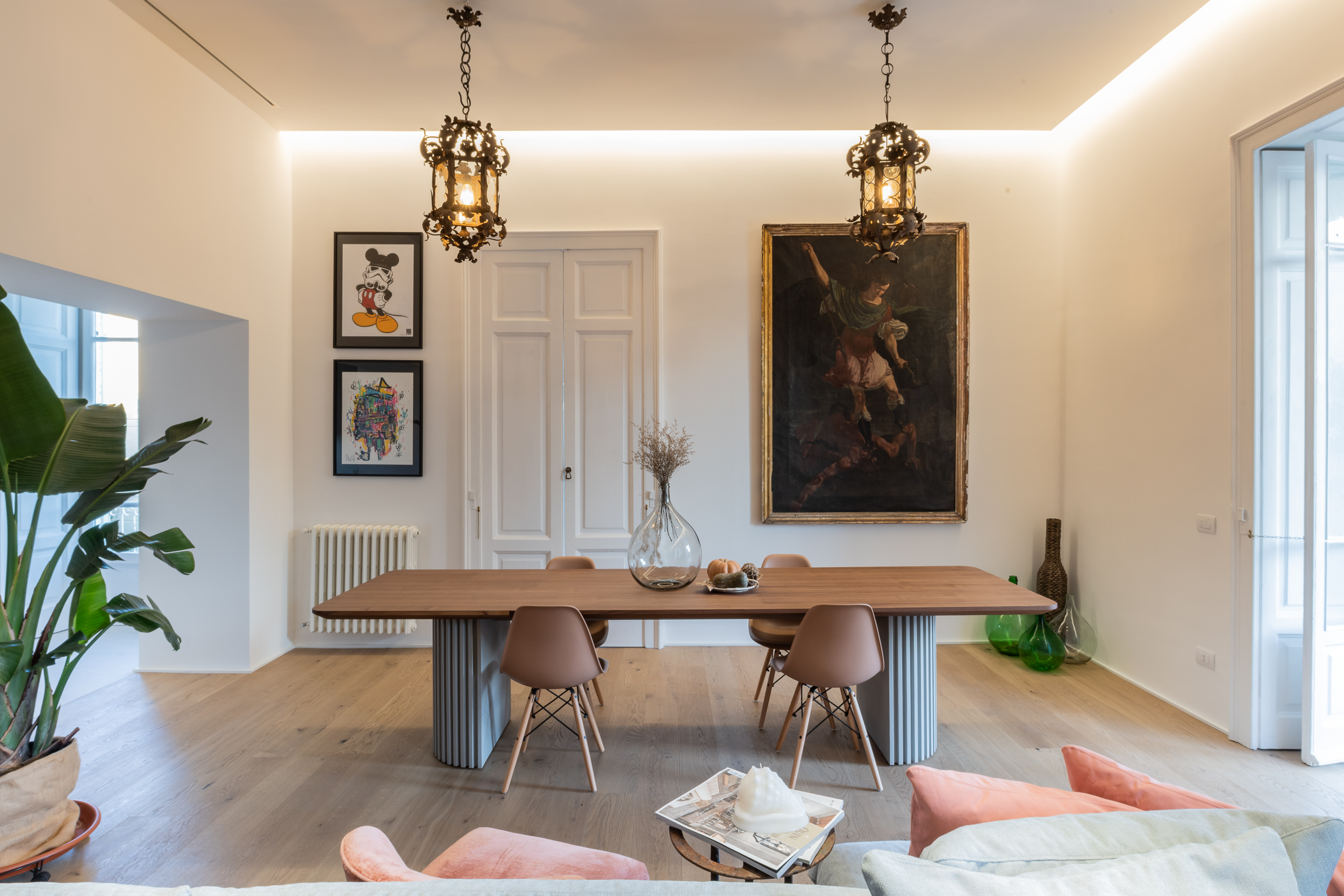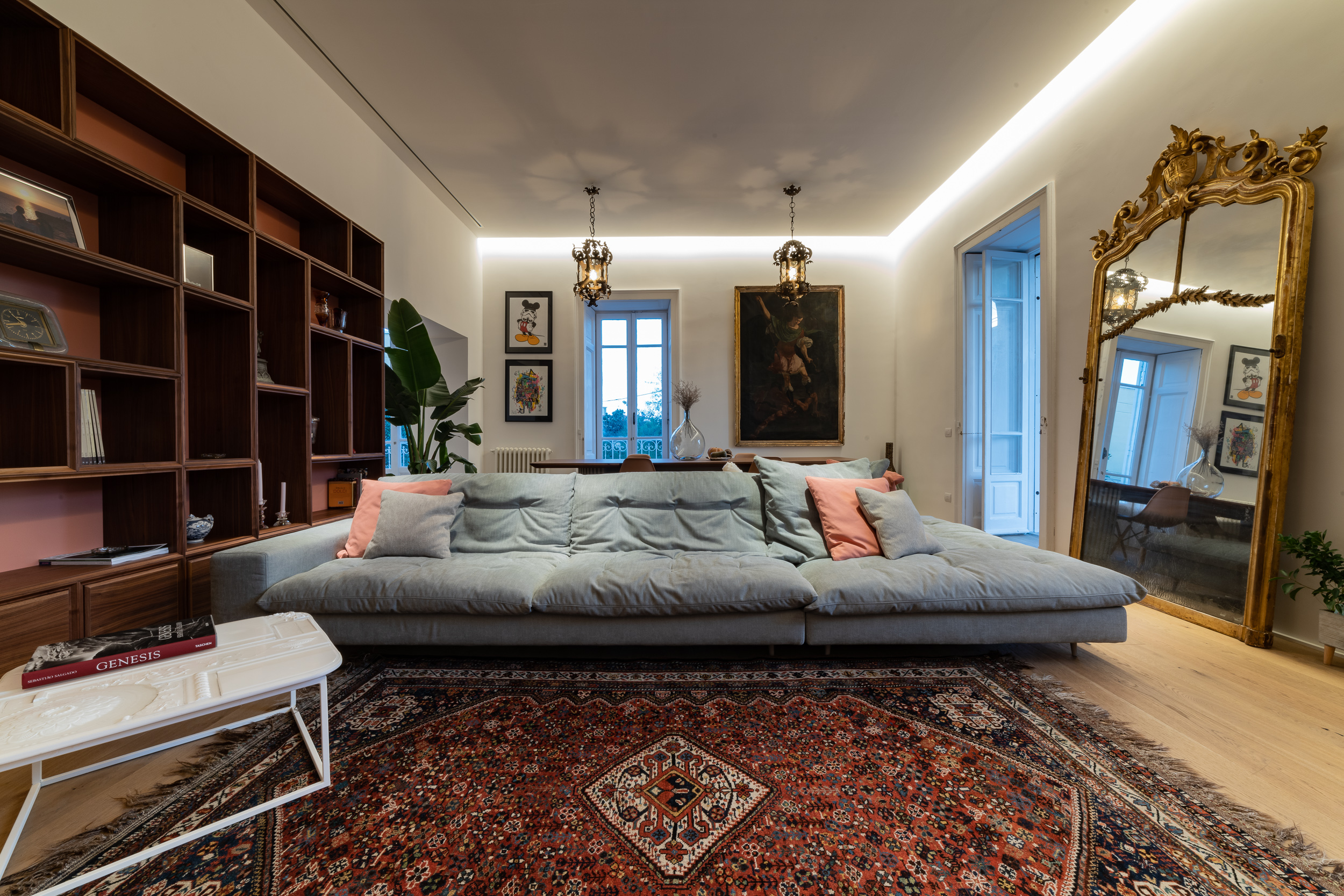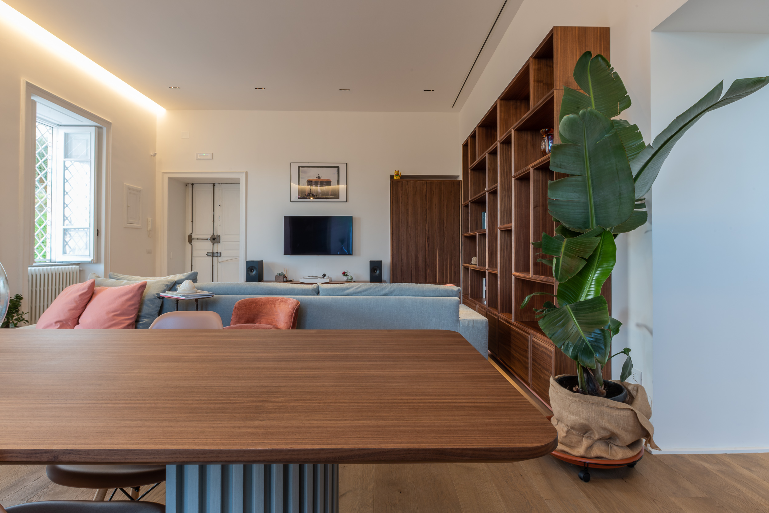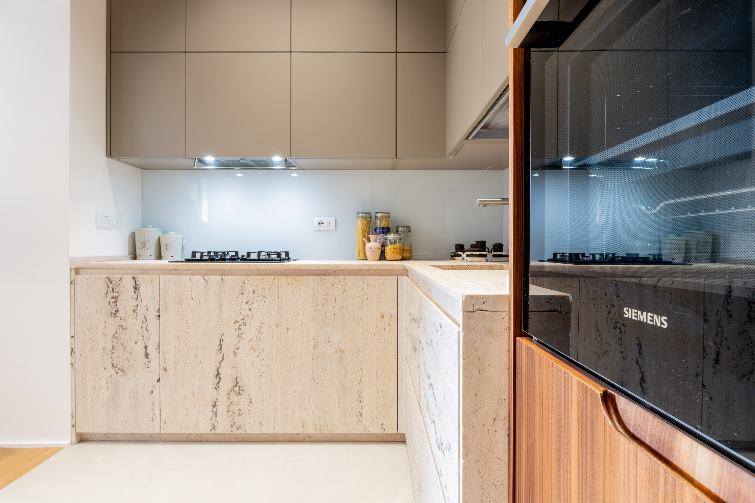 L’appartamento è in stile contemporaneo e abbiamo giocato con le contrapposizione non solo per gli elementi architettonici interni, ma anche con i materiali. Tutta la cucina, ad esempio, è rifinita in marmo massello a contrasto con elementi più classici della zona living. Anche il progetto illumino-tecnico ha tenuto conto delle caratteristiche storiche dell’immobile, visto che abbiamo soffitti alti oltre i 4 metri.