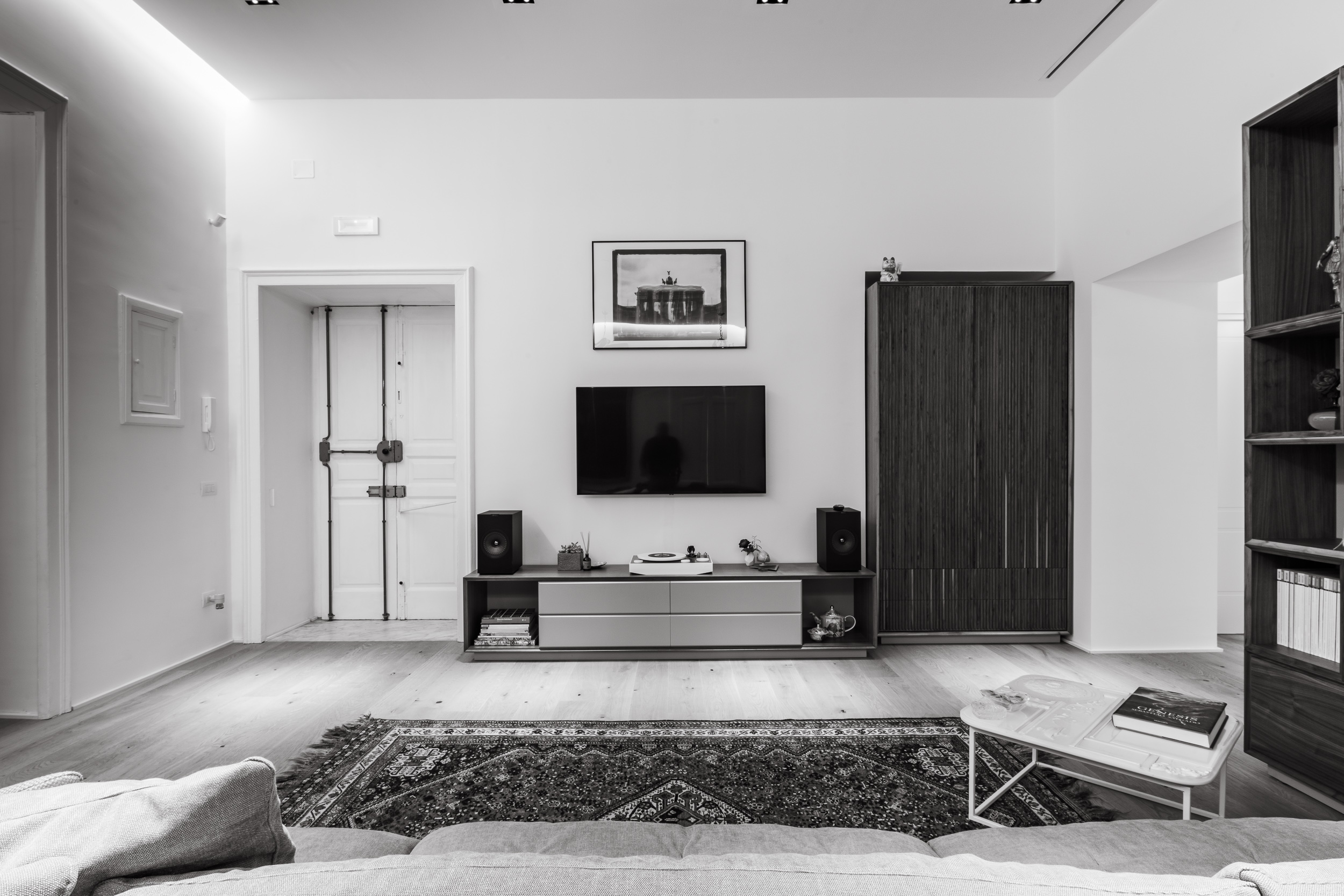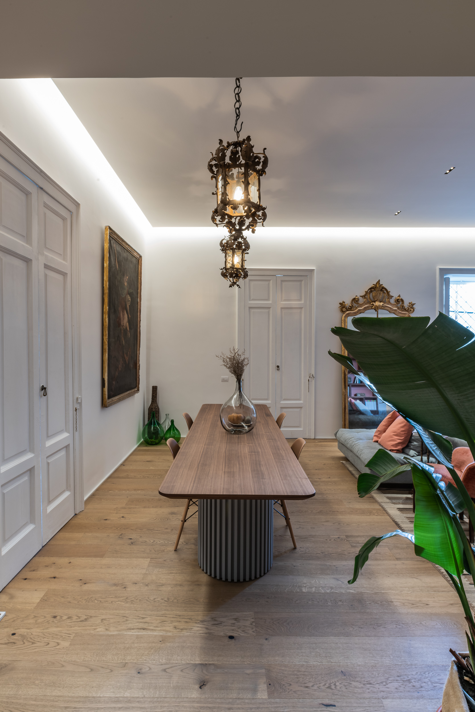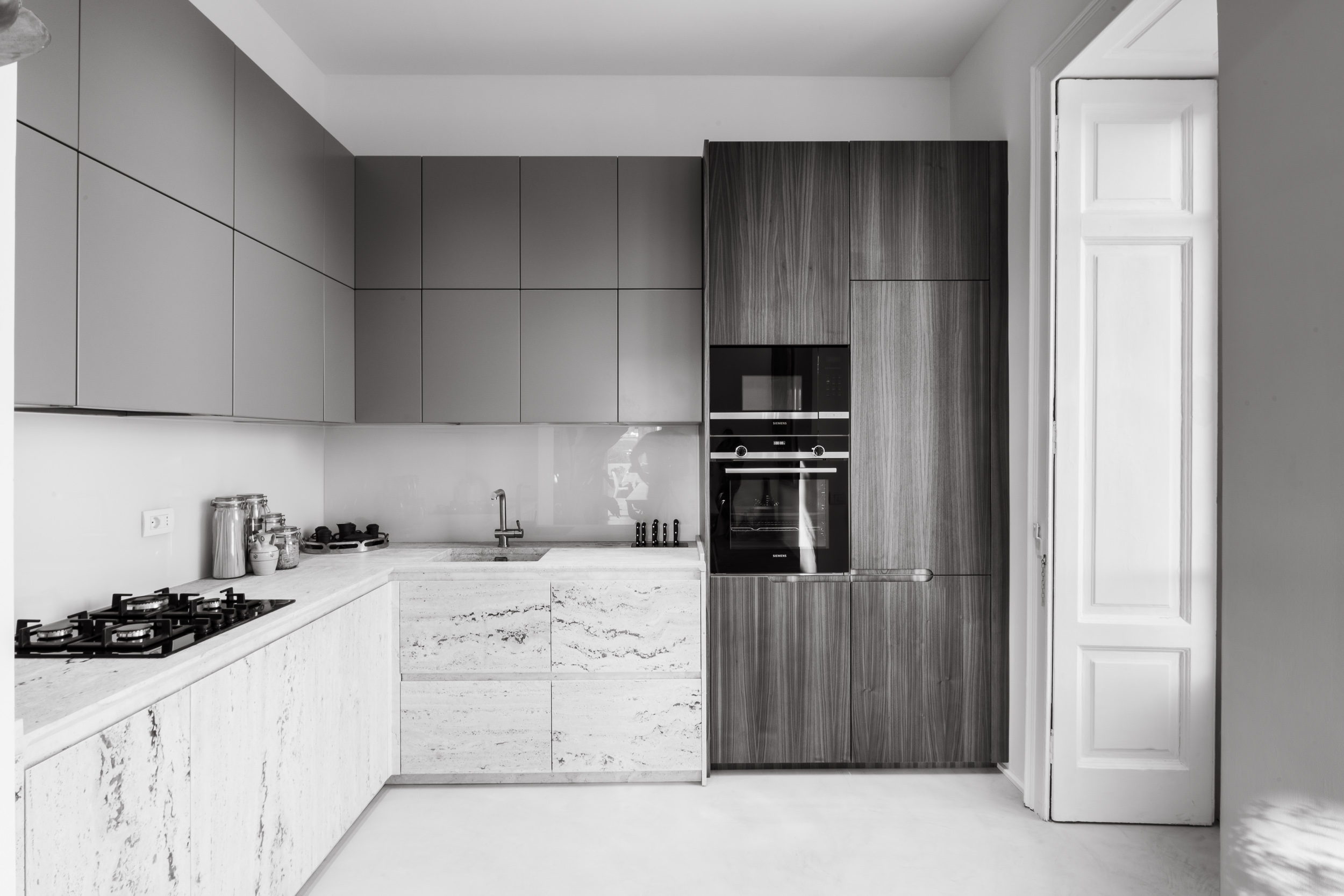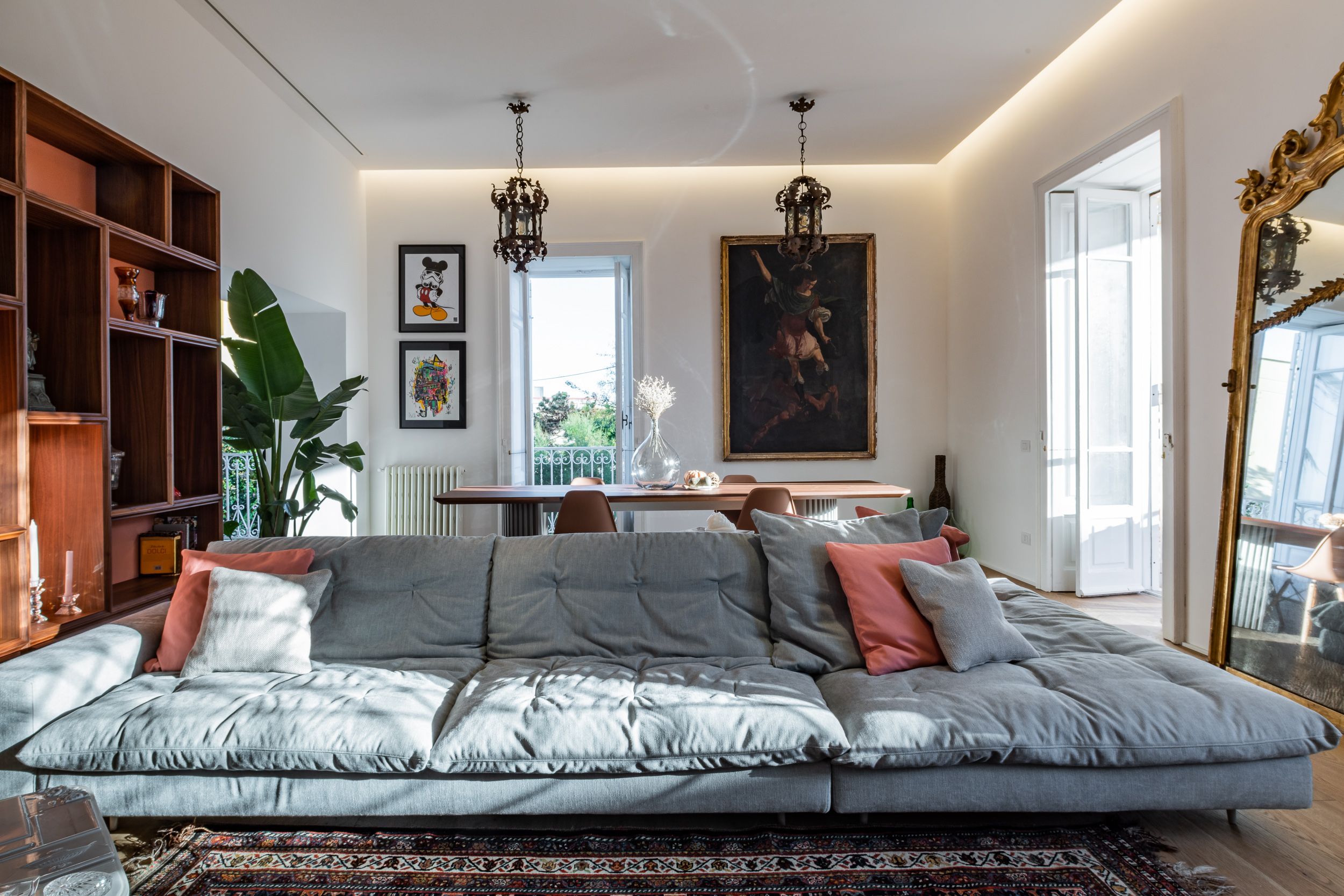 L’appartamento è in stile contemporaneo e abbiamo giocato con le contrapposizione non solo per gli elementi architettonici interni, ma anche con i materiali. Tutta la cucina, ad esempio, è rifinita in marmo massello a contrasto con elementi più classici della zona living. Anche il progetto illumino-tecnico ha tenuto conto delle caratteristiche storiche dell’immobile, visto che abbiamo soffitti alti oltre i 4 metri.