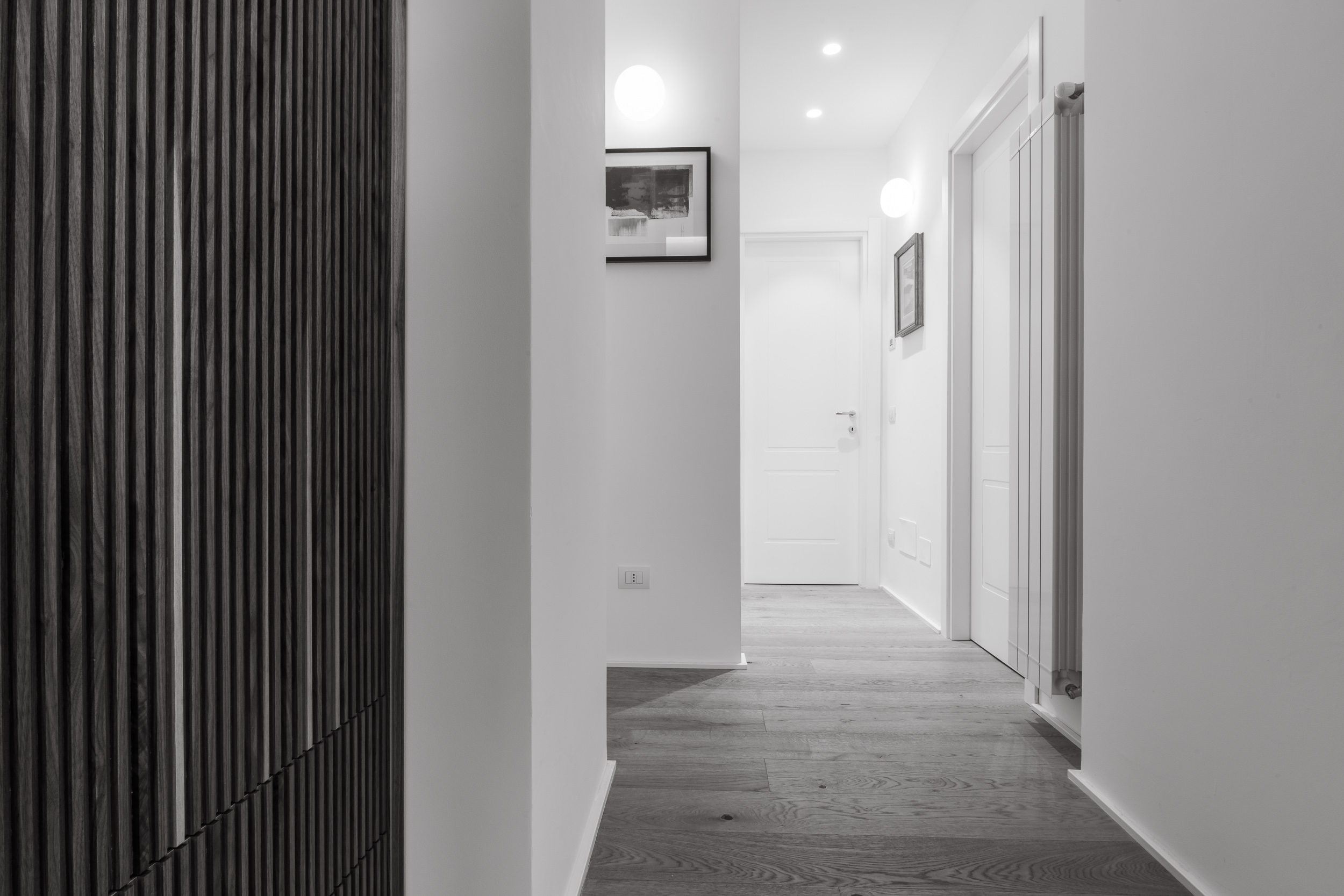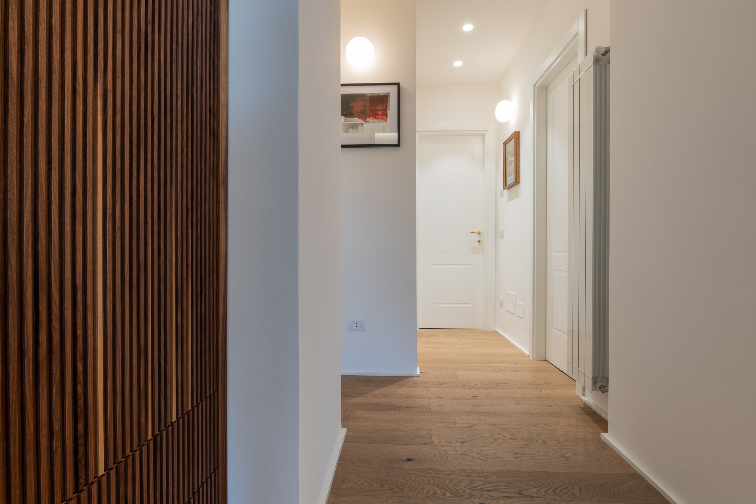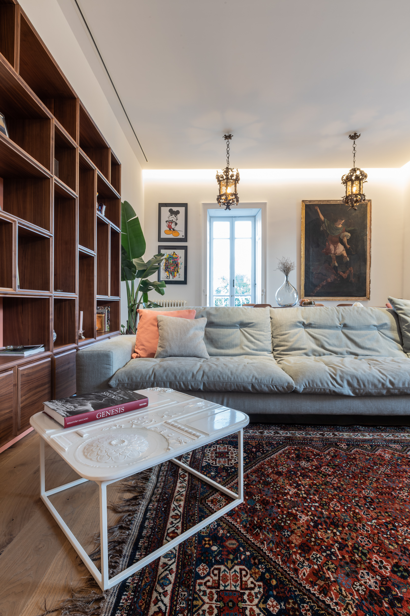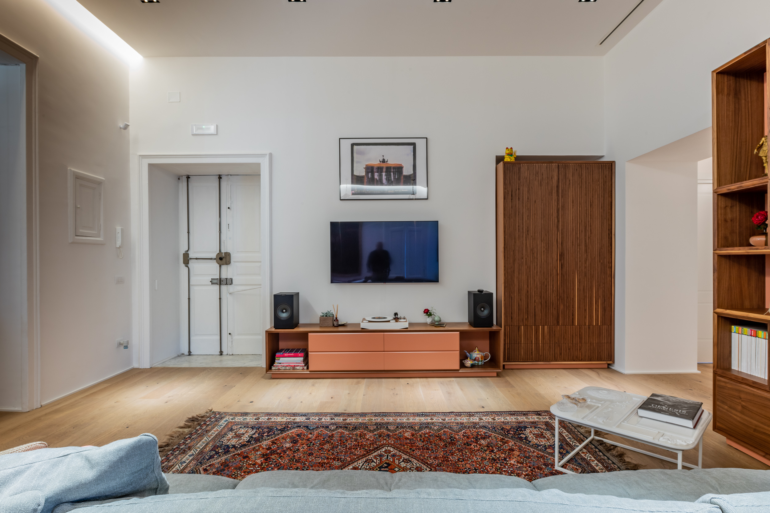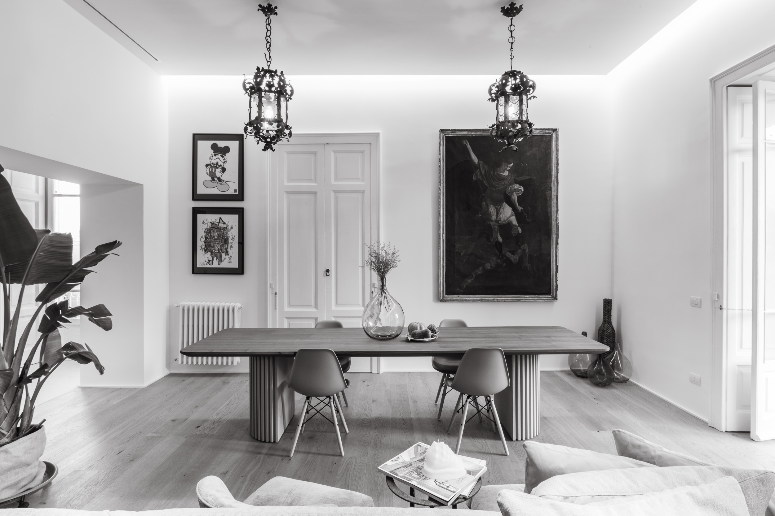 L’appartamento è in stile contemporaneo e abbiamo giocato con le contrapposizione non solo per gli elementi architettonici interni, ma anche con i materiali. Tutta la cucina, ad esempio, è rifinita in marmo massello a contrasto con elementi più classici della zona living. Anche il progetto illumino-tecnico ha tenuto conto delle caratteristiche storiche dell’immobile, visto che abbiamo soffitti alti oltre i 4 metri.