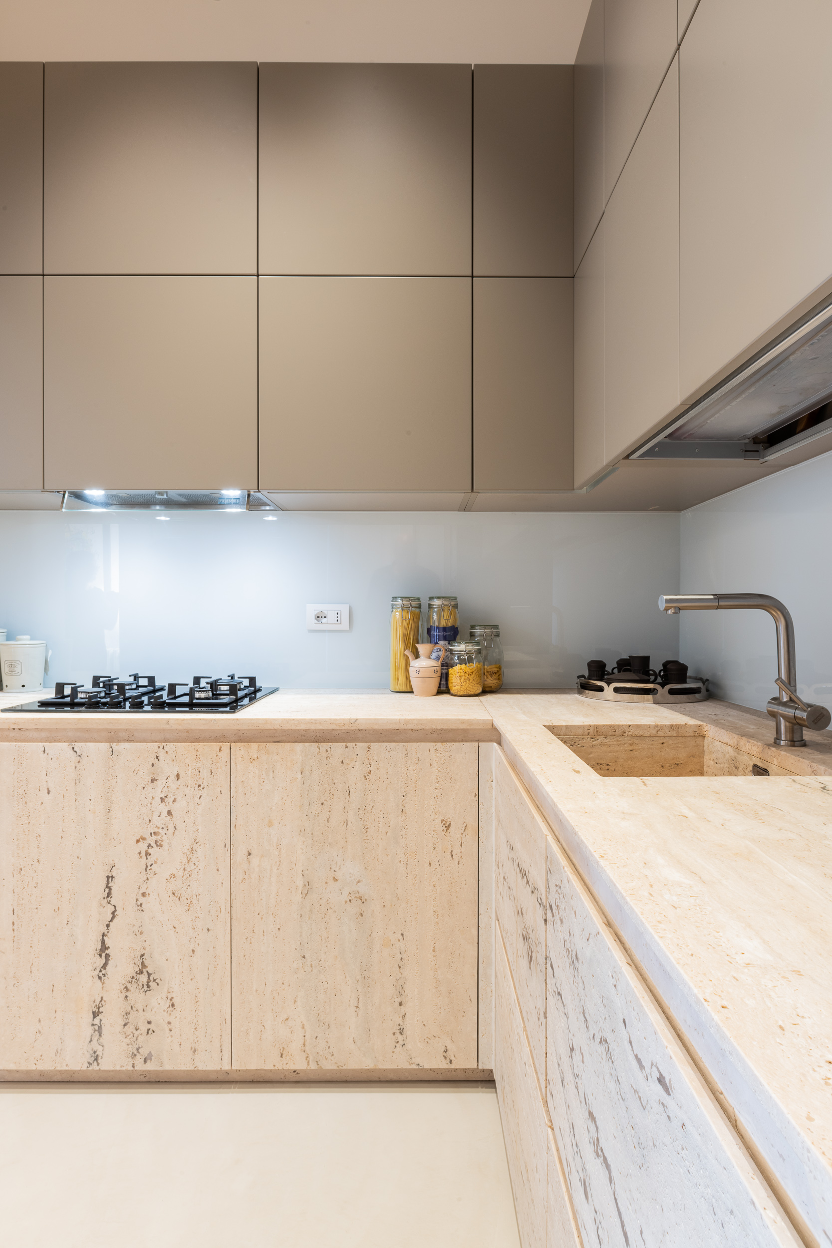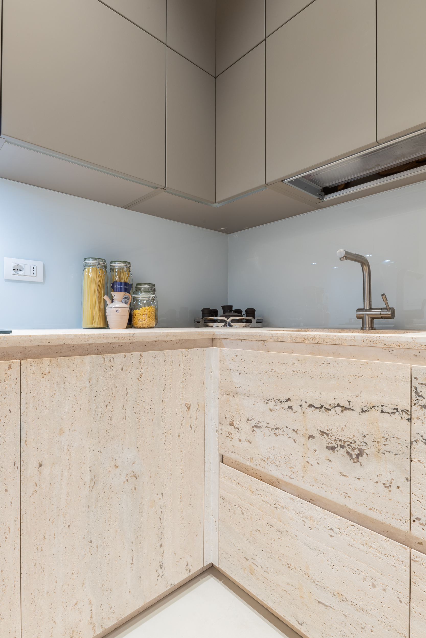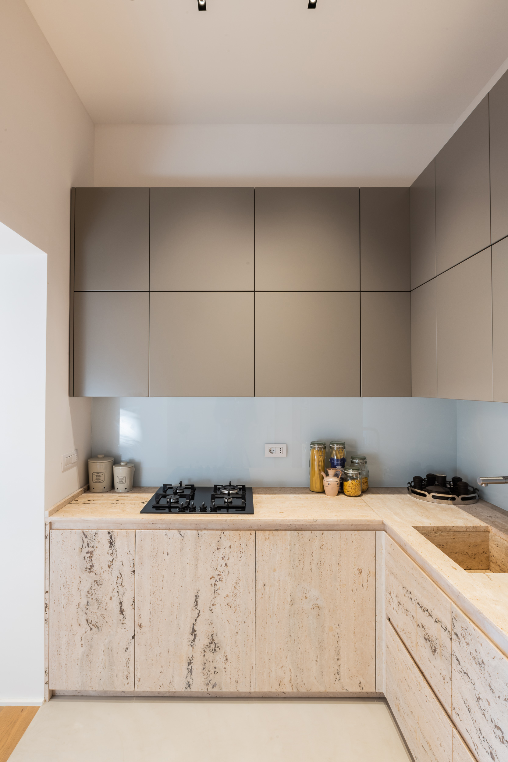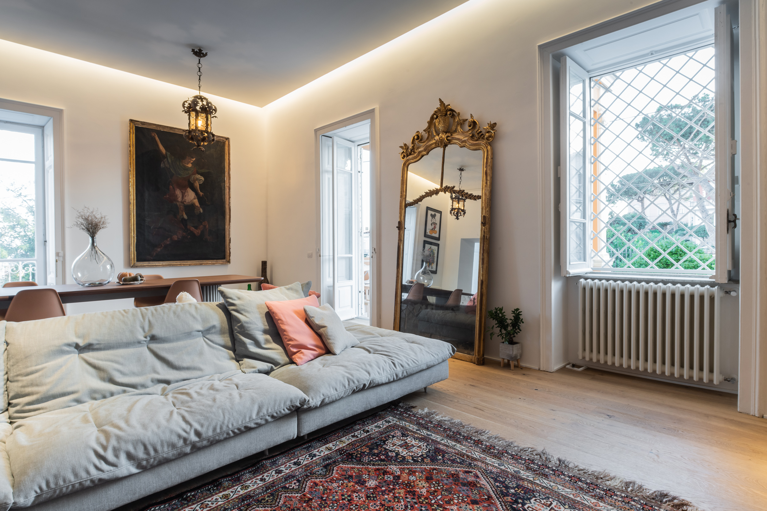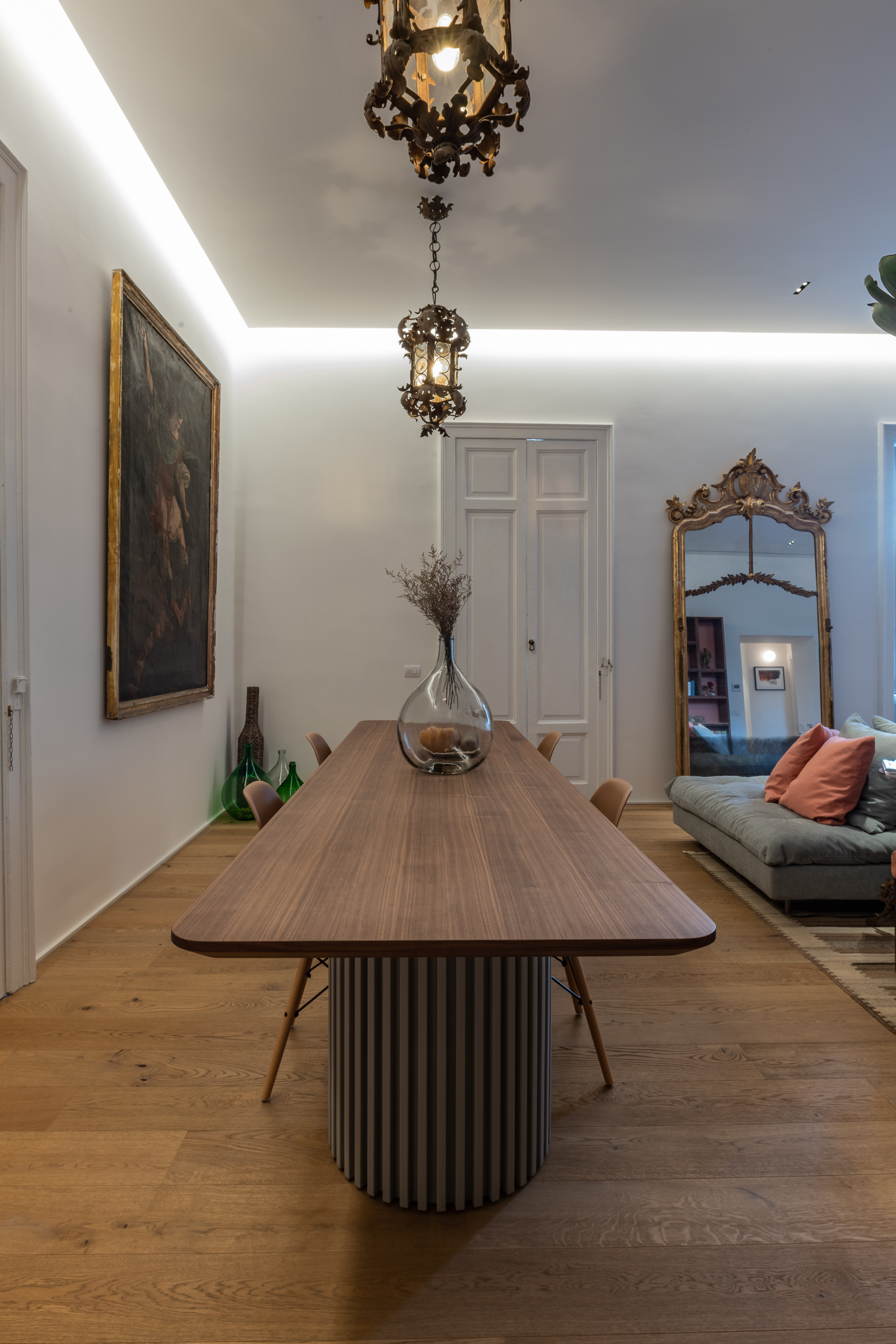 L’appartamento è in stile contemporaneo e abbiamo giocato con le contrapposizione non solo per gli elementi architettonici interni, ma anche con i materiali. Tutta la cucina, ad esempio, è rifinita in marmo massello a contrasto con elementi più classici della zona living. Anche il progetto illumino-tecnico ha tenuto conto delle caratteristiche storiche dell’immobile, visto che abbiamo soffitti alti oltre i 4 metri.
