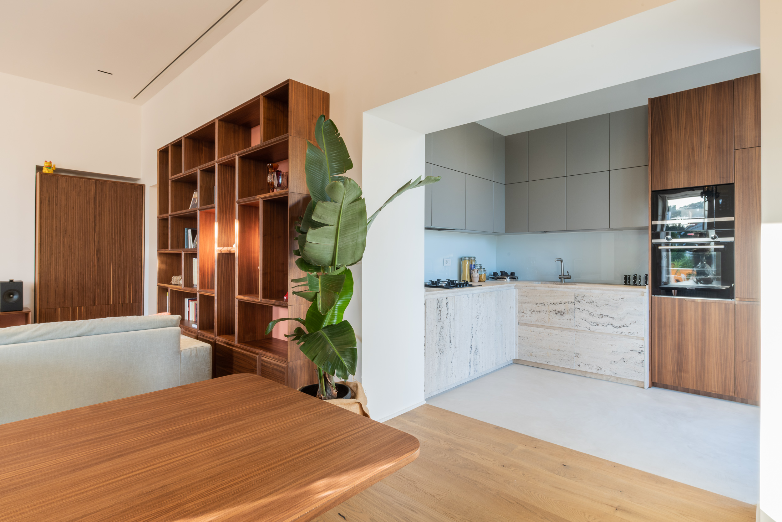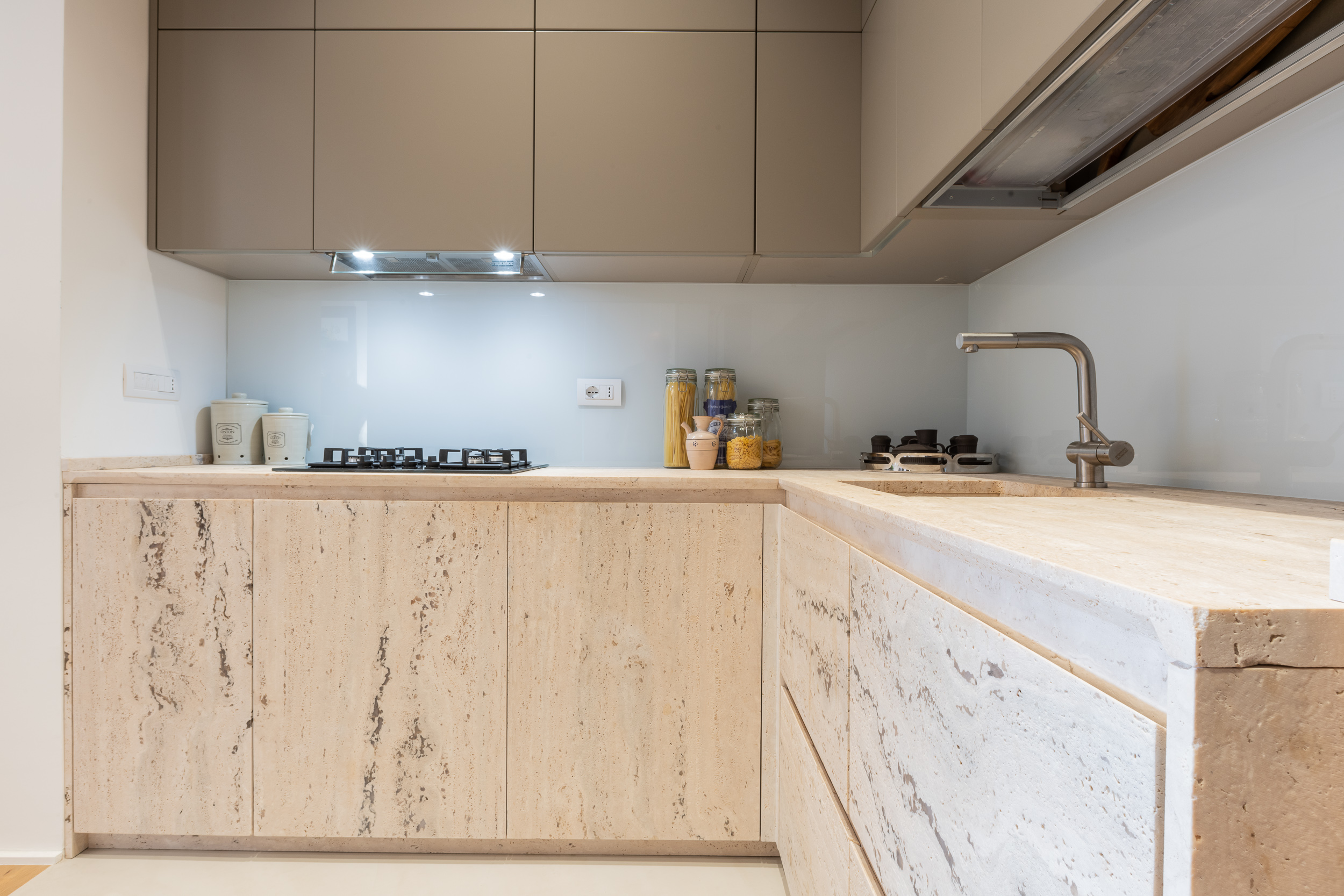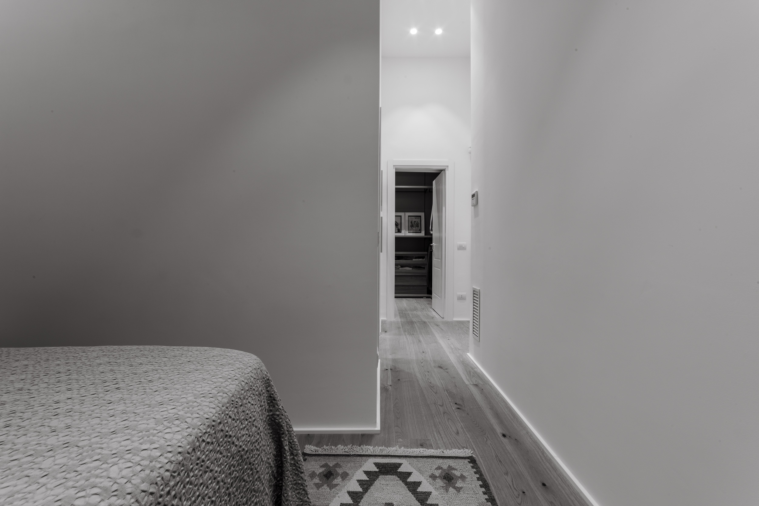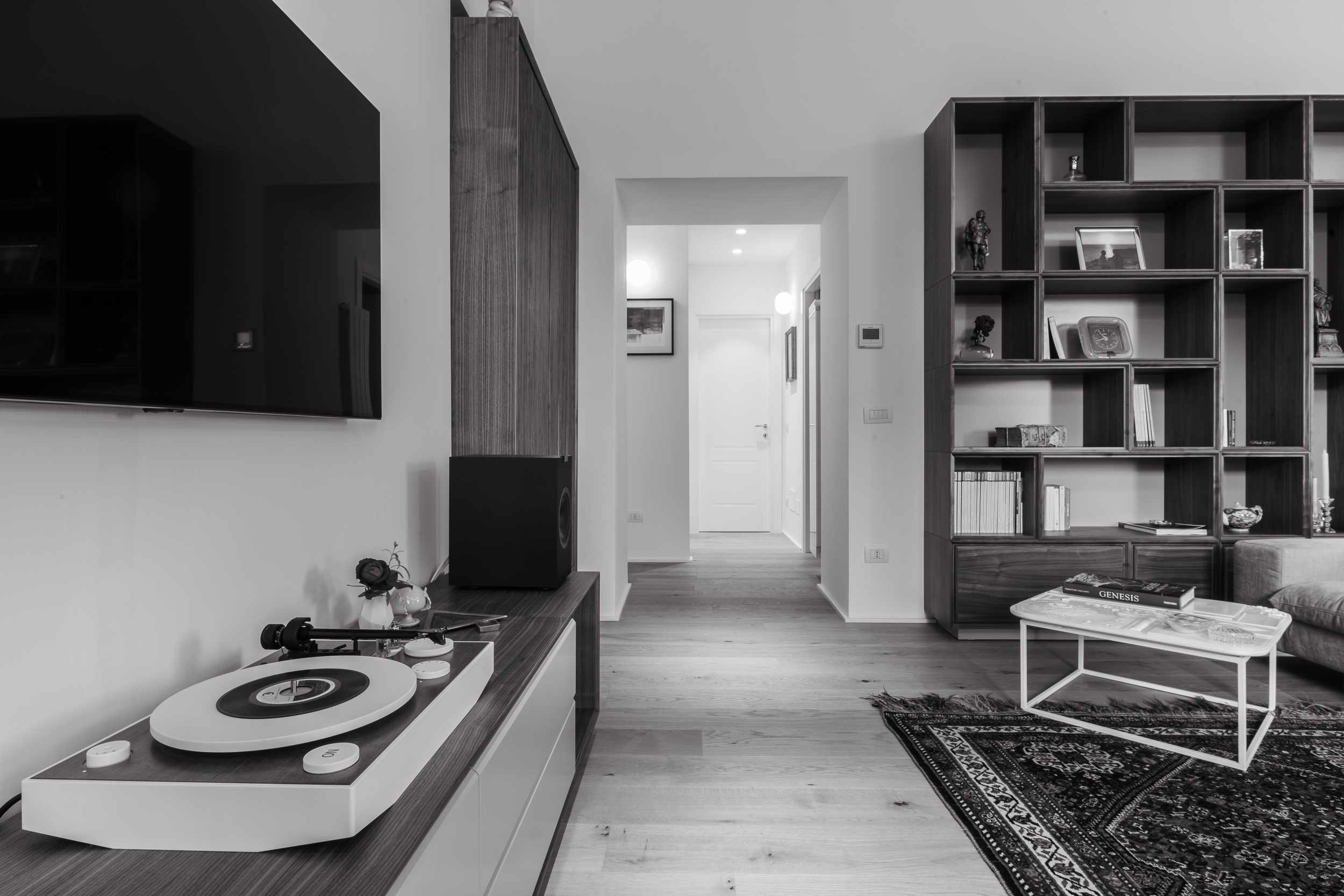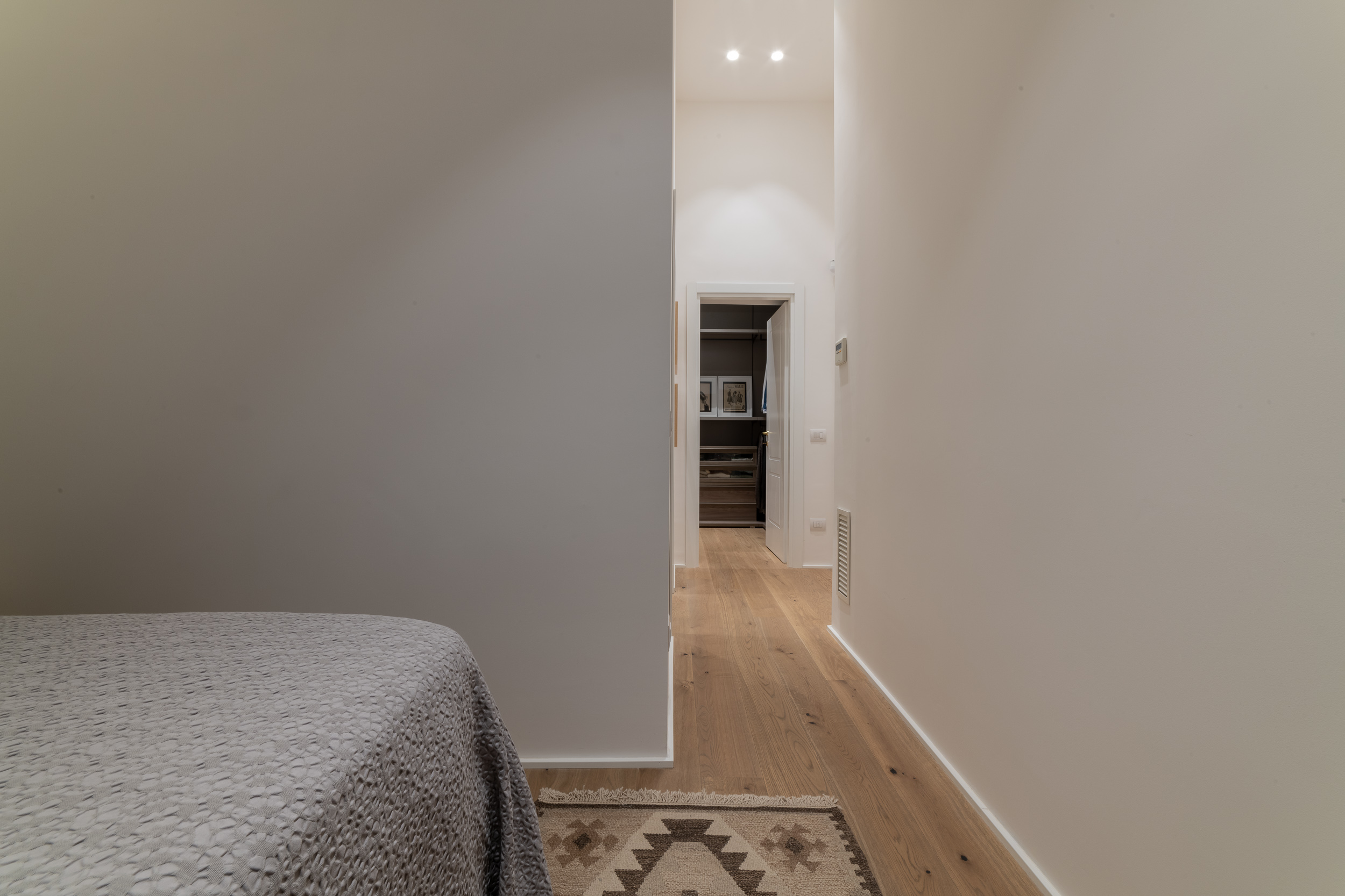 L’appartamento è in stile contemporaneo e abbiamo giocato con le contrapposizione non solo per gli elementi architettonici interni, ma anche con i materiali. Tutta la cucina, ad esempio, è rifinita in marmo massello a contrasto con elementi più classici della zona living. Anche il progetto illumino-tecnico ha tenuto conto delle caratteristiche storiche dell’immobile, visto che abbiamo soffitti alti oltre i 4 metri.