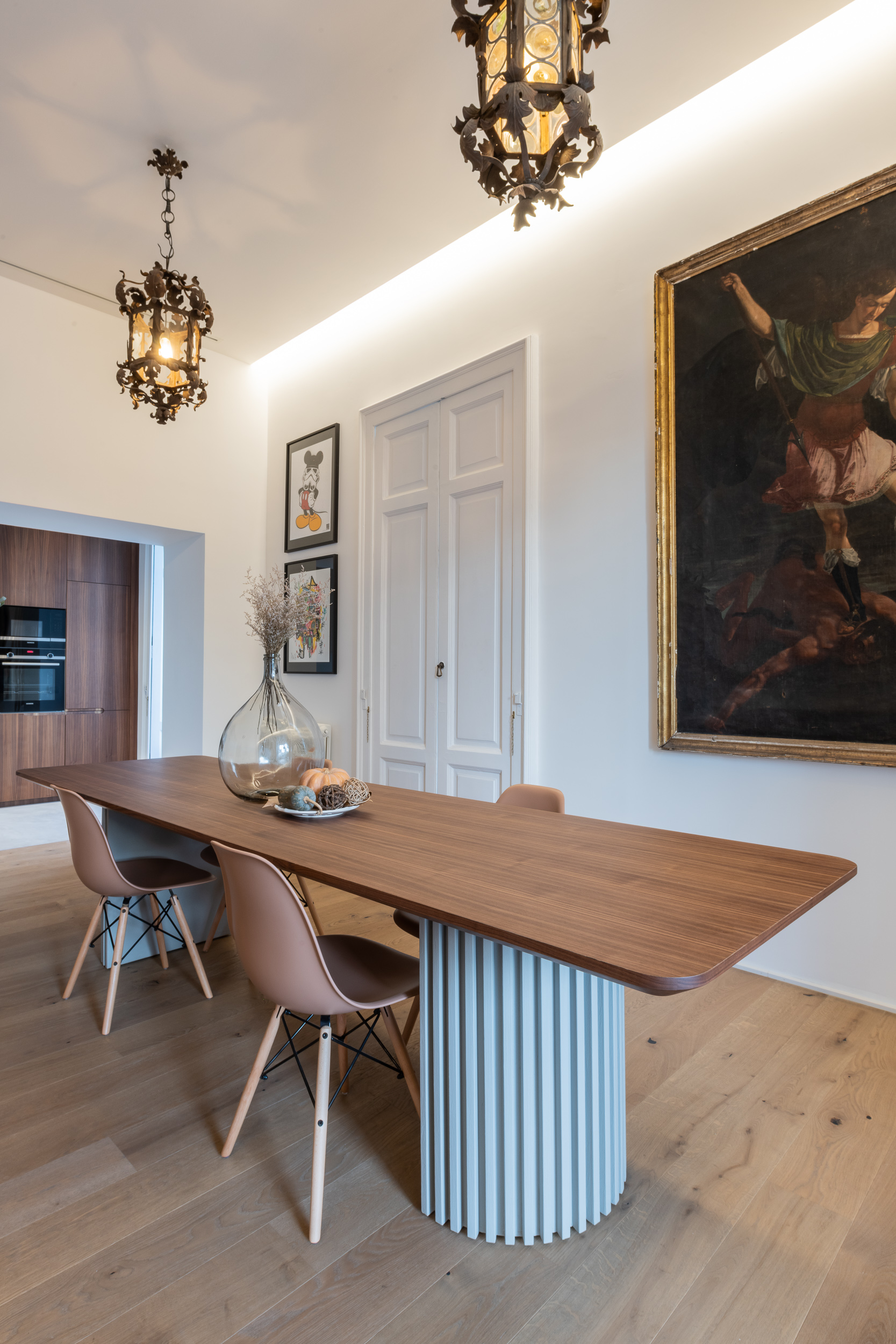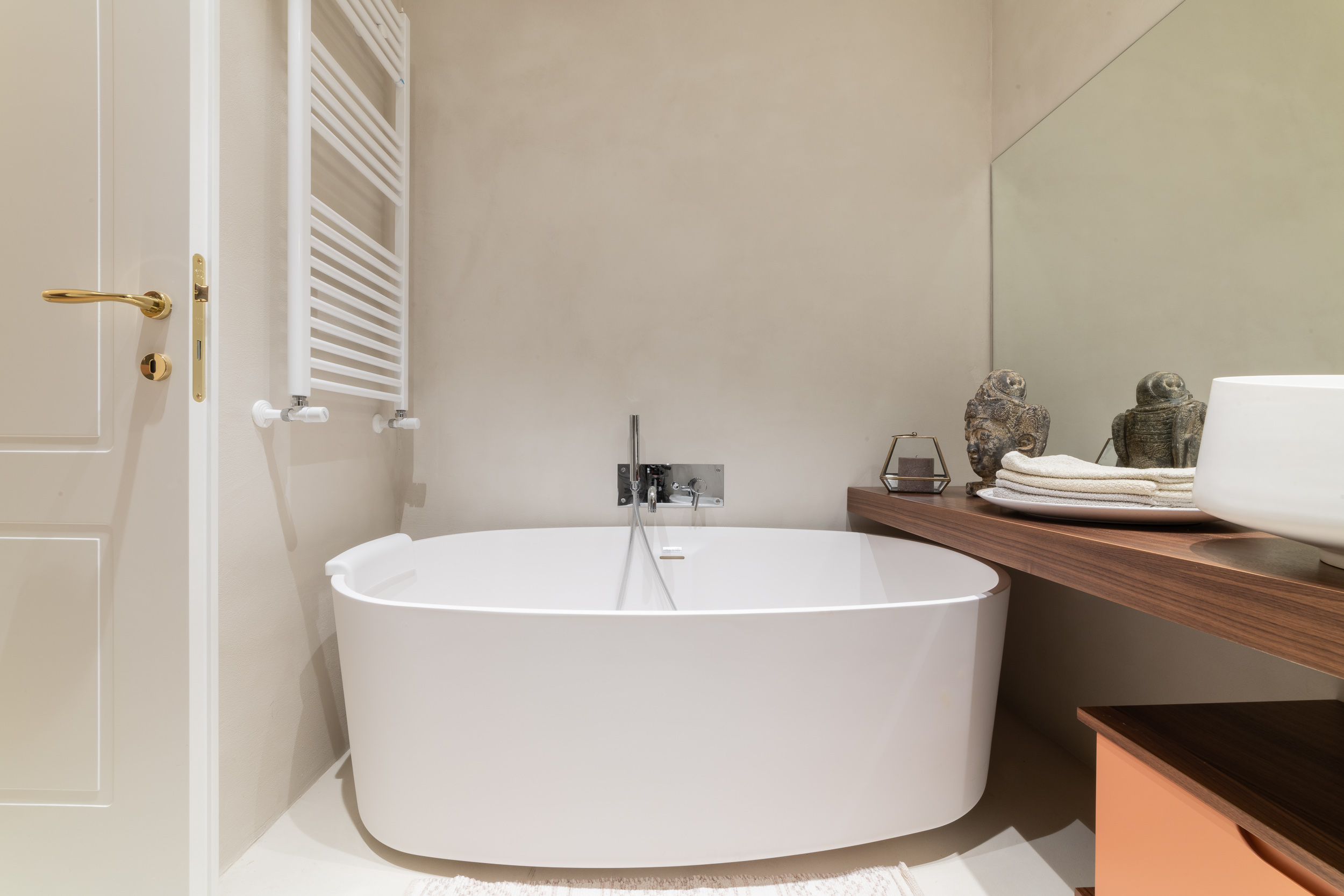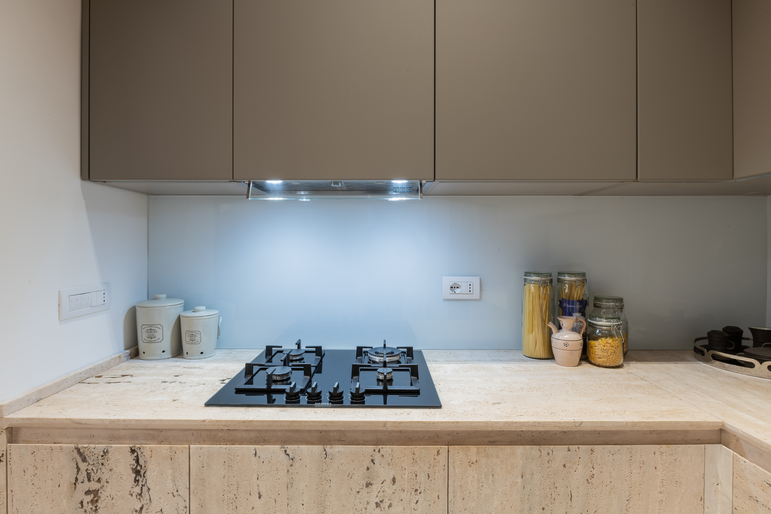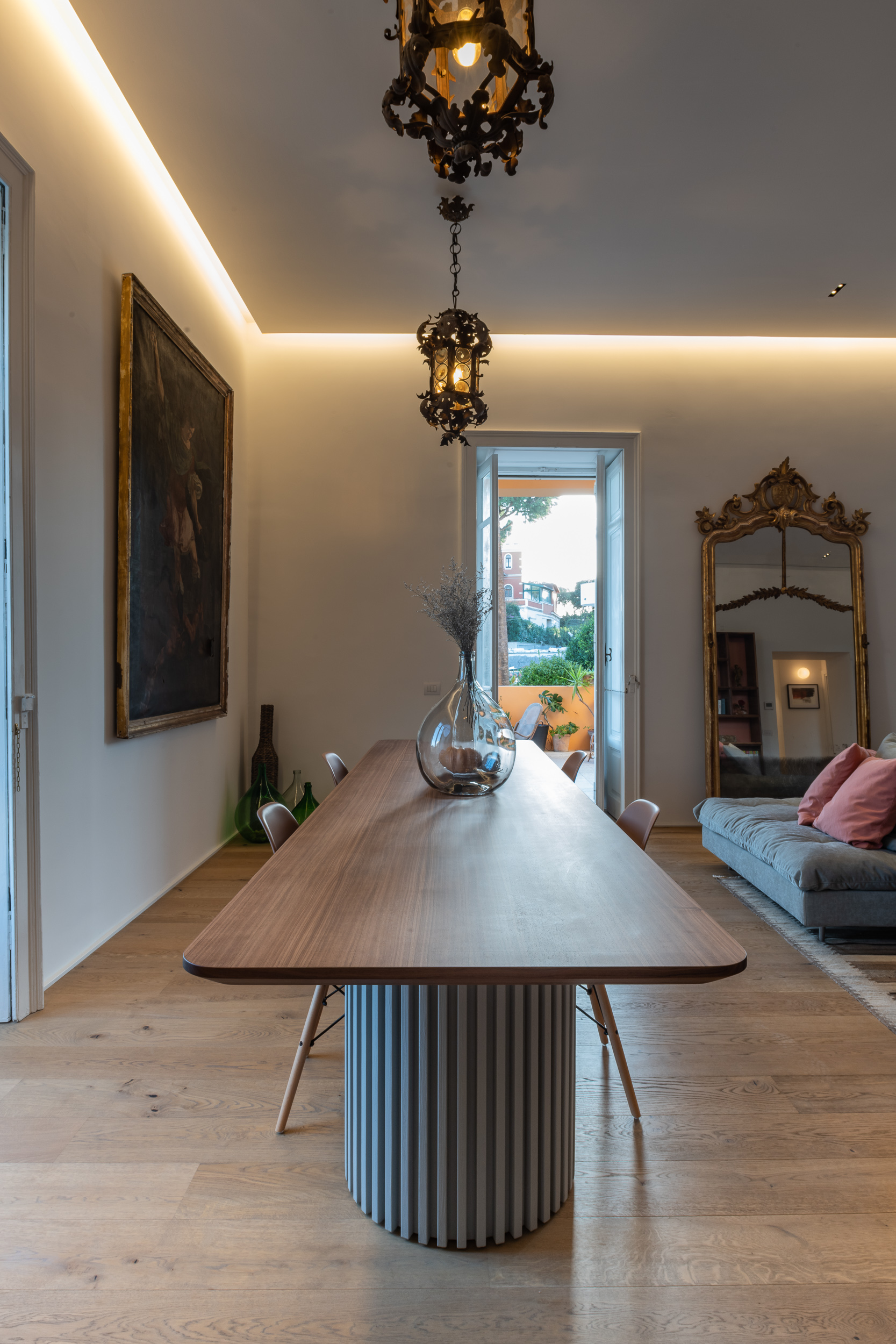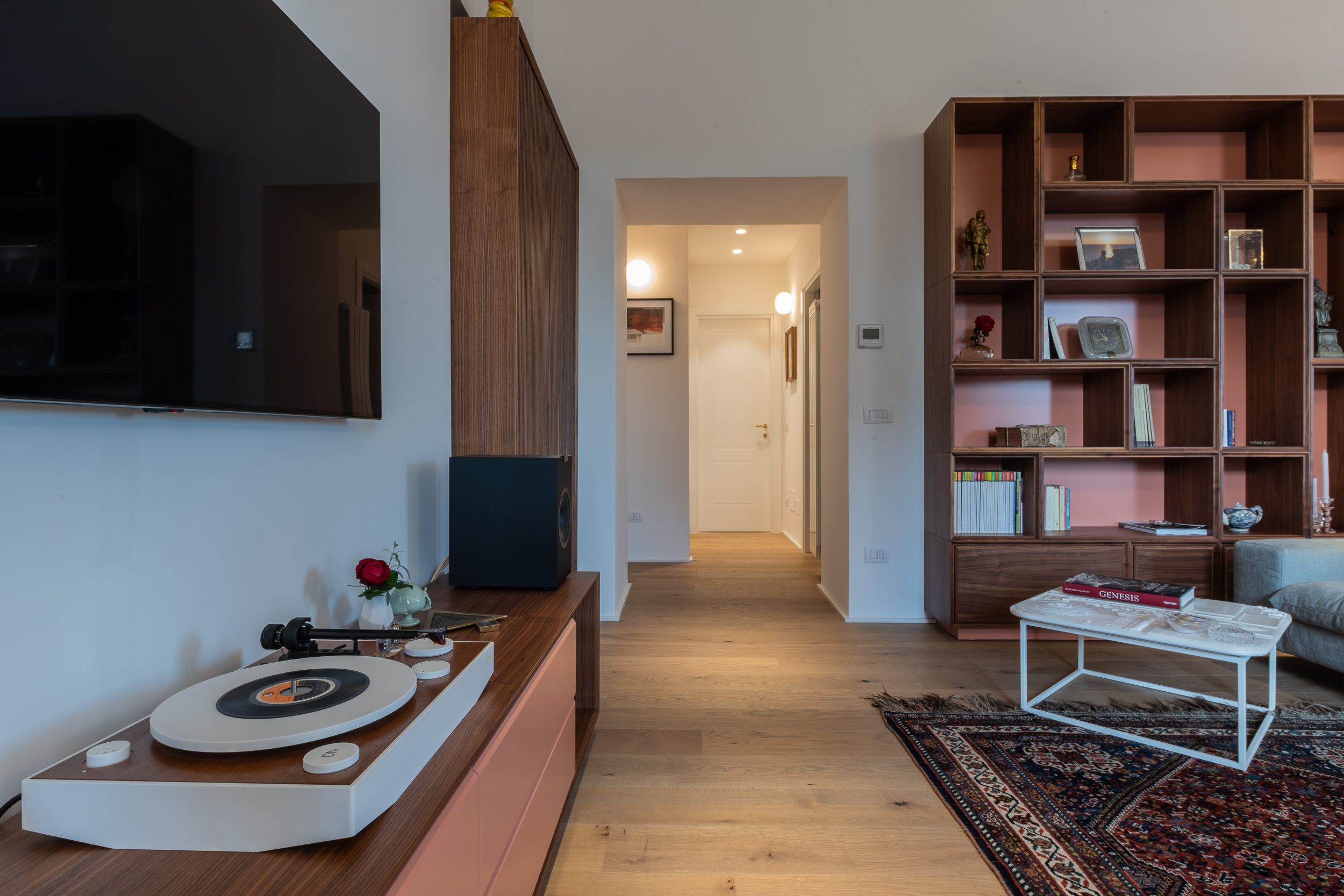 L’appartamento è in stile contemporaneo e abbiamo giocato con le contrapposizione non solo per gli elementi architettonici interni, ma anche con i materiali. Tutta la cucina, ad esempio, è rifinita in marmo massello a contrasto con elementi più classici della zona living. Anche il progetto illumino-tecnico ha tenuto conto delle caratteristiche storiche dell’immobile, visto che abbiamo soffitti alti oltre i 4 metri.