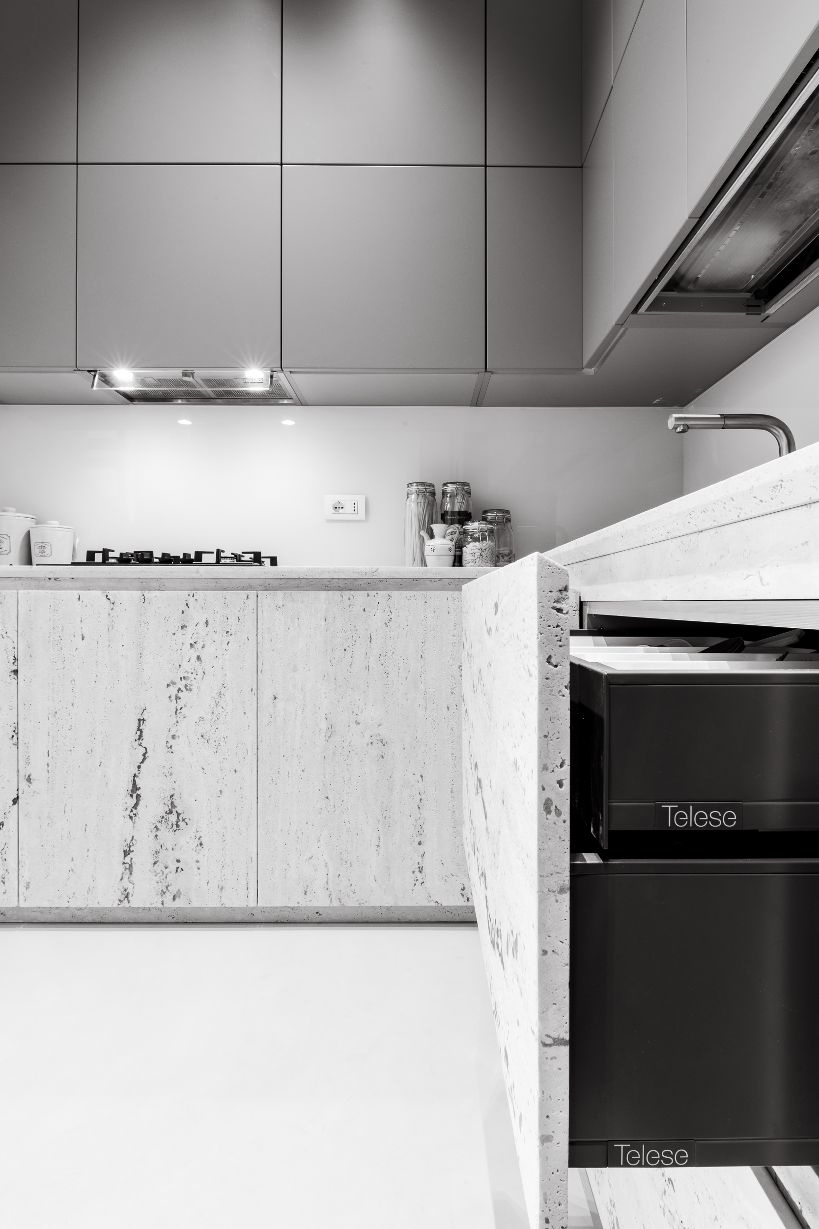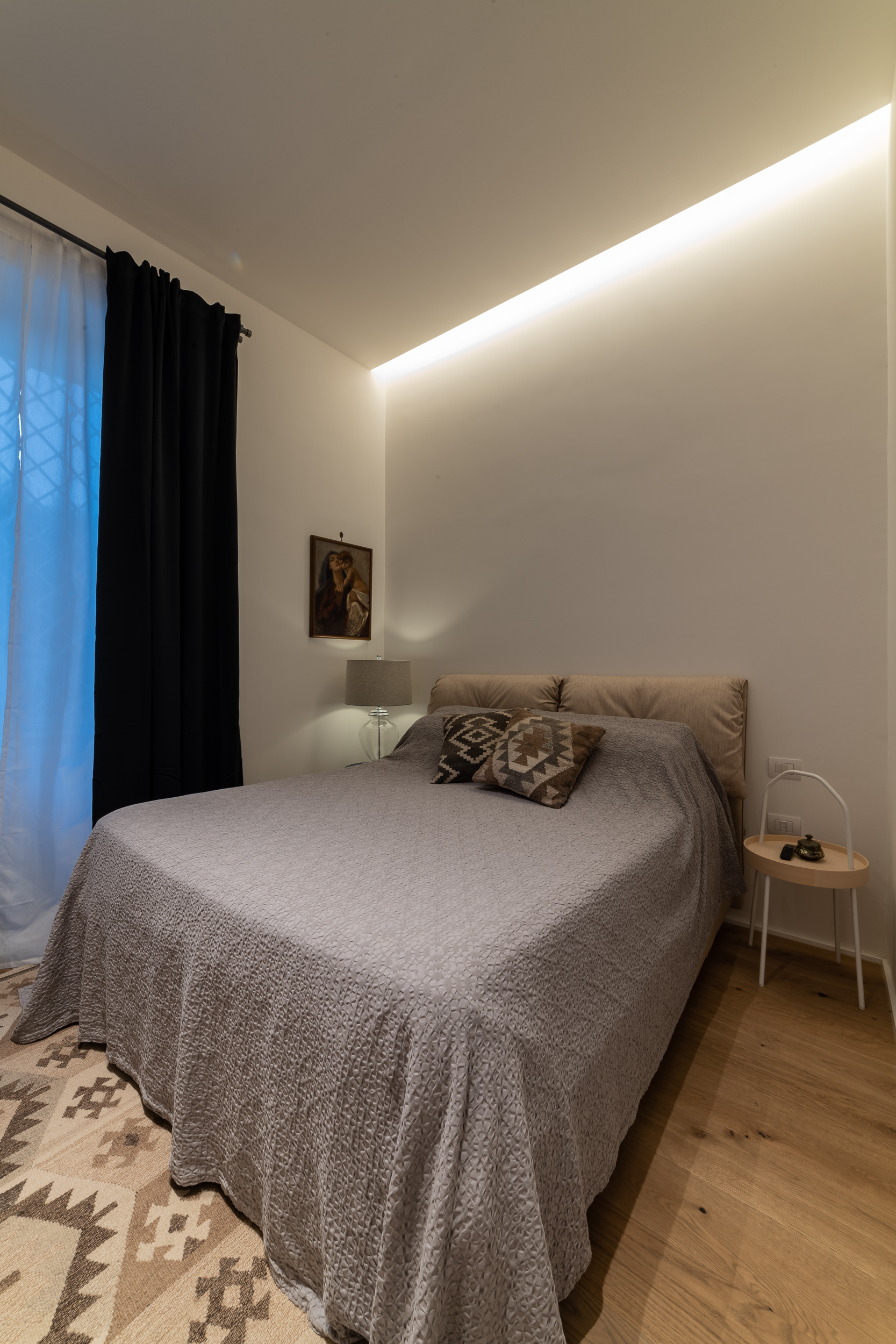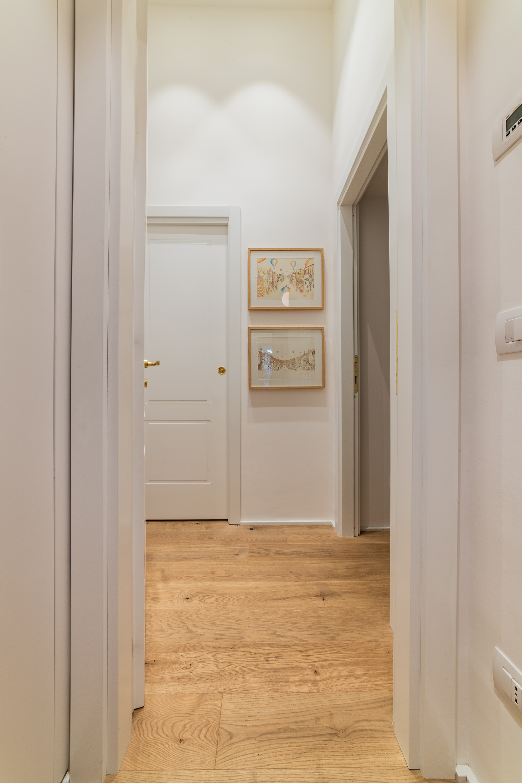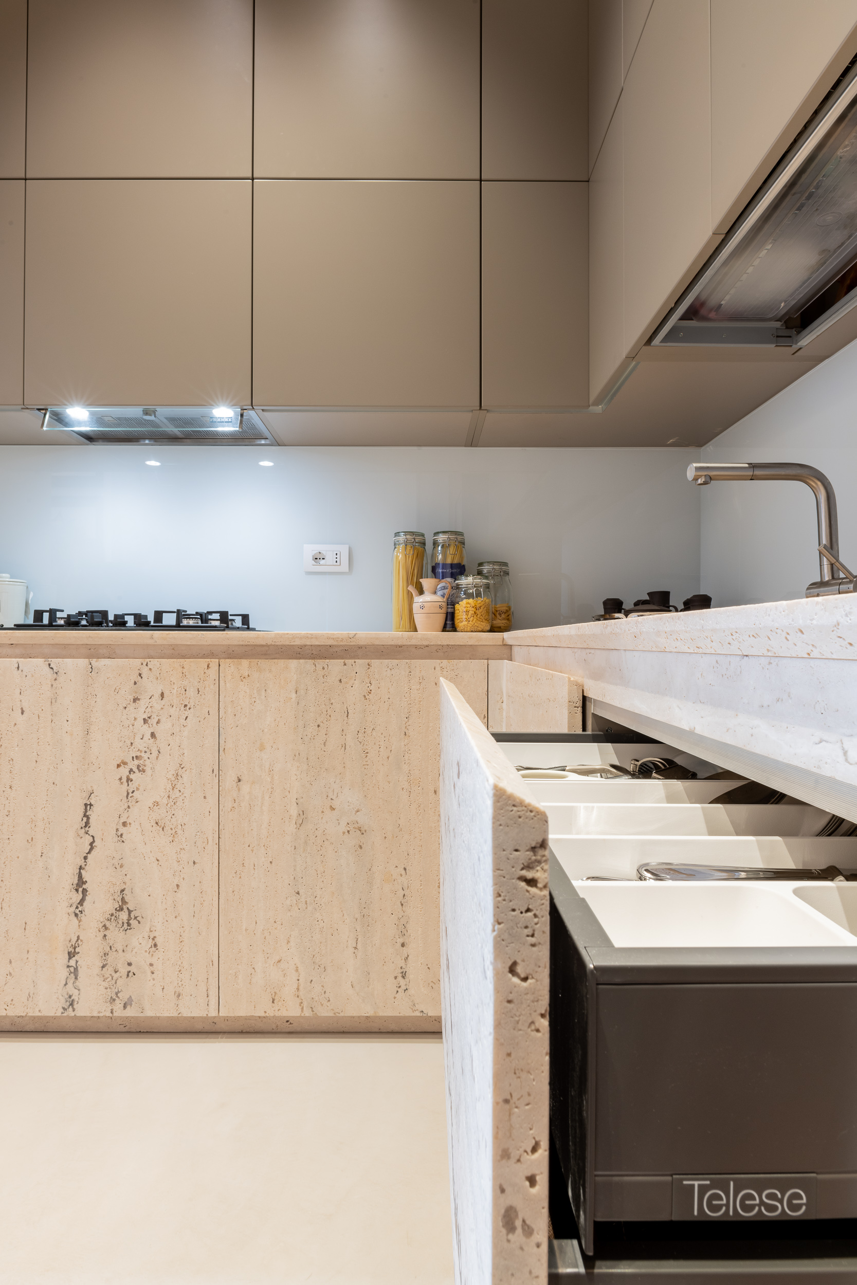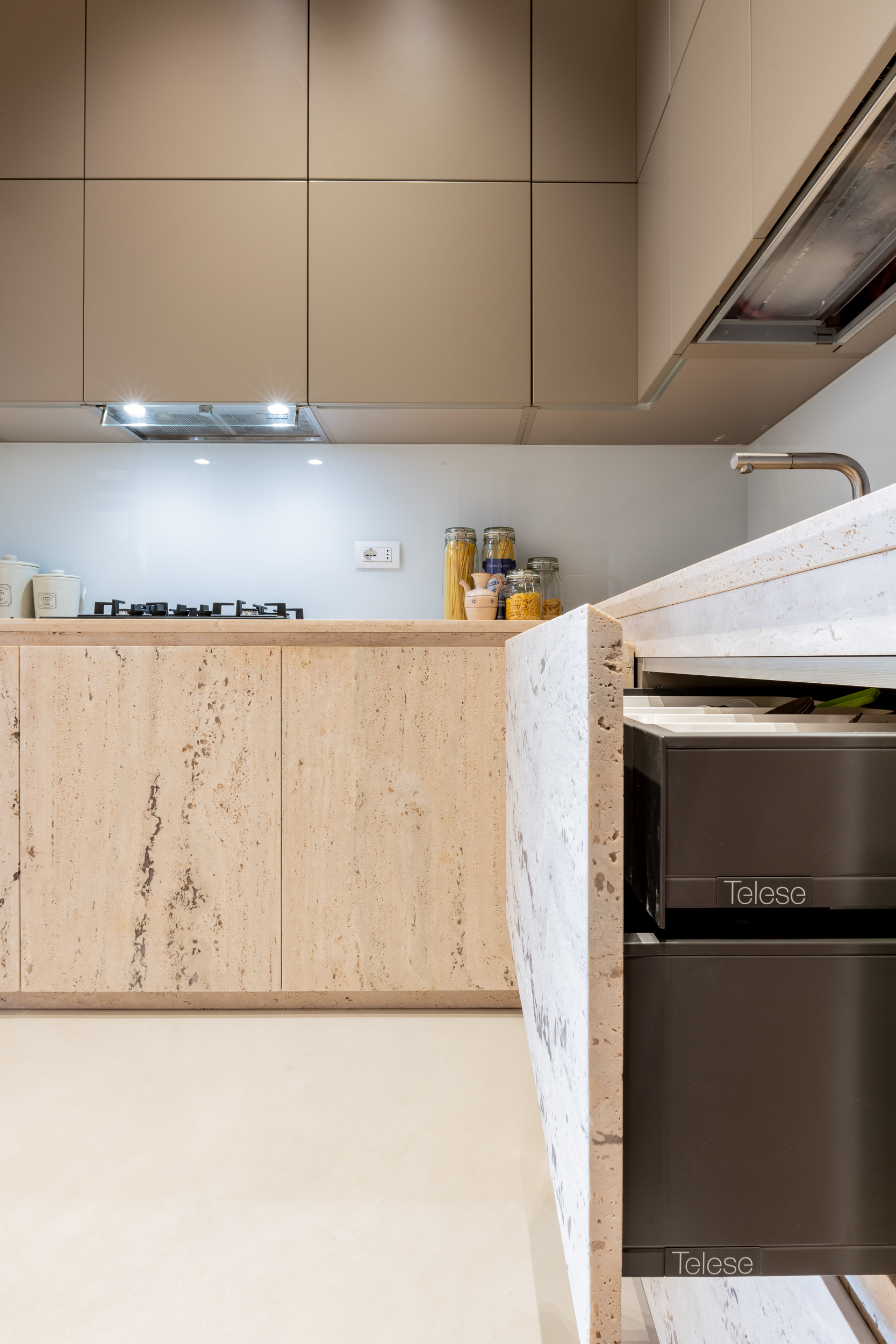 L’appartamento è in stile contemporaneo e abbiamo giocato con le contrapposizione non solo per gli elementi architettonici interni, ma anche con i materiali. Tutta la cucina, ad esempio, è rifinita in marmo massello a contrasto con elementi più classici della zona living. Anche il progetto illumino-tecnico ha tenuto conto delle caratteristiche storiche dell’immobile, visto che abbiamo soffitti alti oltre i 4 metri.