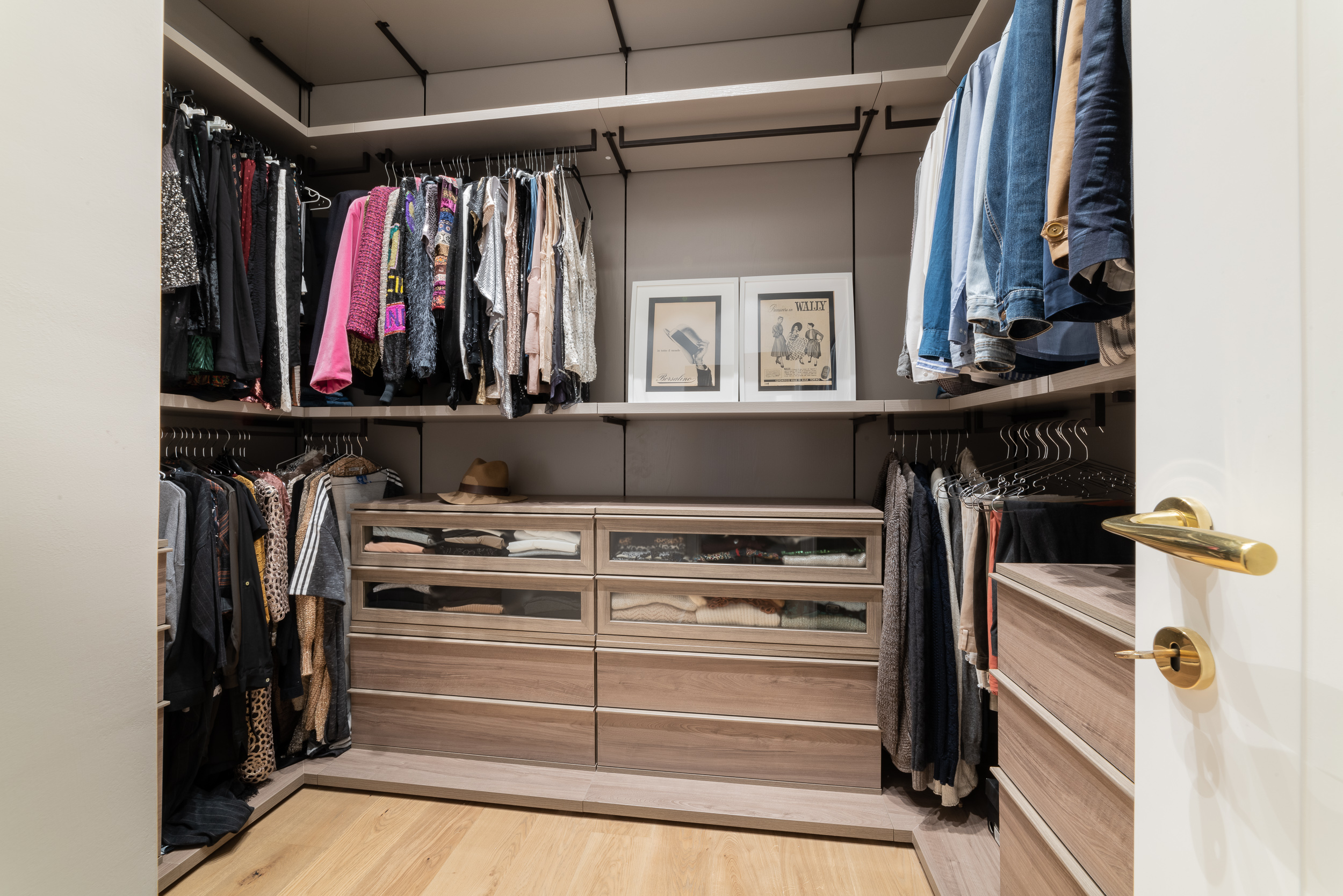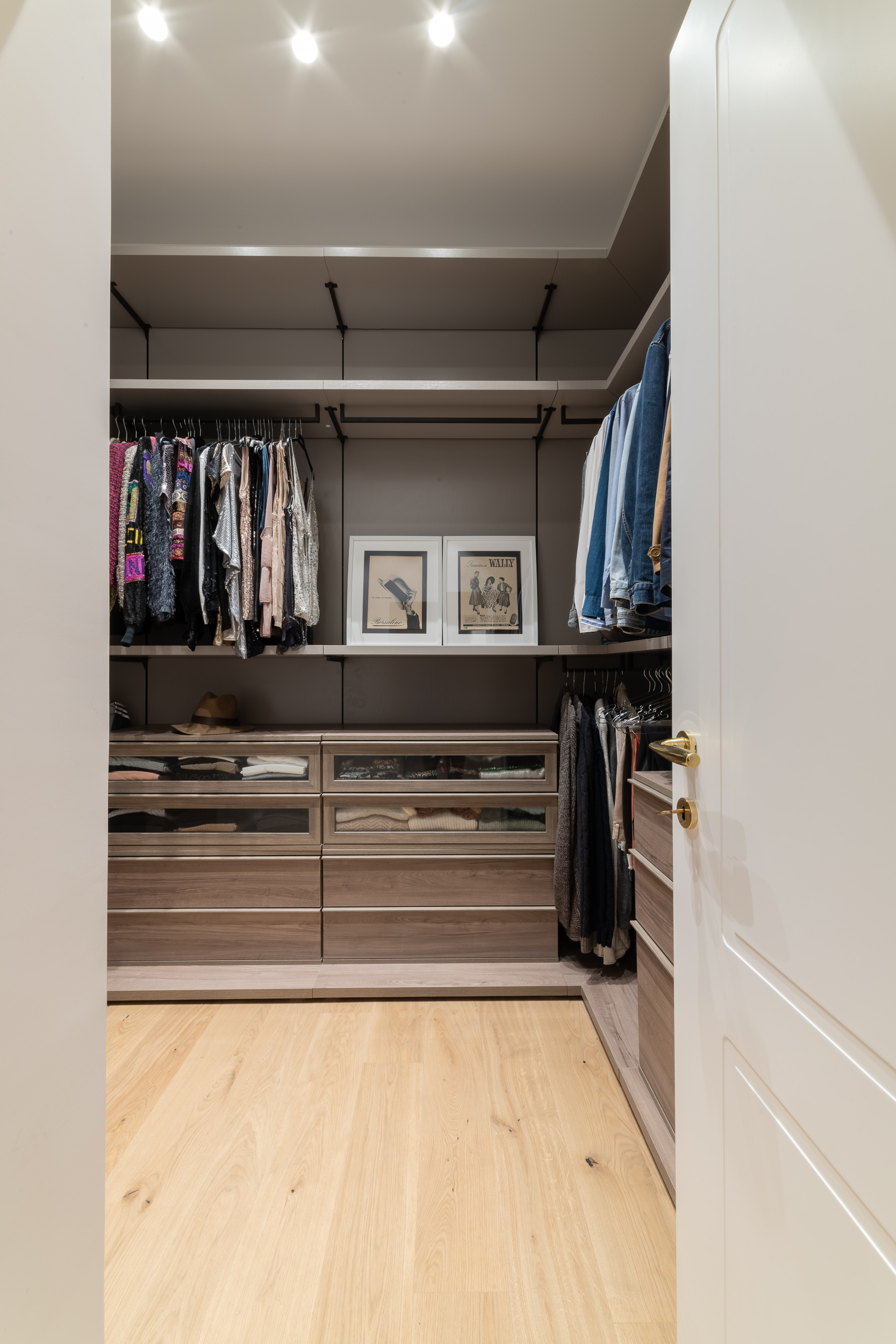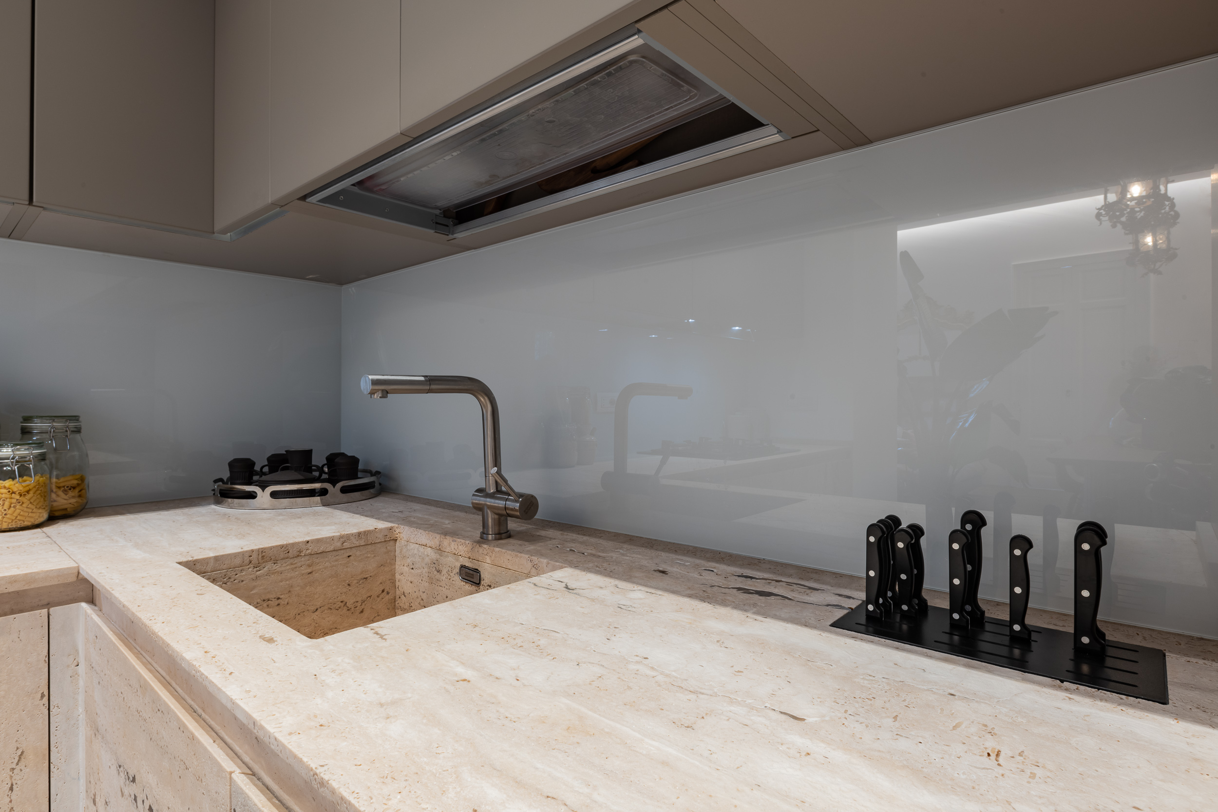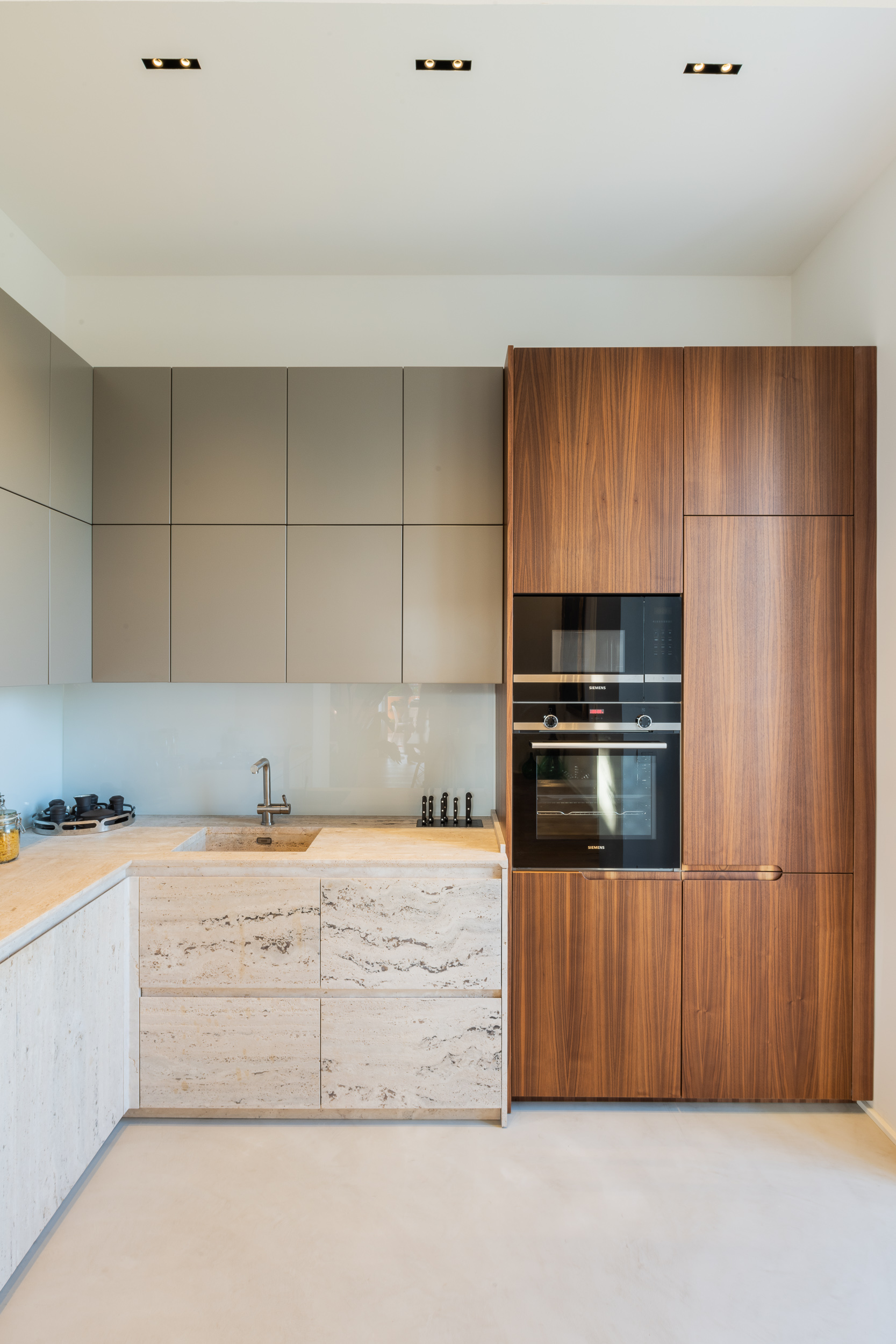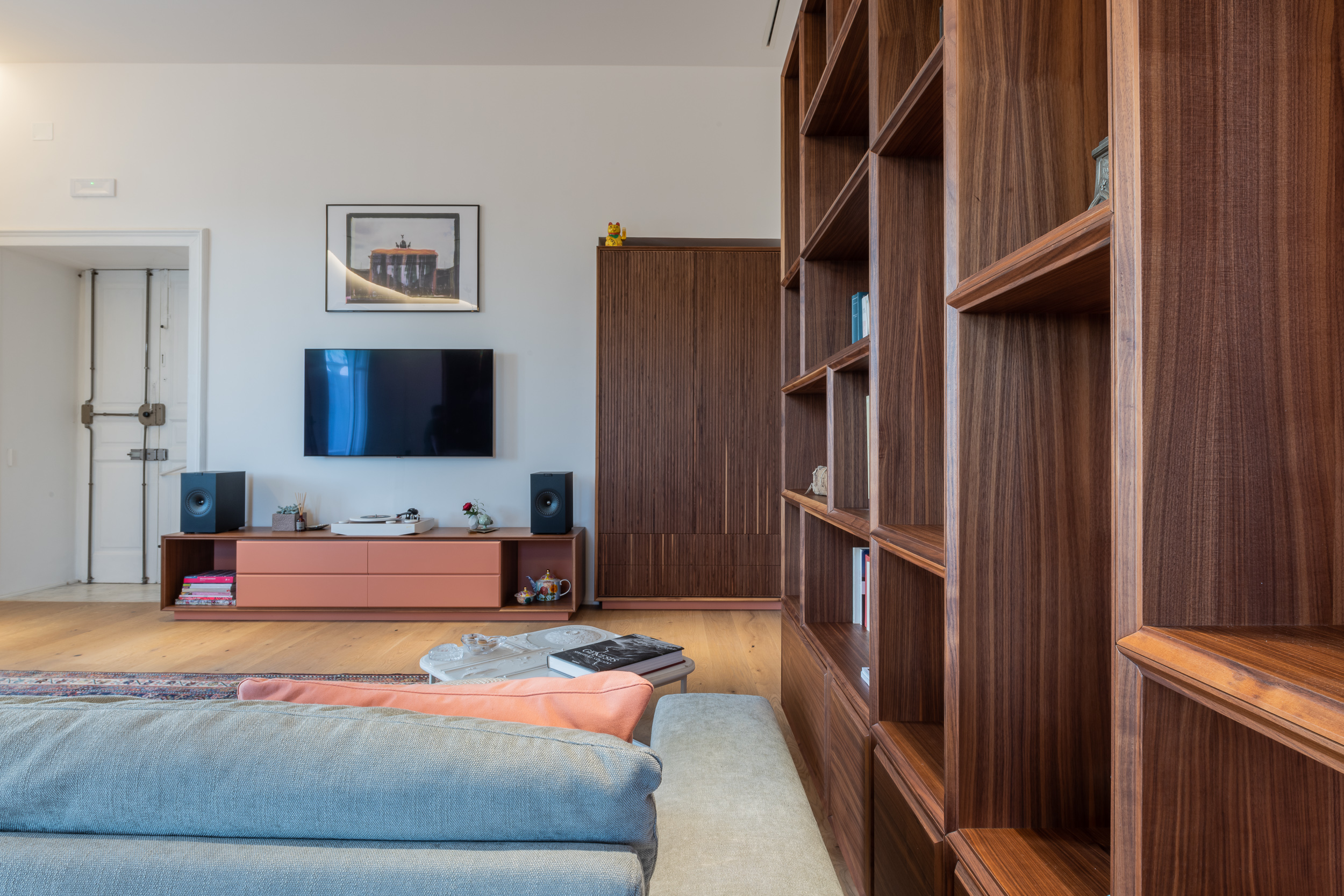 L’appartamento è in stile contemporaneo e abbiamo giocato con le contrapposizione non solo per gli elementi architettonici interni, ma anche con i materiali. Tutta la cucina, ad esempio, è rifinita in marmo massello a contrasto con elementi più classici della zona living. Anche il progetto illumino-tecnico ha tenuto conto delle caratteristiche storiche dell’immobile, visto che abbiamo soffitti alti oltre i 4 metri.