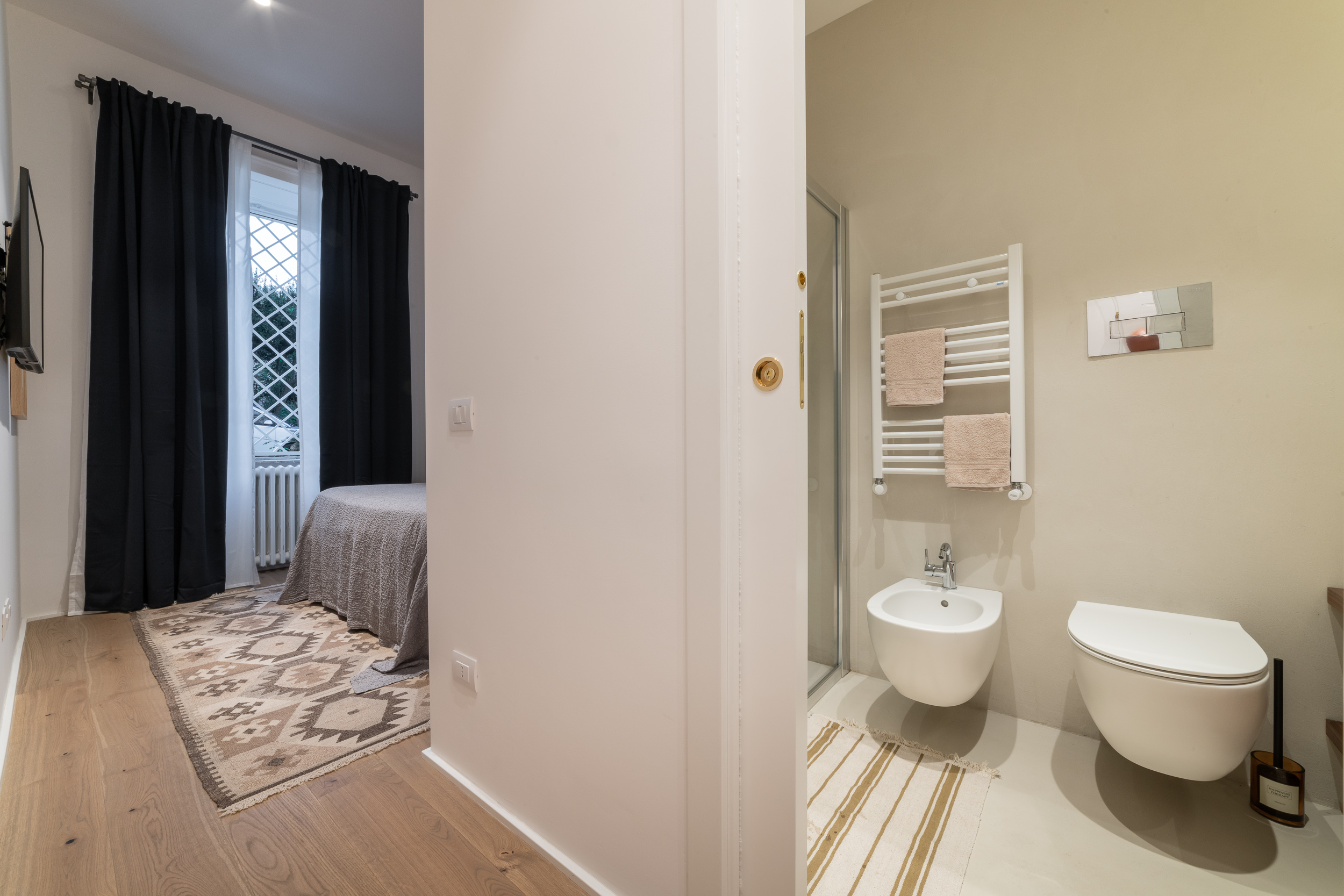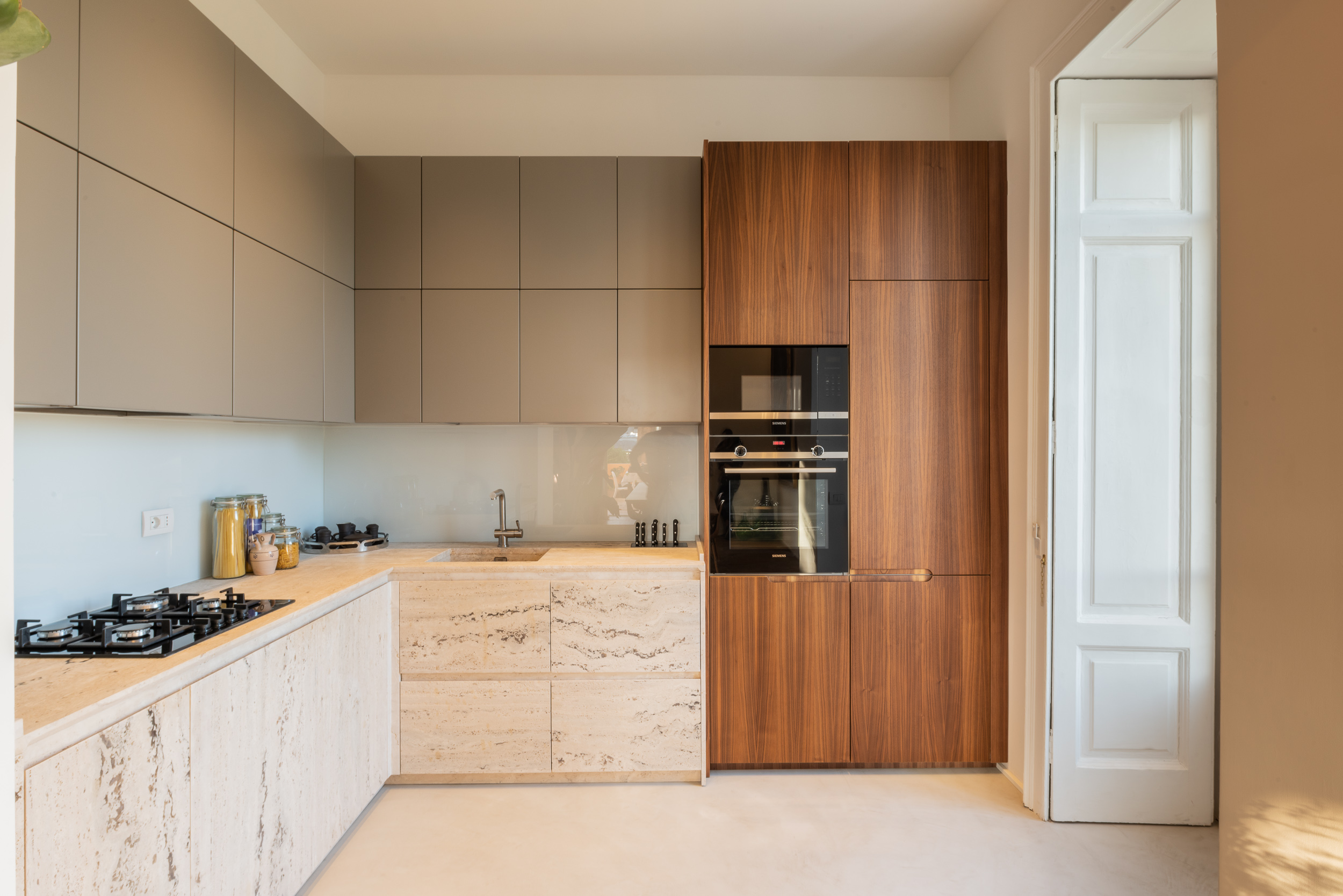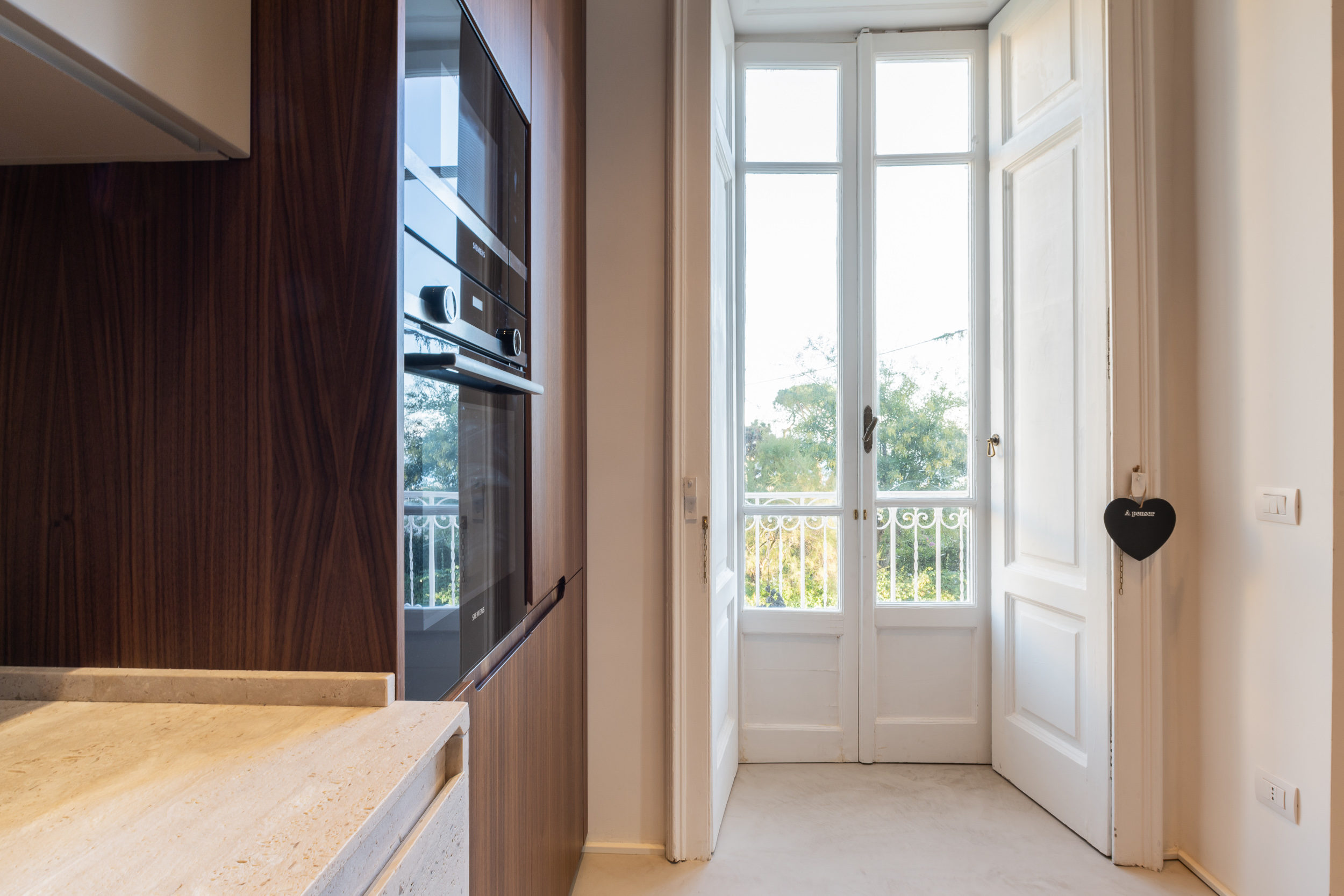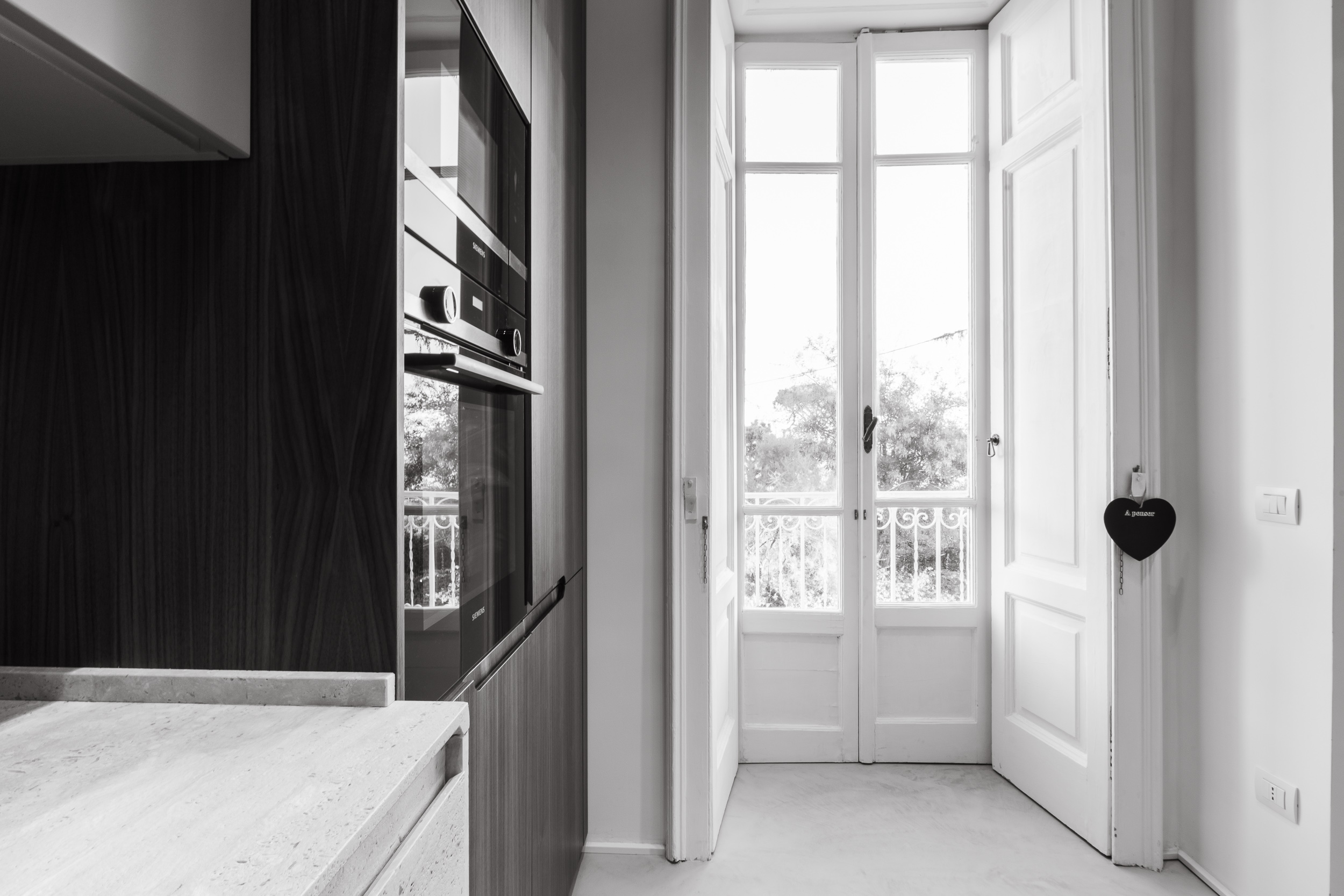 L’appartamento di circa 100 metri quadri si trova all’interno di una villa Liberty degli inizi del Novecento. Il progetto ha interessato tutta l’abitazione, in cui sono stati ridisegnati interamente gli spazi. Il fulcro della casa è una grande zona living, con ambienti contigui di cucina e soggiorno. Mentre la zona notte è contrassegnata dalla zona patronale, con camera da letto, bagno e cabina armadio, e un’altra stanza con bagno. In questa casa abbiamo mantenuto alcuni elementi storici, come gli scuri dell’epoca, che si contrappongono ad altre rifiniture moderne.
