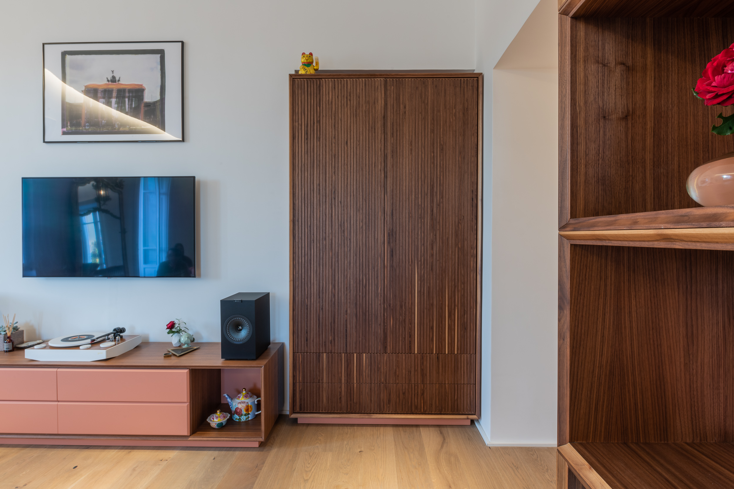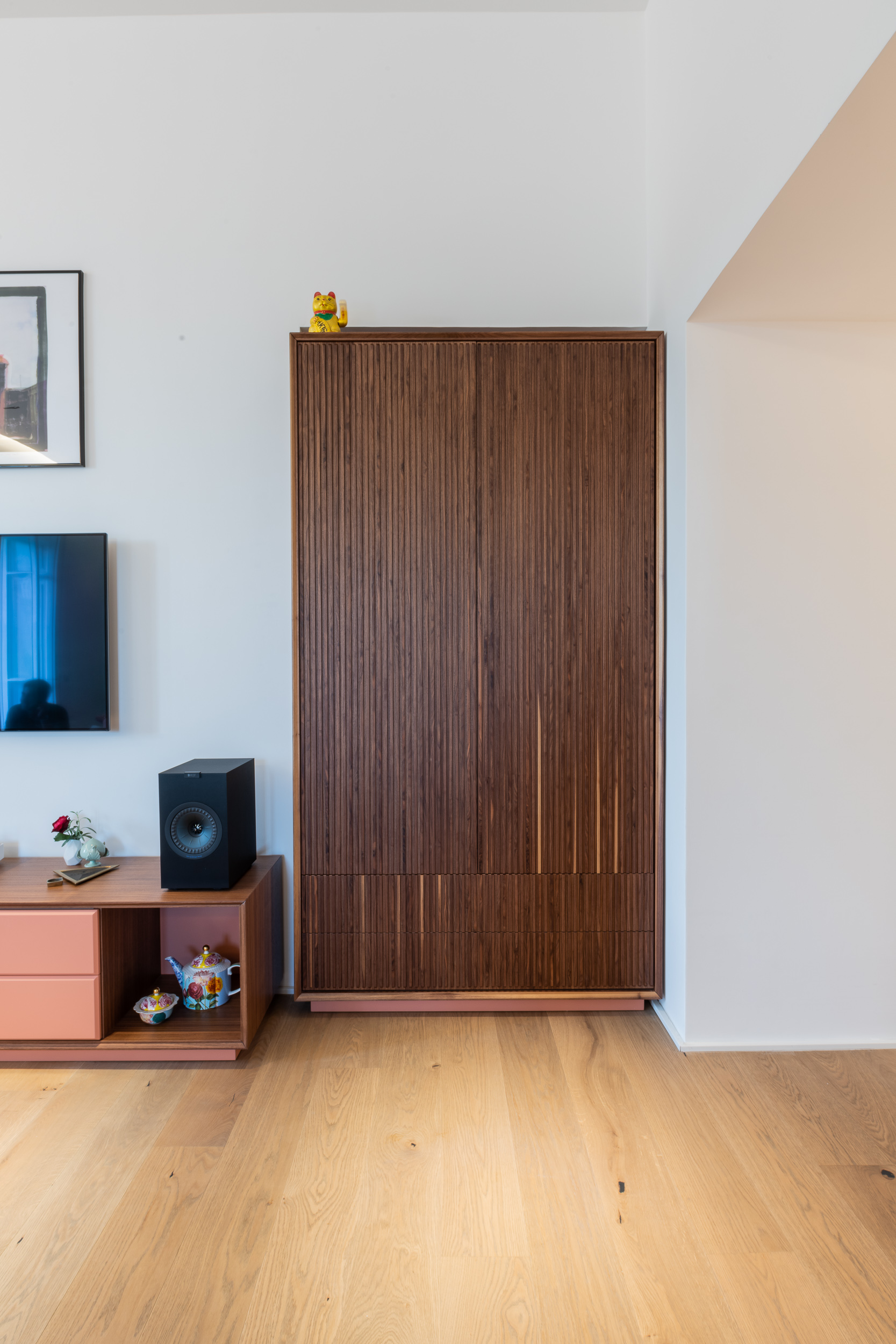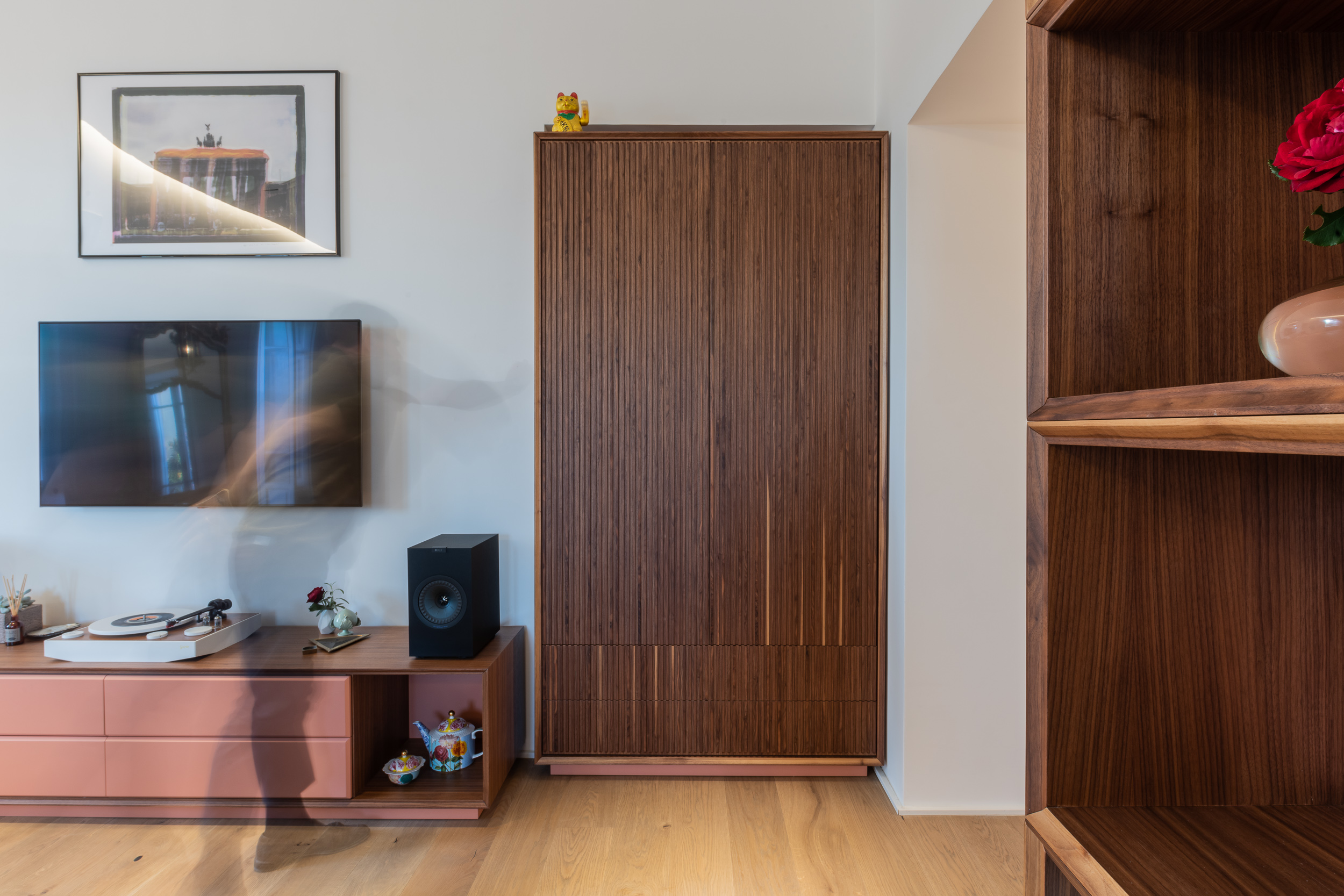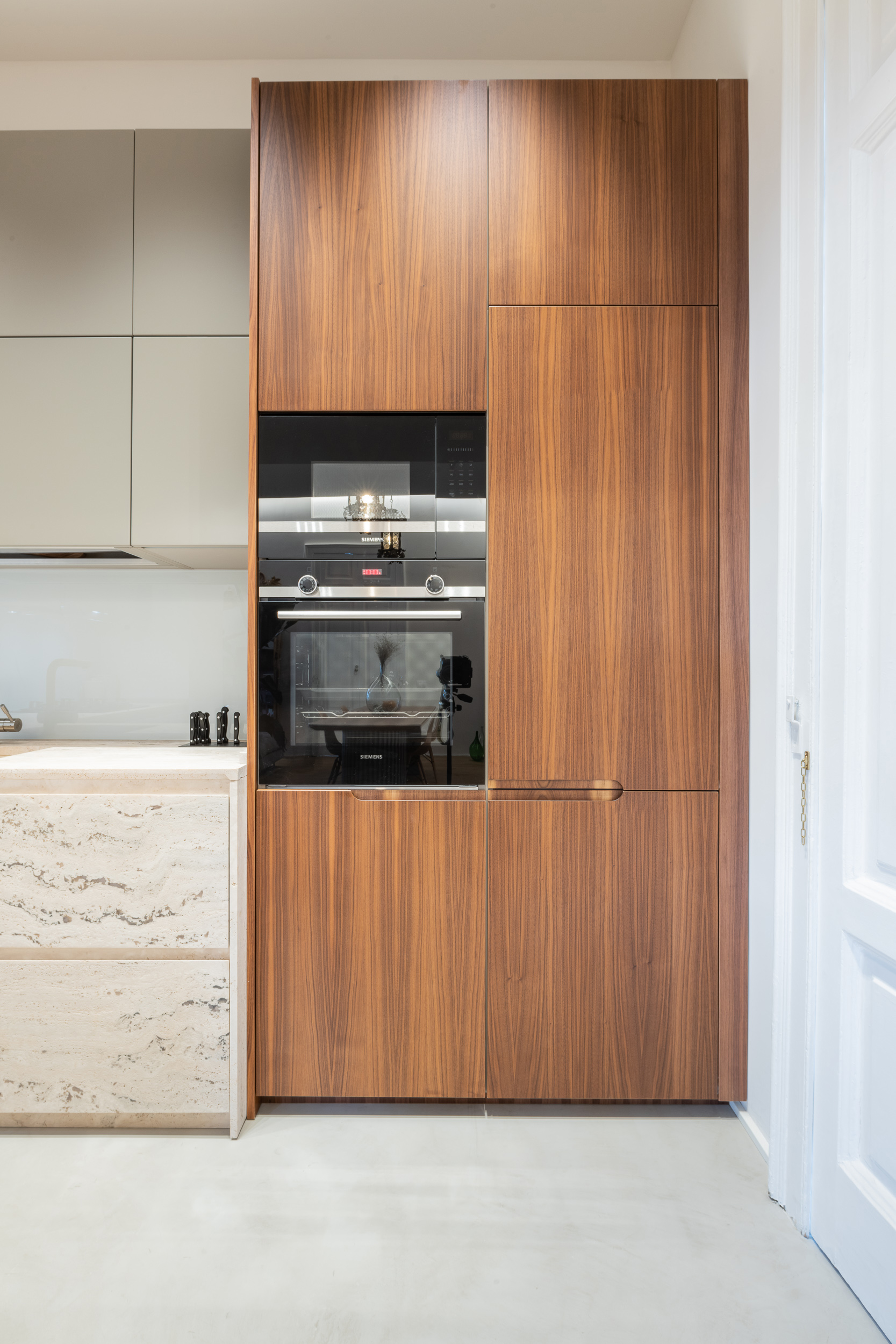 L’appartamento di circa 100 metri quadri si trova all’interno di una villa Liberty degli inizi del Novecento. Il progetto ha interessato tutta l’abitazione, in cui sono stati ridisegnati interamente gli spazi. Il fulcro della casa è una grande zona living, con ambienti contigui di cucina e soggiorno. Mentre la zona notte è contrassegnata dalla zona patronale, con camera da letto, bagno e cabina armadio, e un’altra stanza con bagno. In questa casa abbiamo mantenuto alcuni elementi storici, come gli scuri dell’epoca, che si contrappongono ad altre rifiniture moderne.