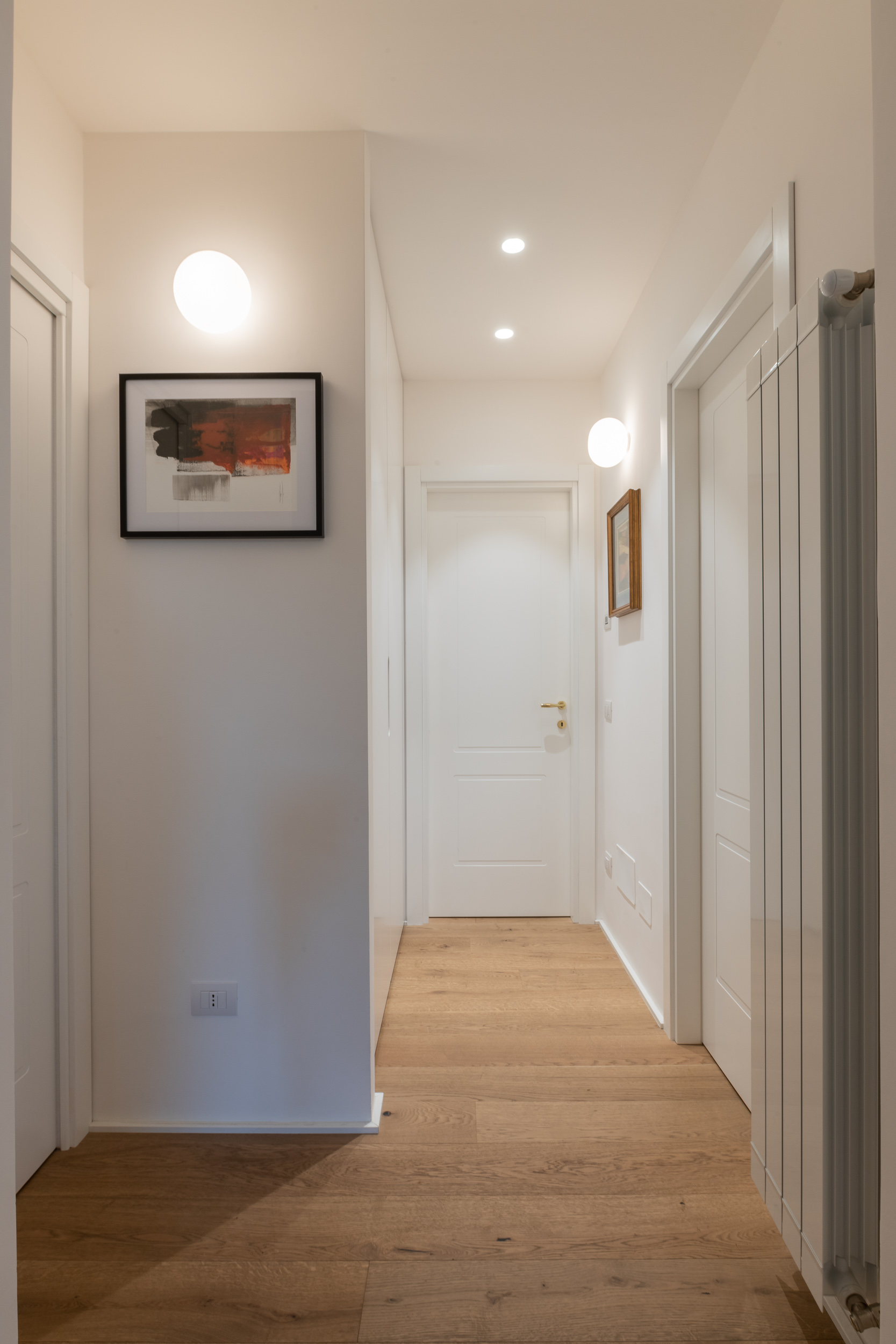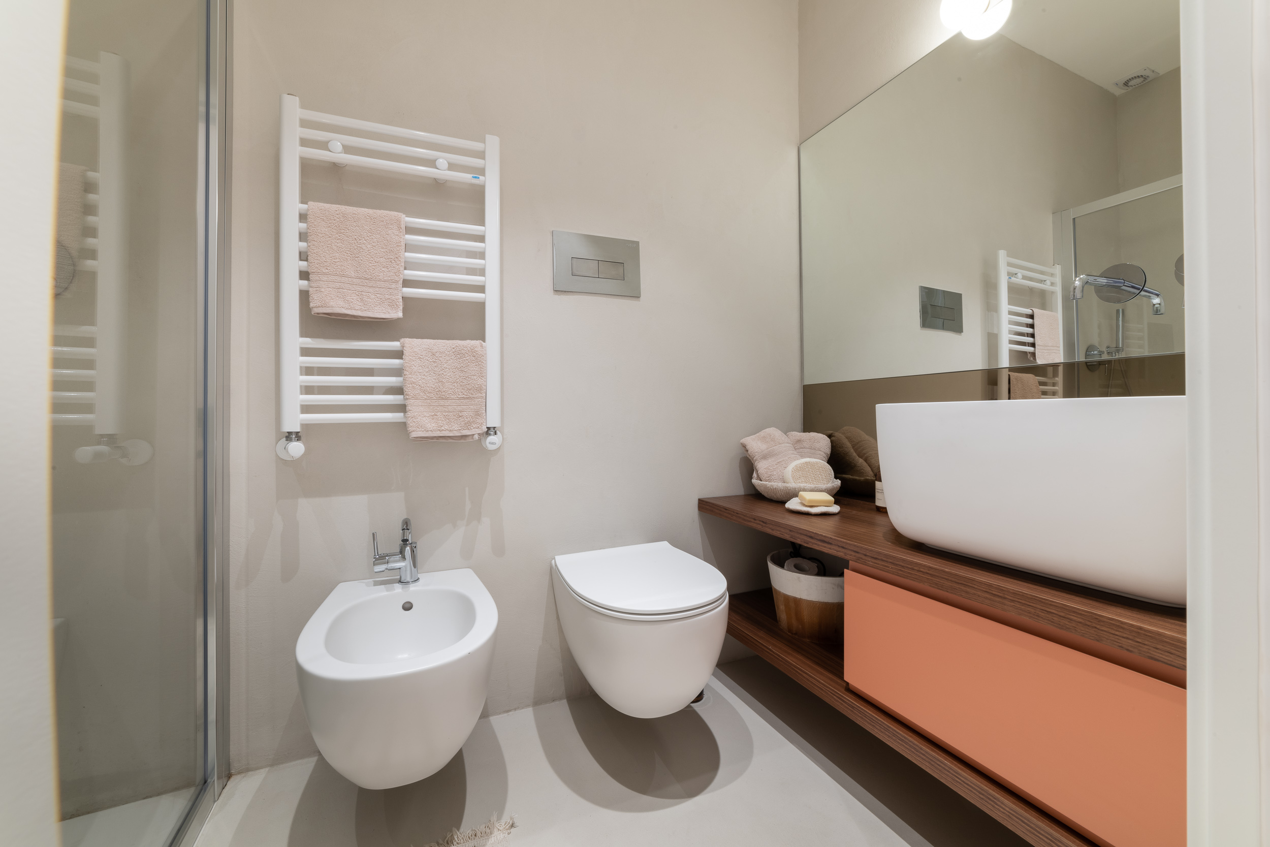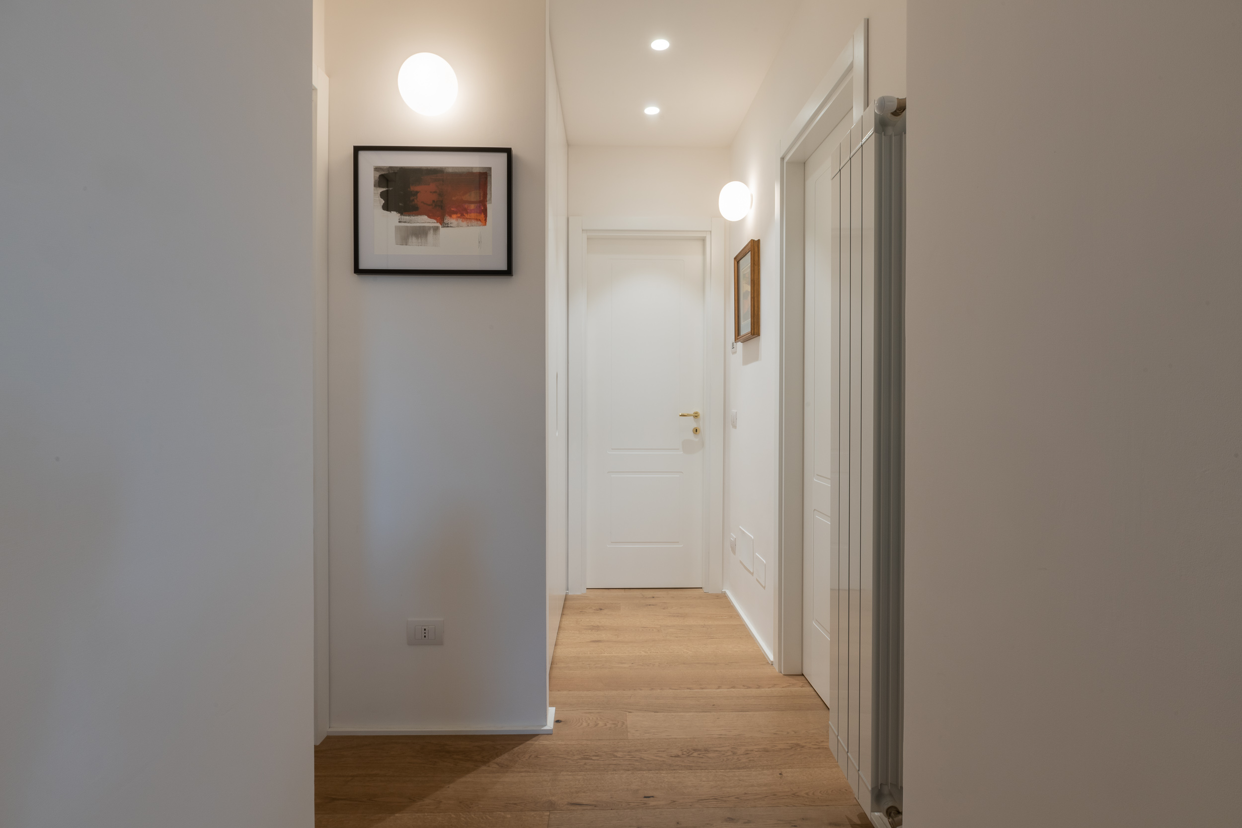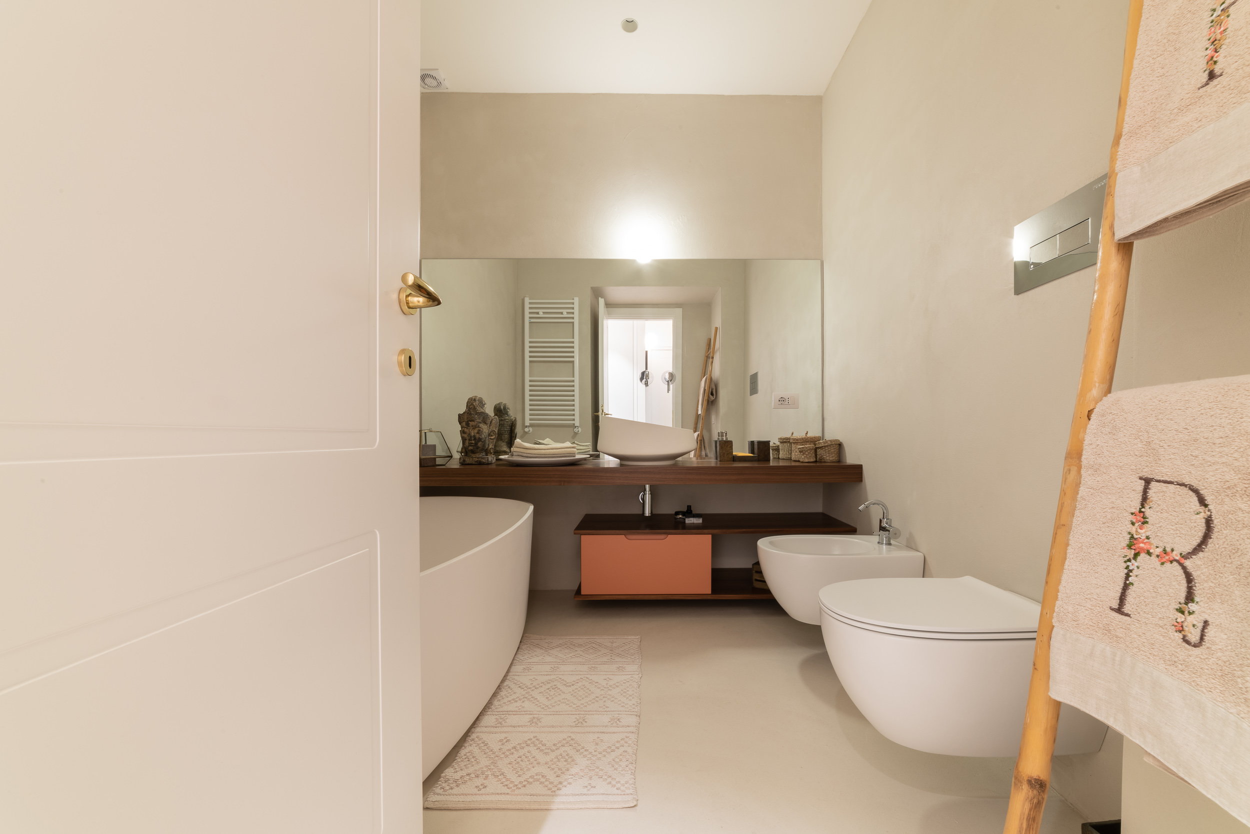 Per conferire a tutto l’ambiente uno stile contemporaneo nella maggior parte dell’abitazione troviamo il parquet, tranne in cucina e in bagno dove sono state scelte delle superfici in micro-cemento, abolendo così le fughe.