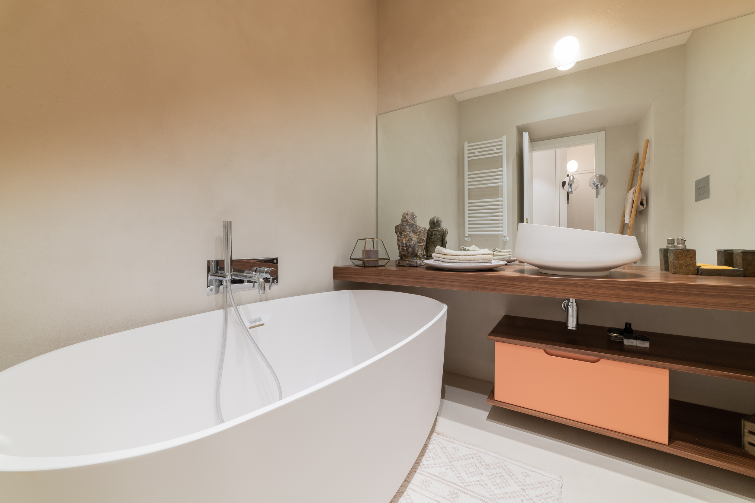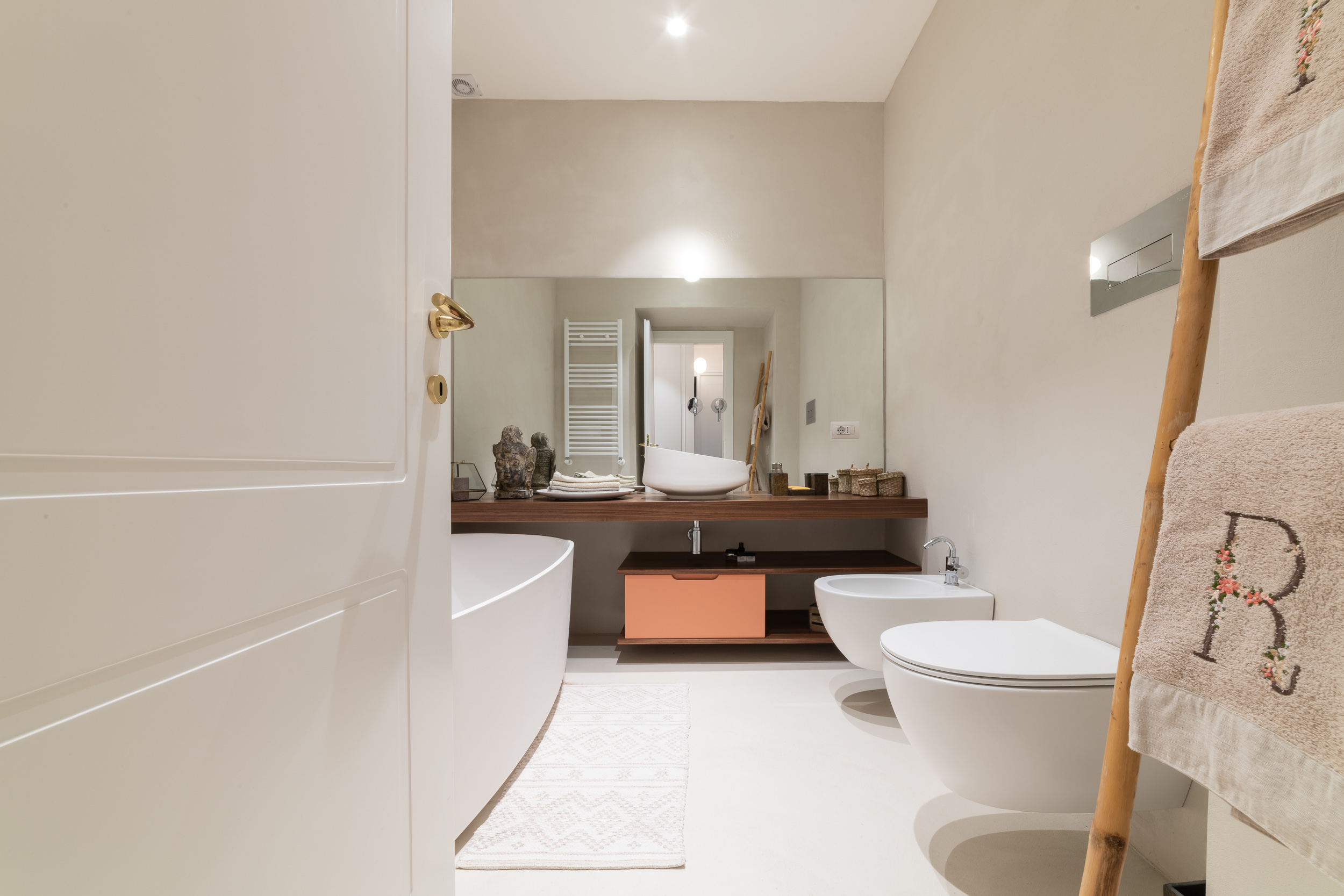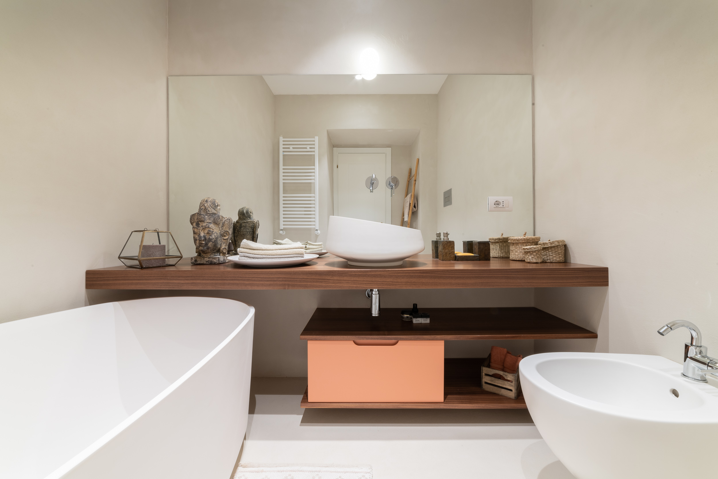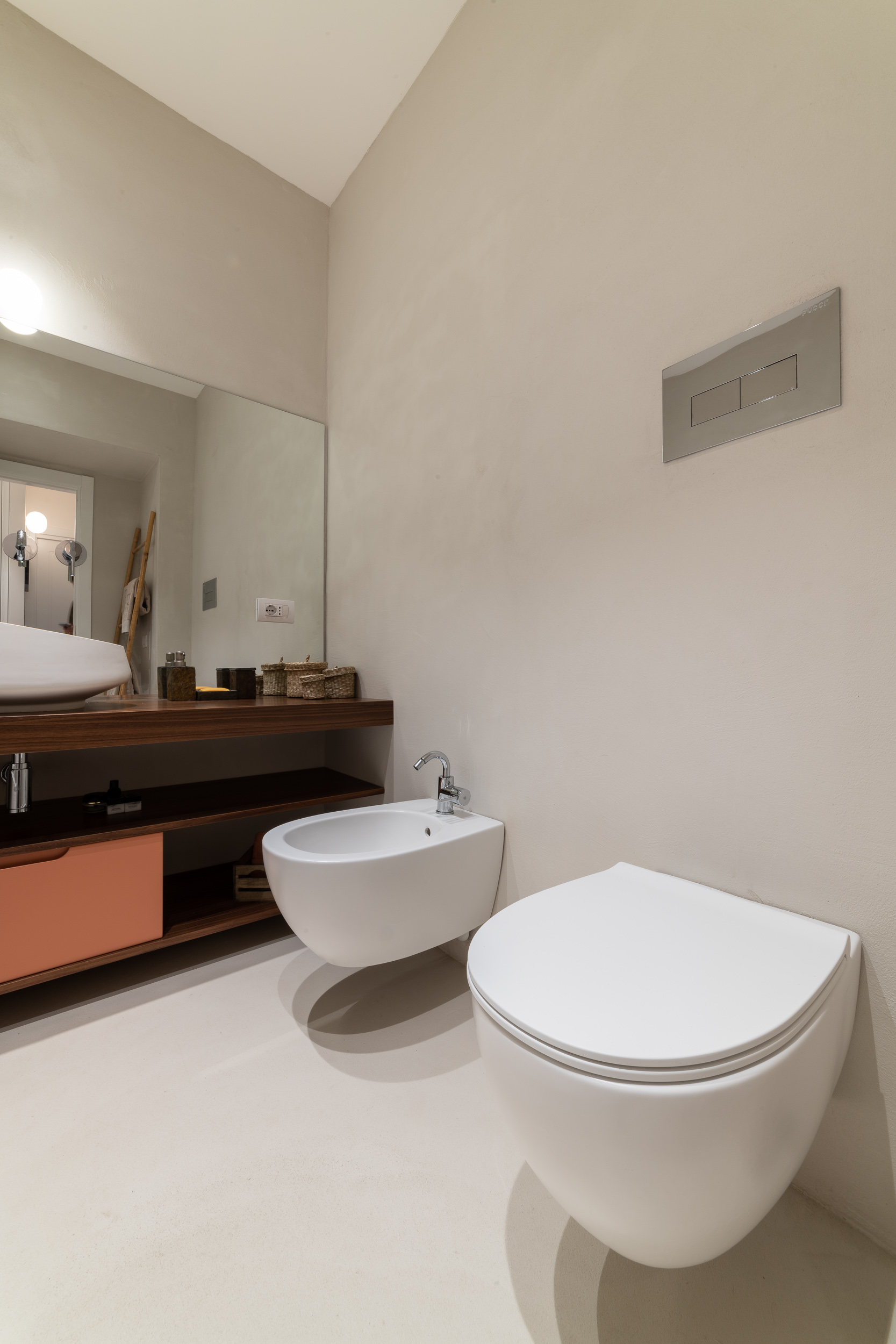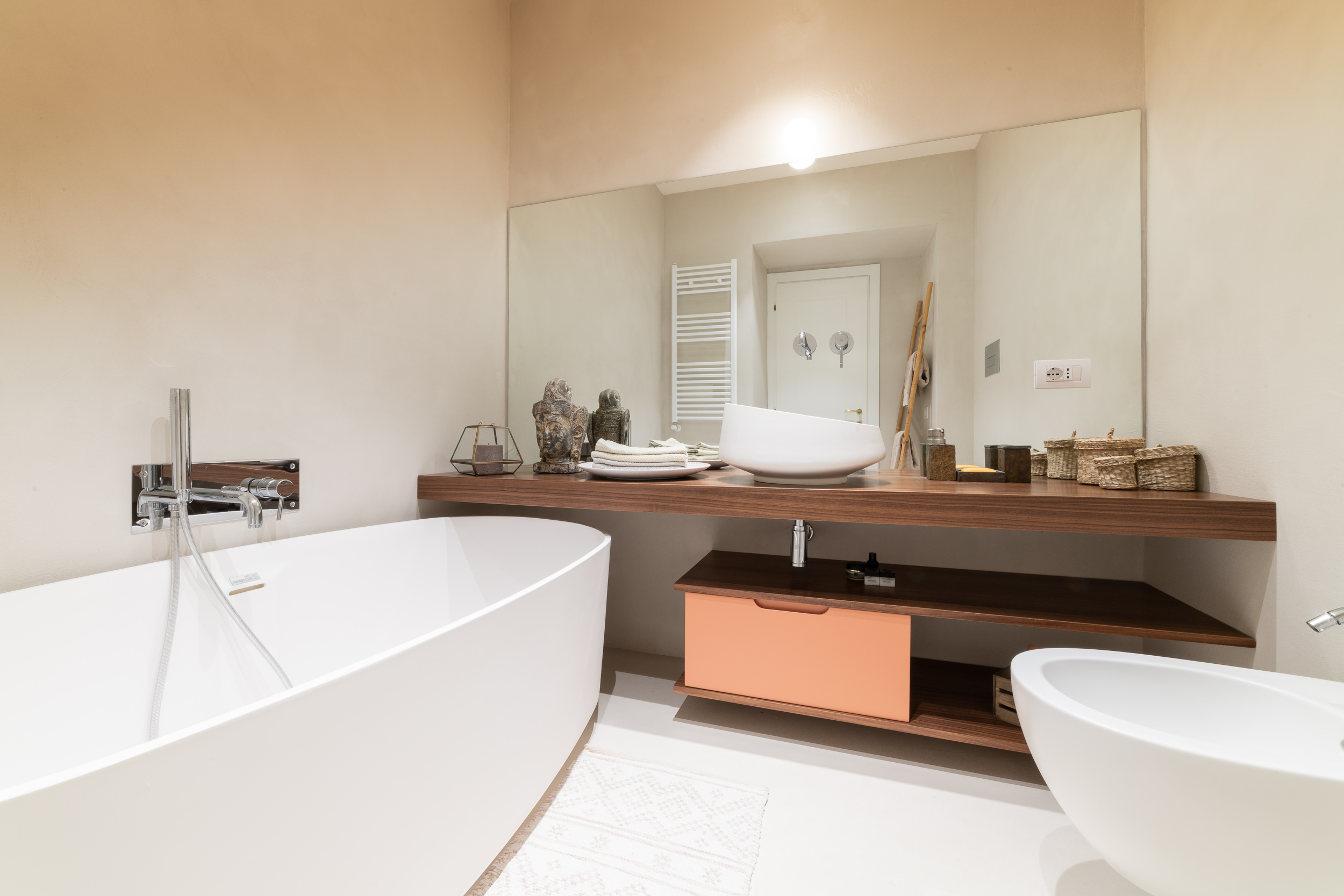 Per conferire a tutto l’ambiente uno stile contemporaneo nella maggior parte dell’abitazione troviamo il parquet, tranne in cucina e in bagno dove sono state scelte delle superfici in micro-cemento, abolendo così le fughe.