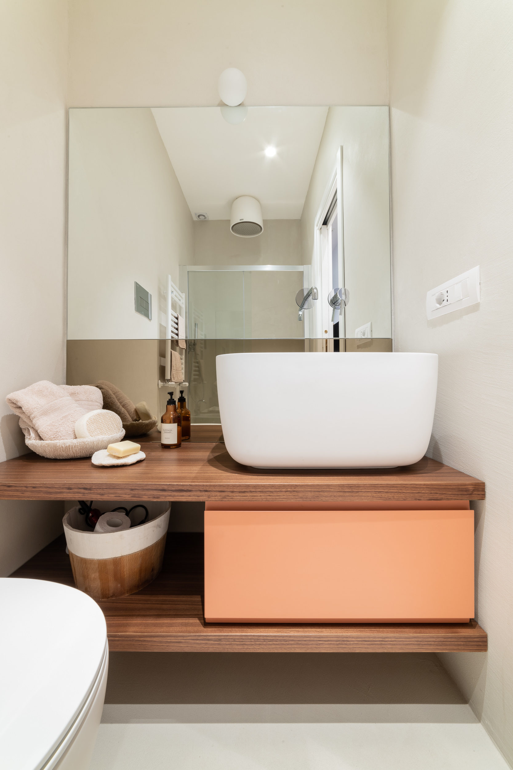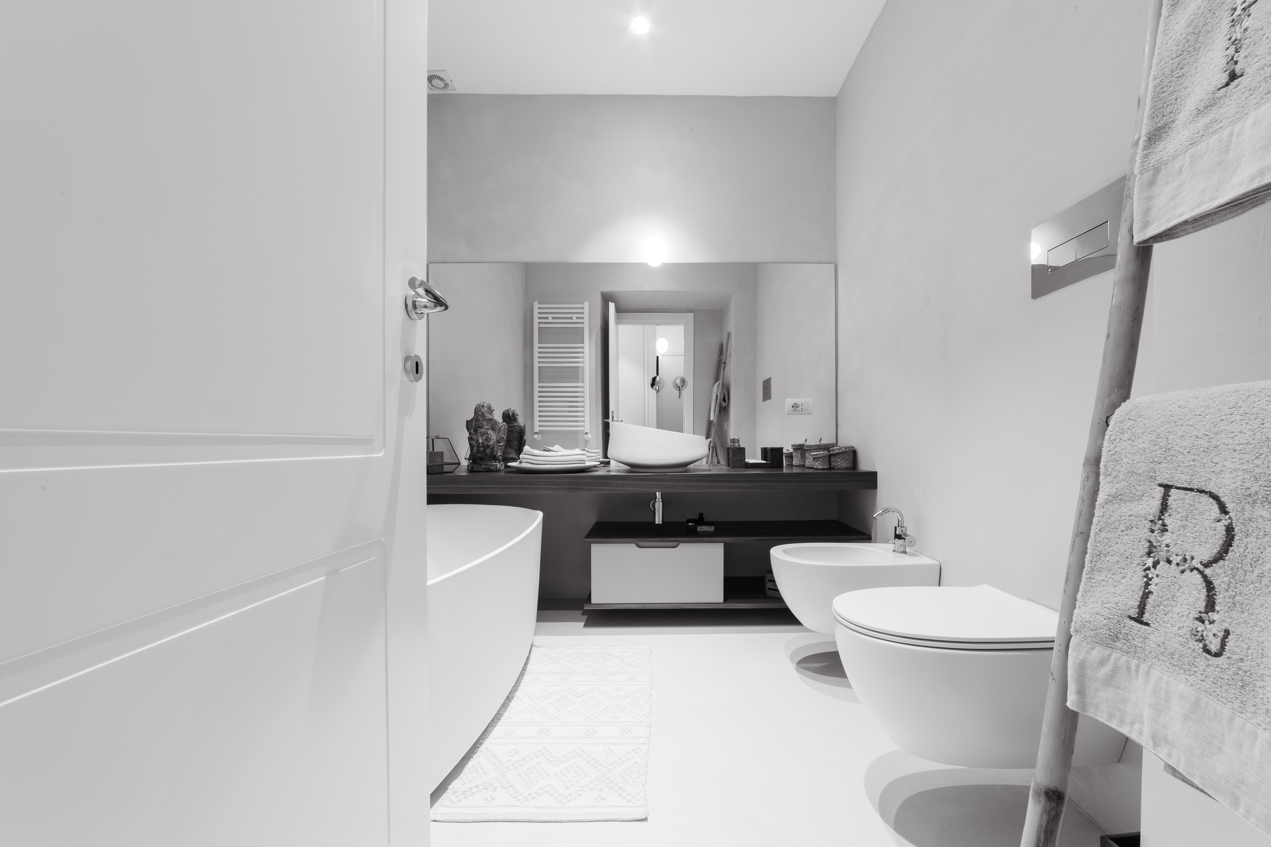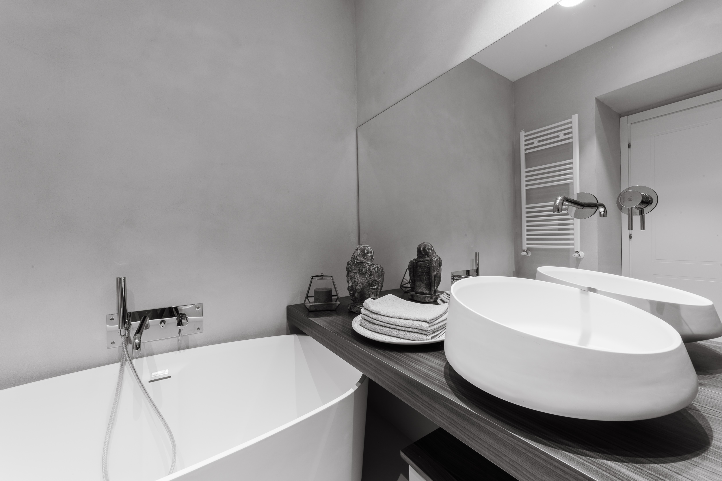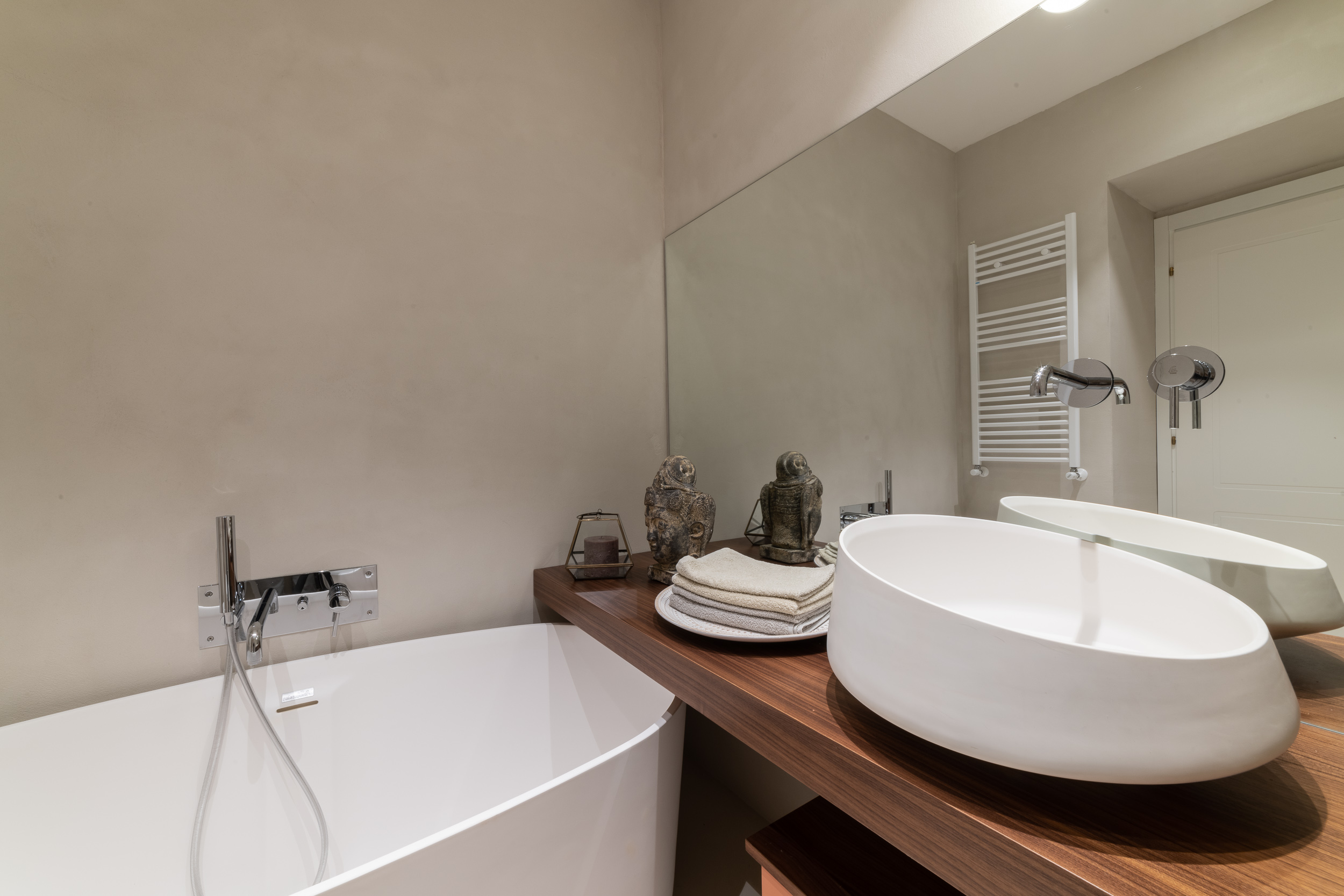 Per conferire a tutto l’ambiente uno stile contemporaneo nella maggior parte dell’abitazione troviamo il parquet, tranne in cucina e in bagno dove sono state scelte delle superfici in micro-cemento, abolendo così le fughe.