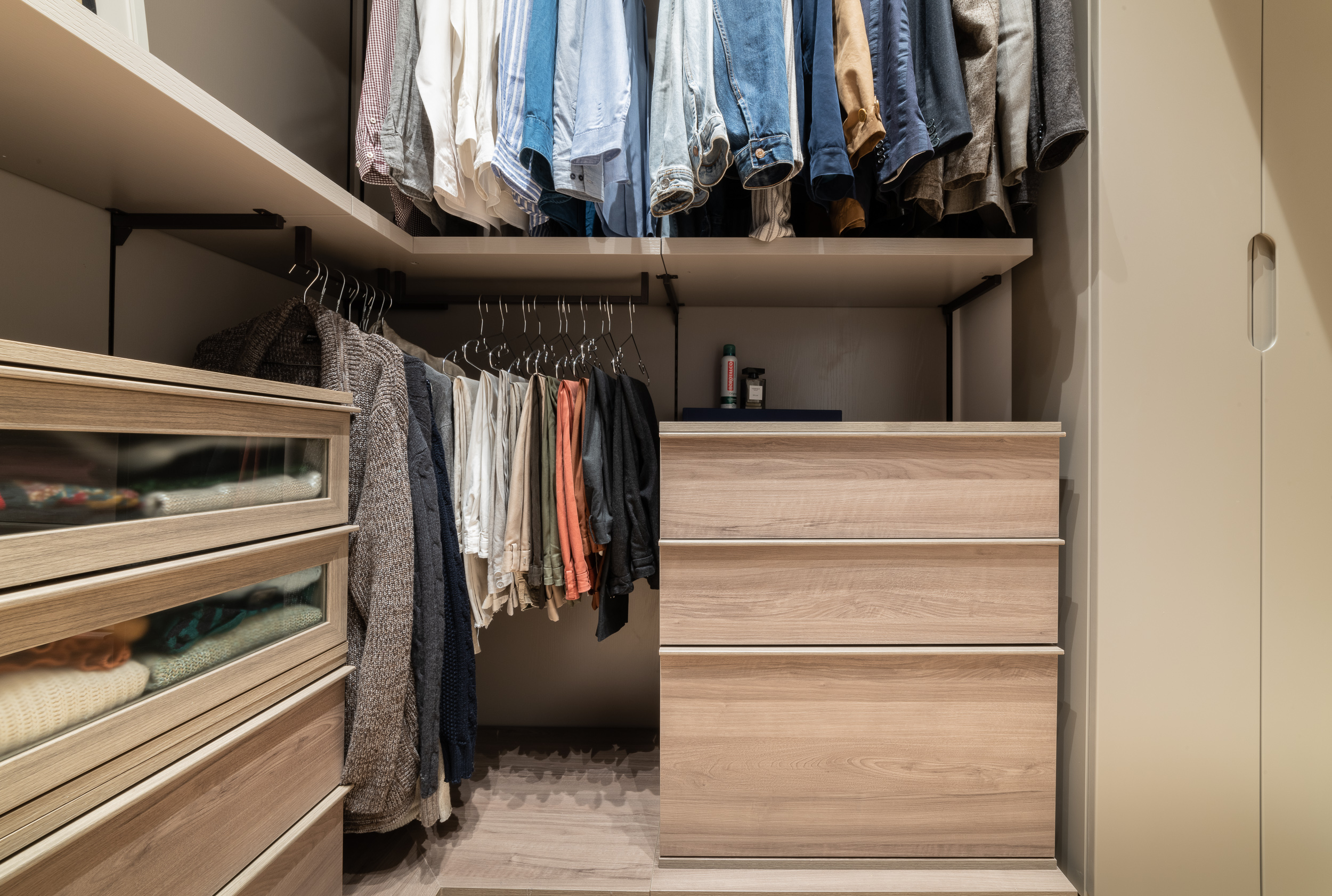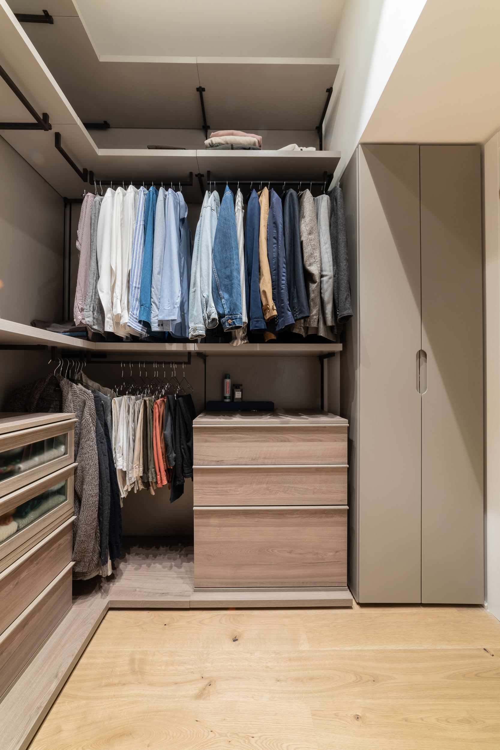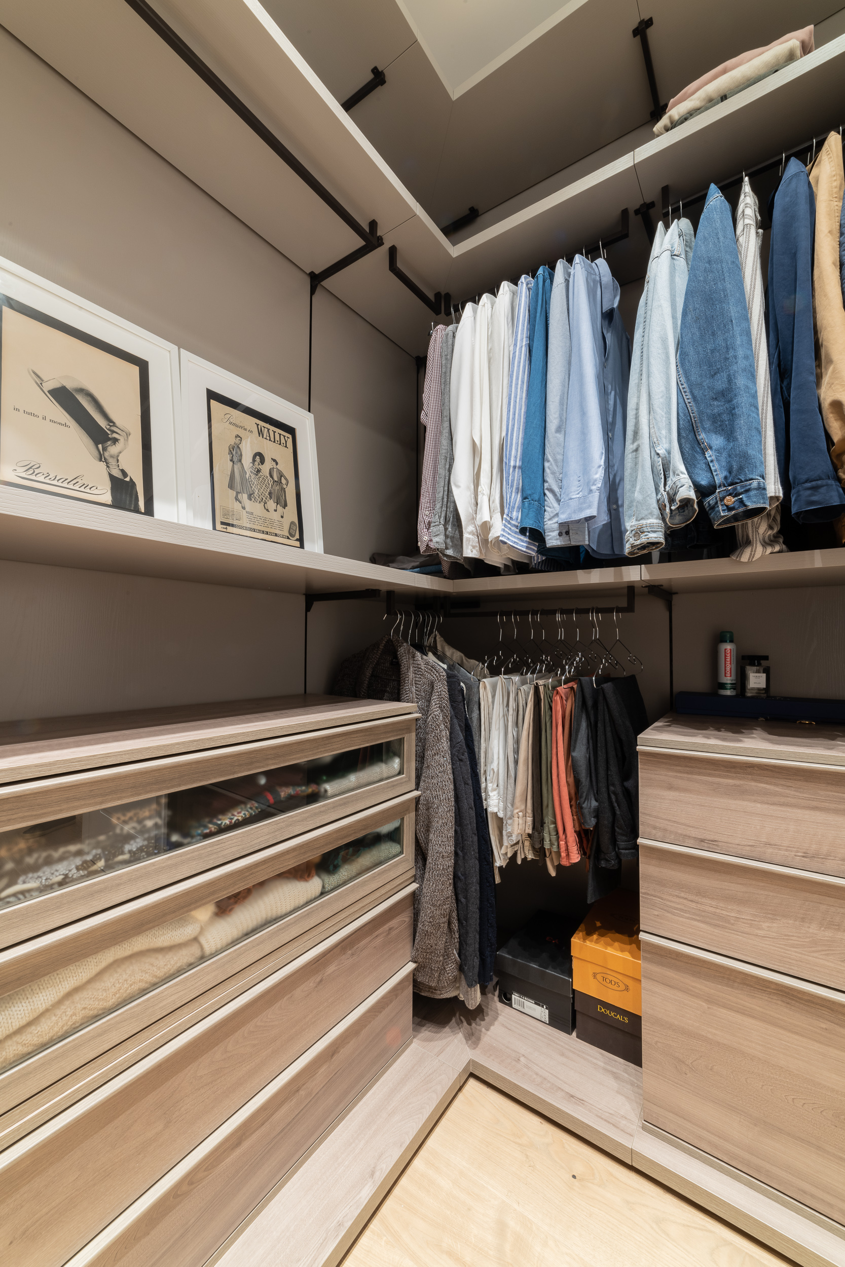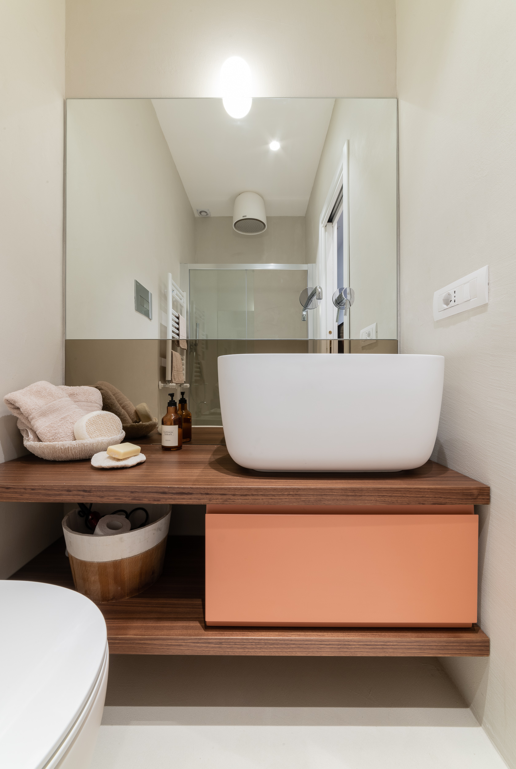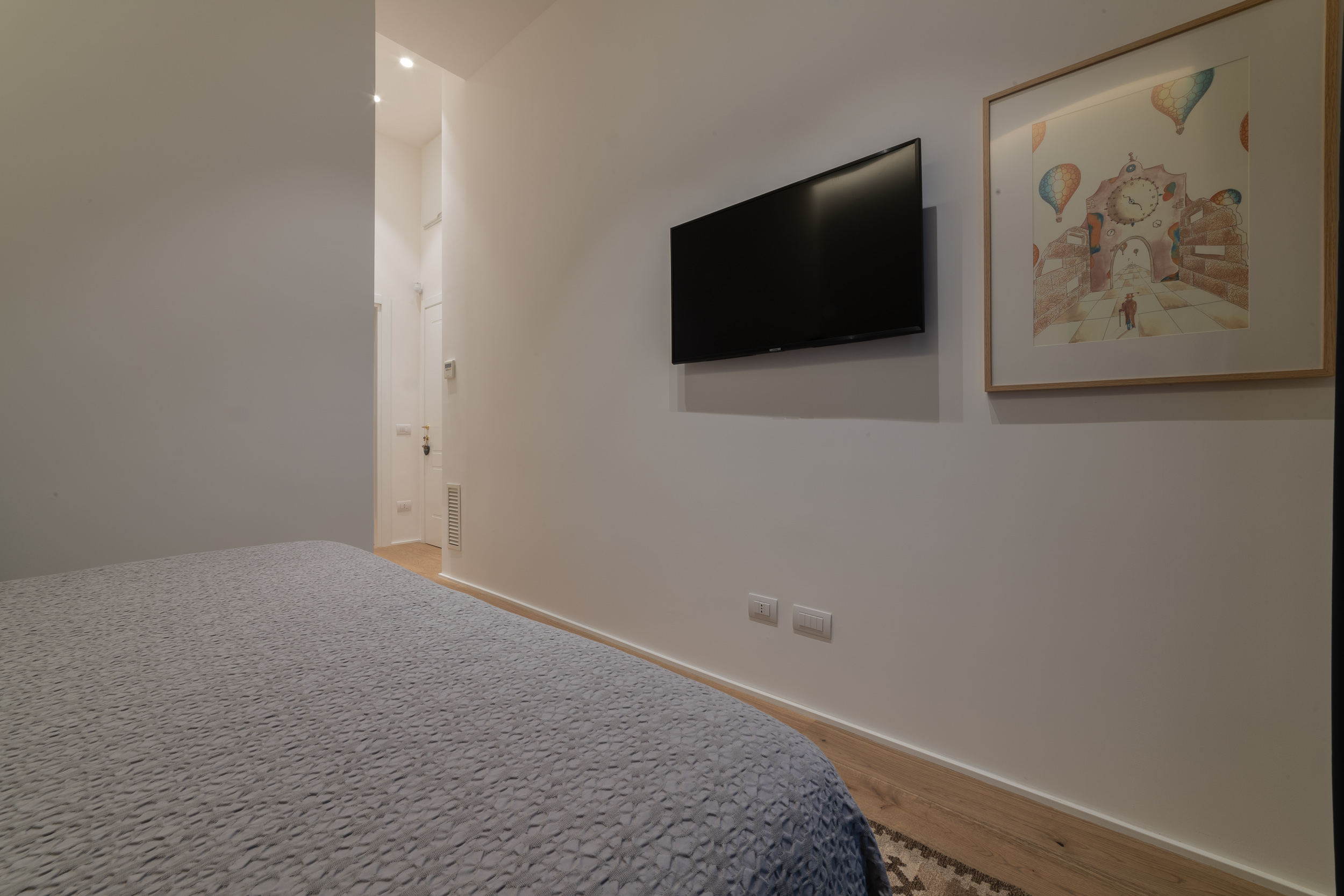 Per conferire a tutto l’ambiente uno stile contemporaneo nella maggior parte dell’abitazione troviamo il parquet, tranne in cucina e in bagno dove sono state scelte delle superfici in micro-cemento, abolendo così le fughe.