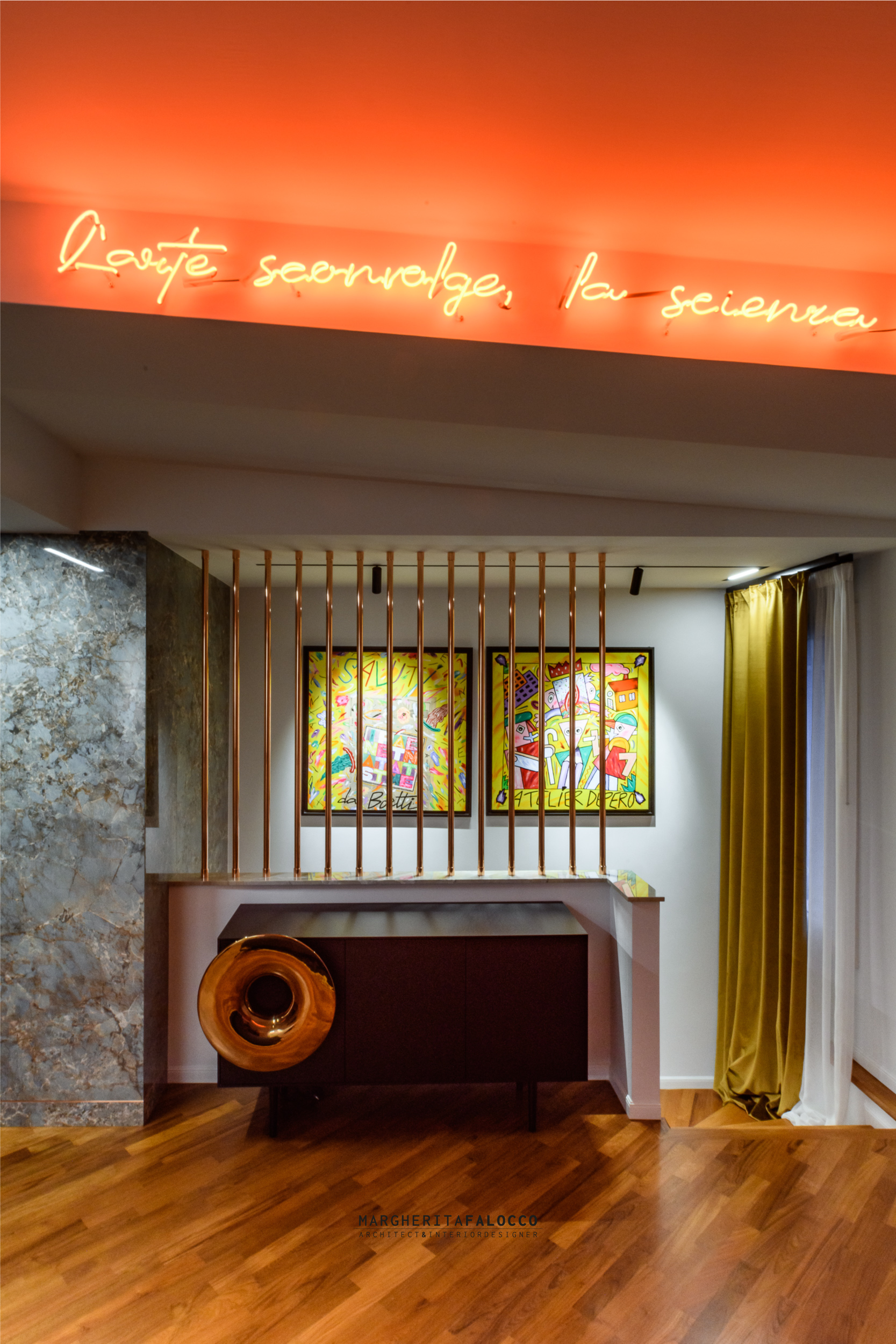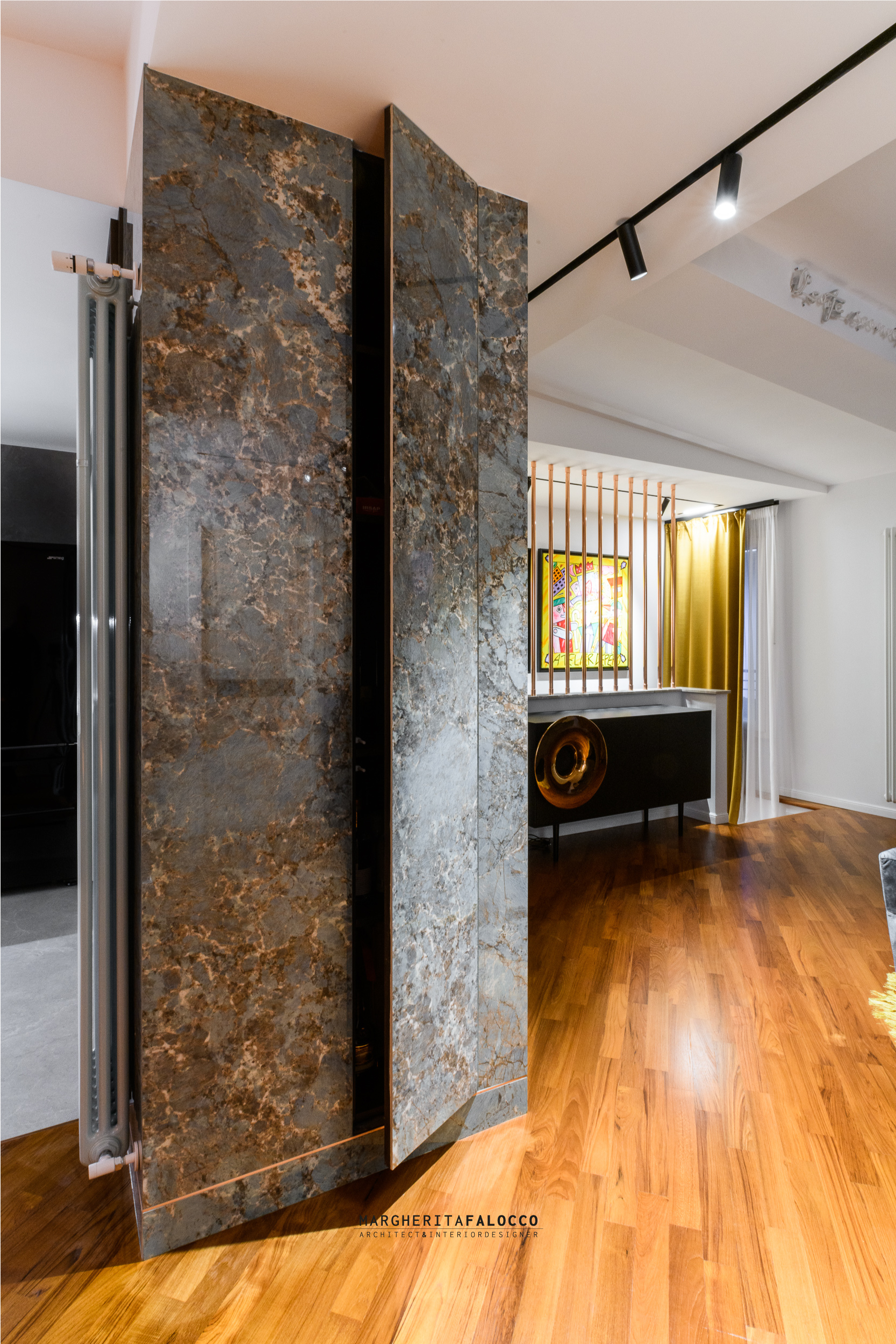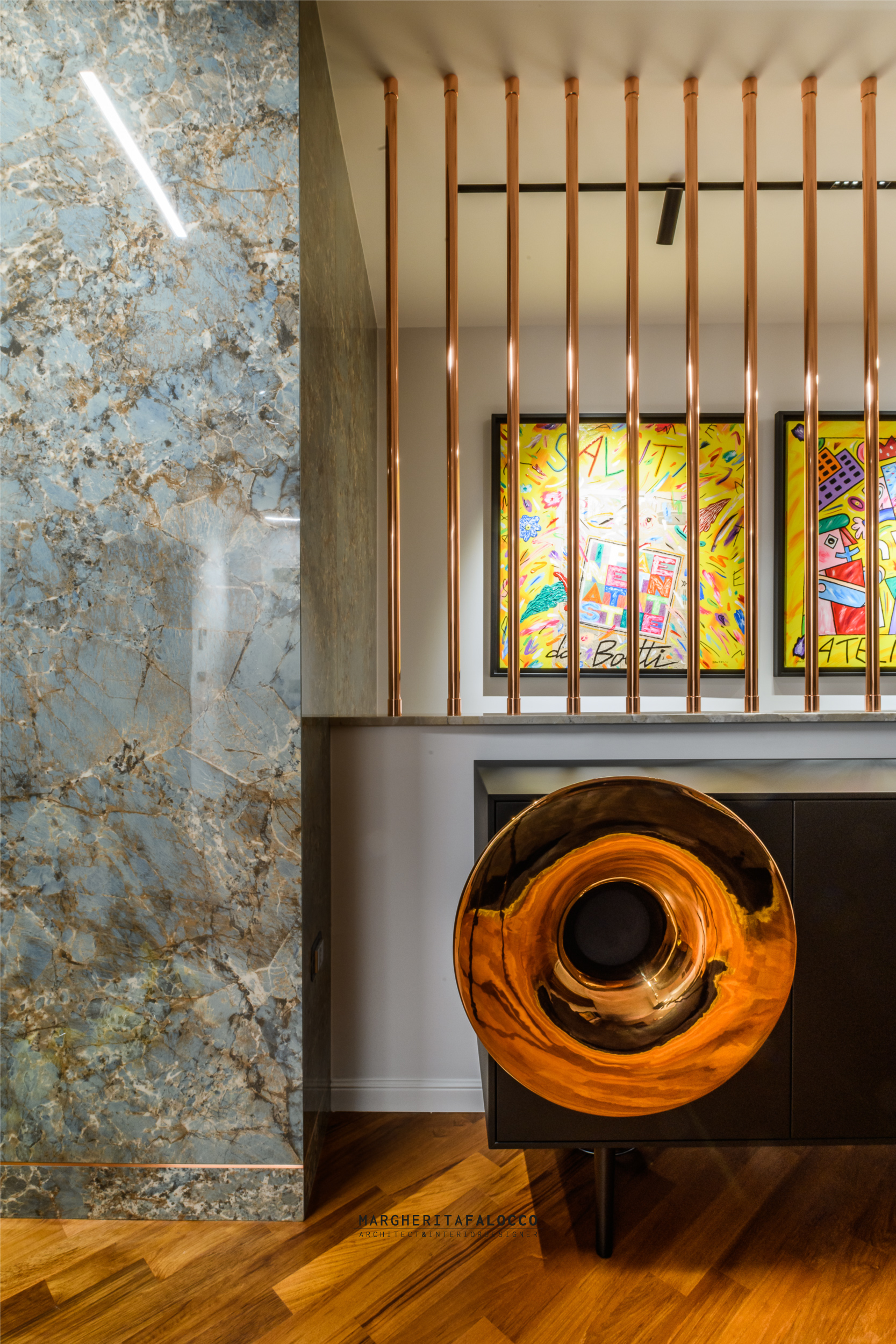 Gli inserti in vero rame che si fondono con i dettagli dello stesso colore delle forniture, scintillano attraverso i sistemi di binari a soffitto, che includono led e spot orientati verso i quadri, un esempio privato di piccola galleria d’arte.