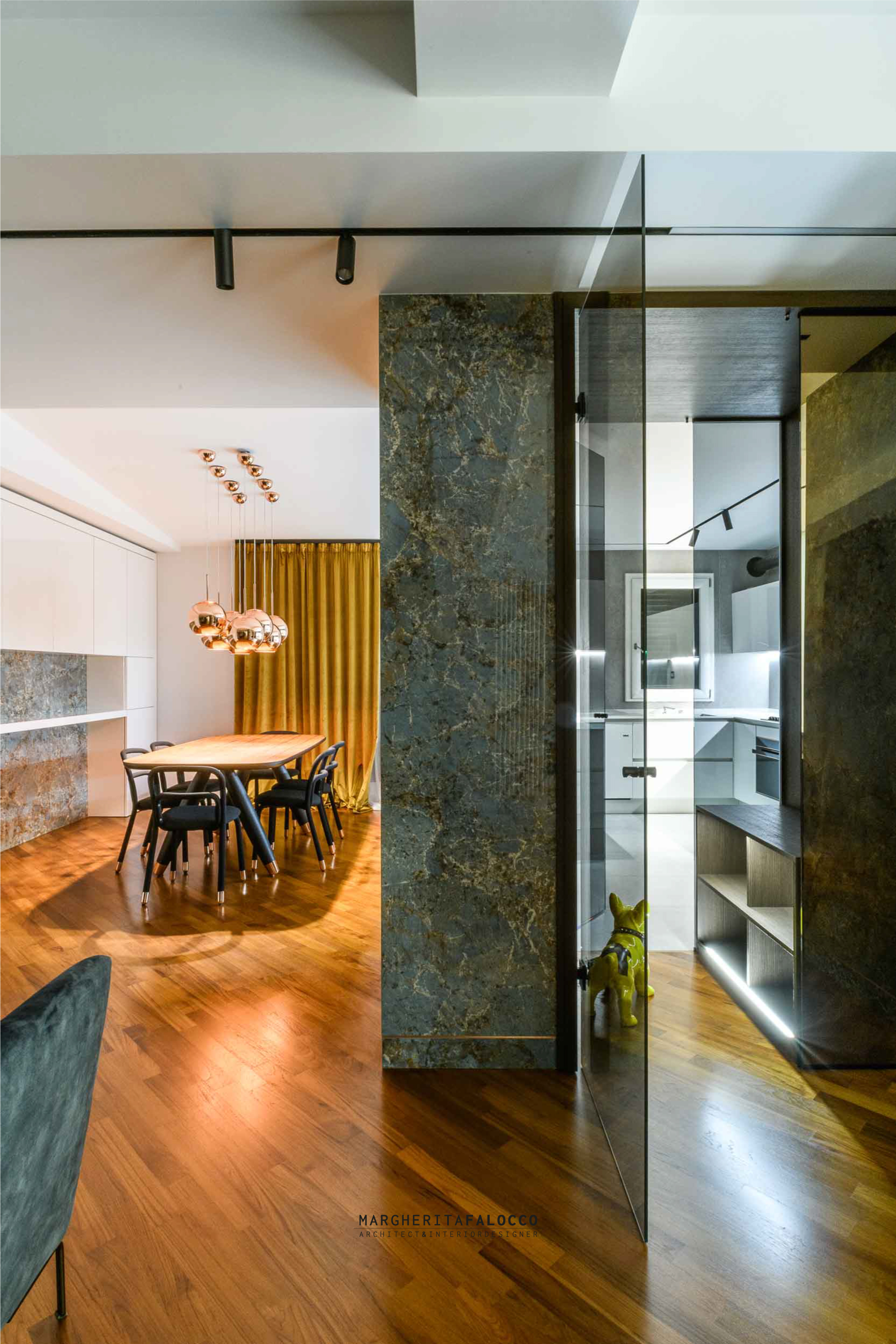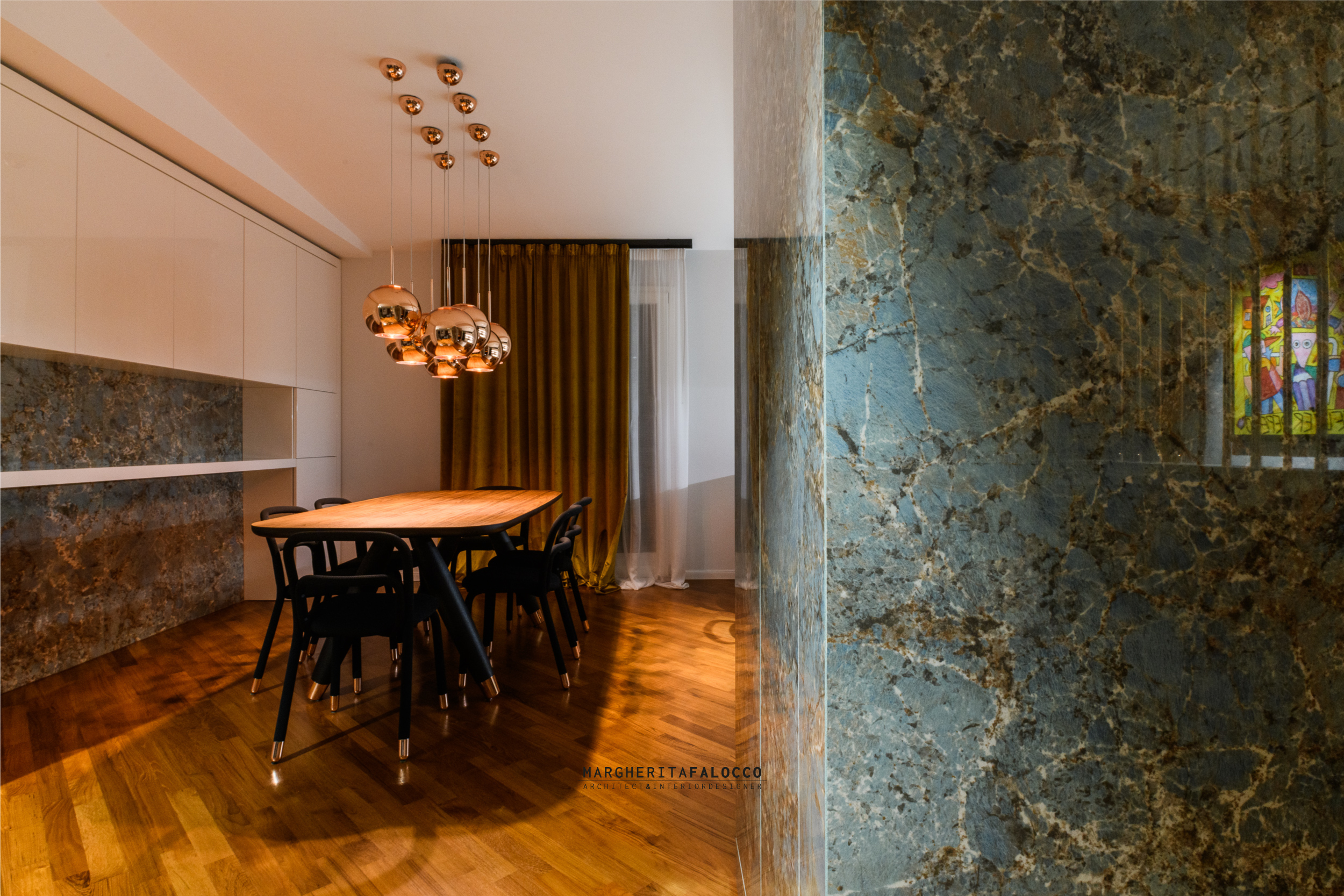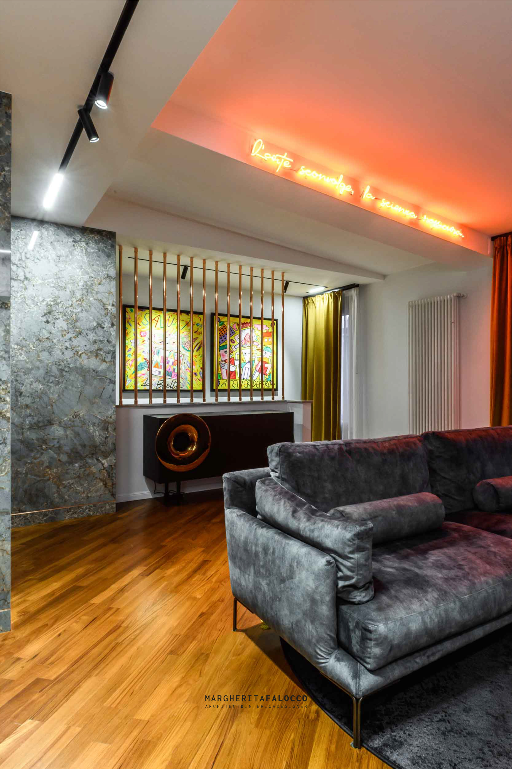 Gli inserti in vero rame che si fondono con i dettagli dello stesso colore delle forniture, scintillano attraverso i sistemi di binari a soffitto, che includono led e spot orientati verso i quadri, un esempio privato di piccola galleria d’arte.