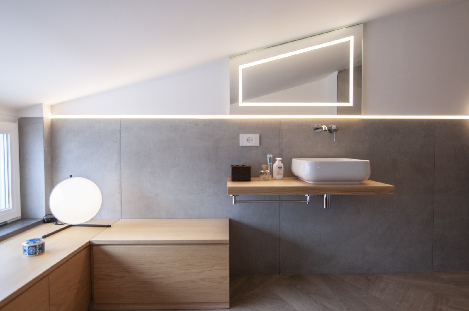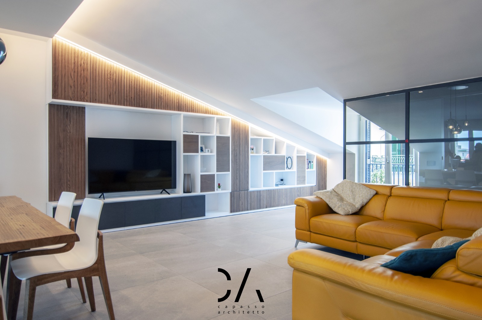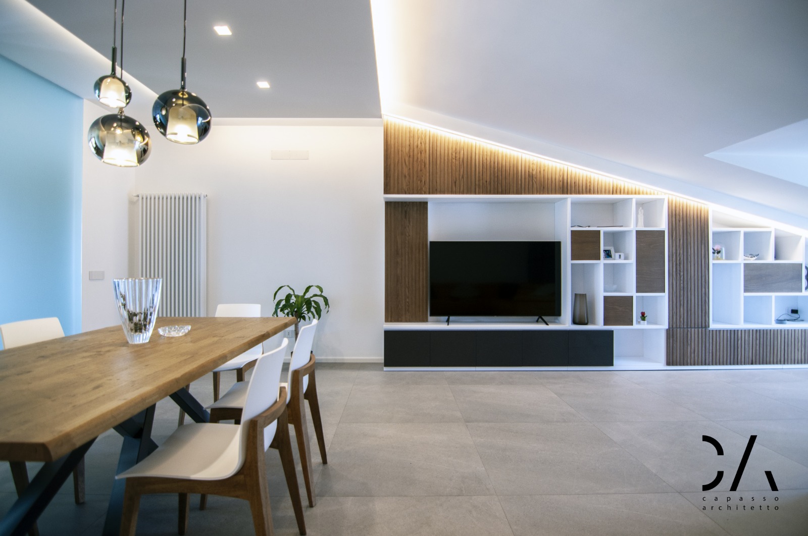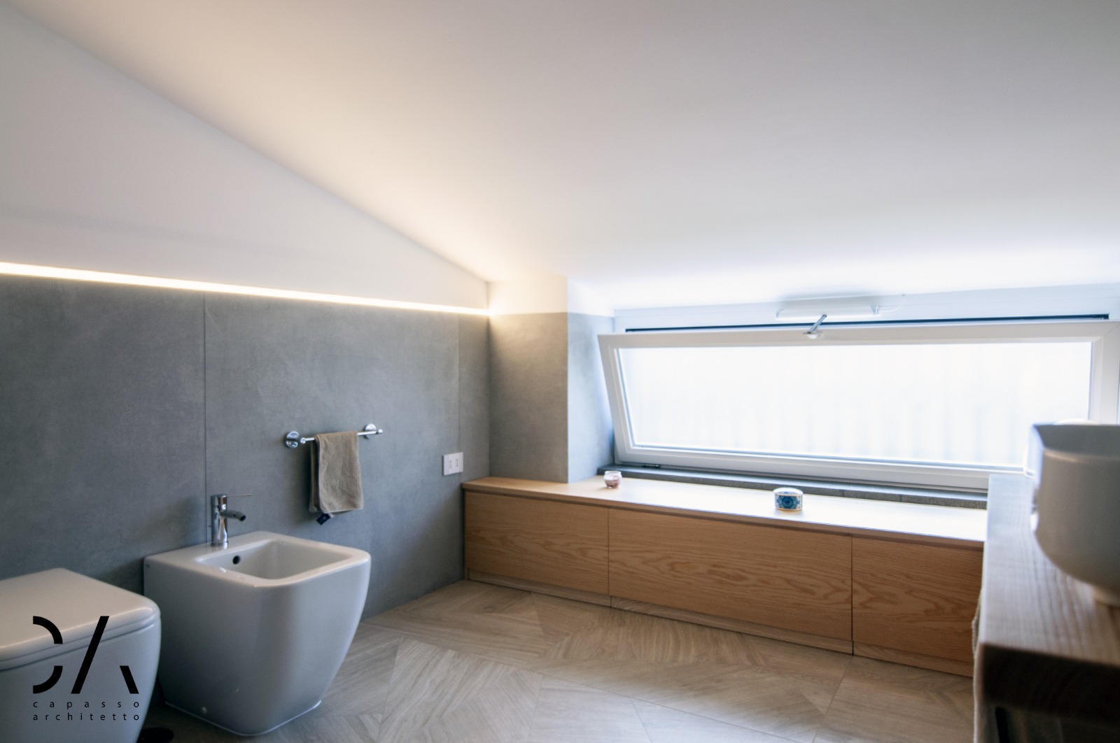 Il dialogo tra i materiali utilizzati gres, legno e vetro, il disegno degli arredi interni come la parete attrezzata e un progetto illuminotecnico che enfatizza la linea di falda, sono sicuramente gli aspetti più rappresentativi del concept, che mettono in mostra come si possa caratterizzare un progetto di architettura d’interni partendo dai limiti dell’involucro edilizio e non dai suoi pregi.