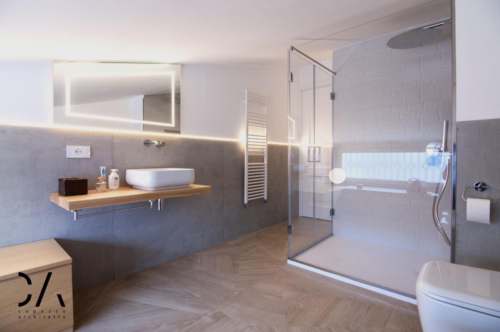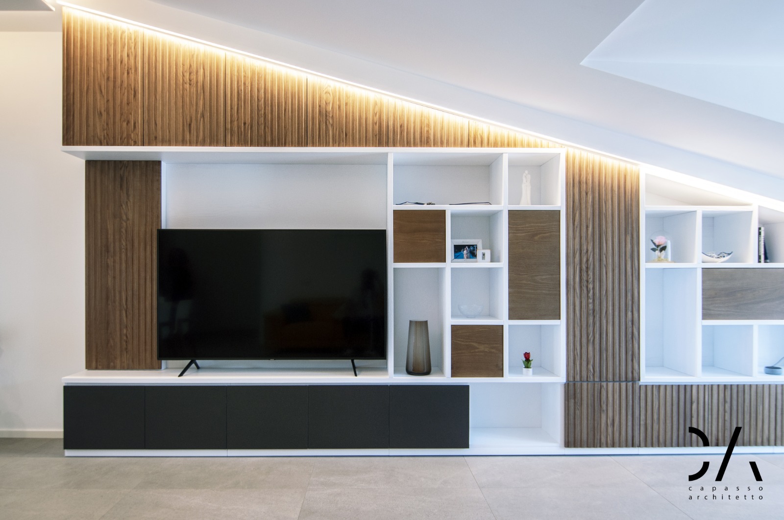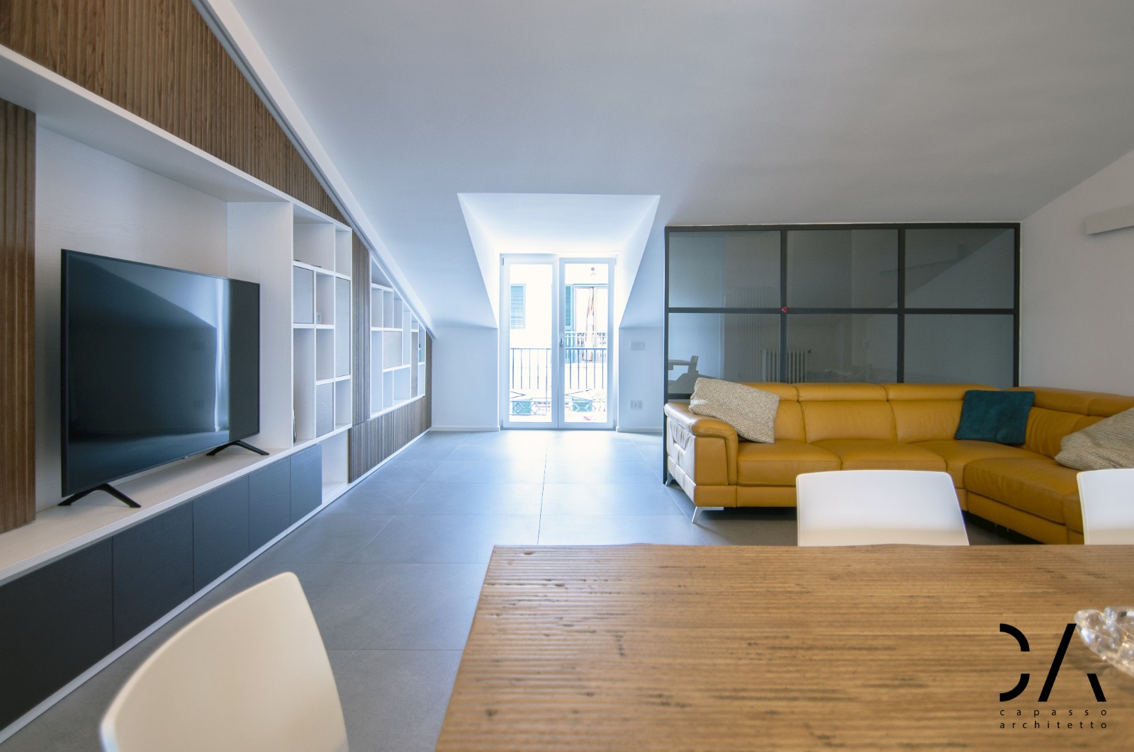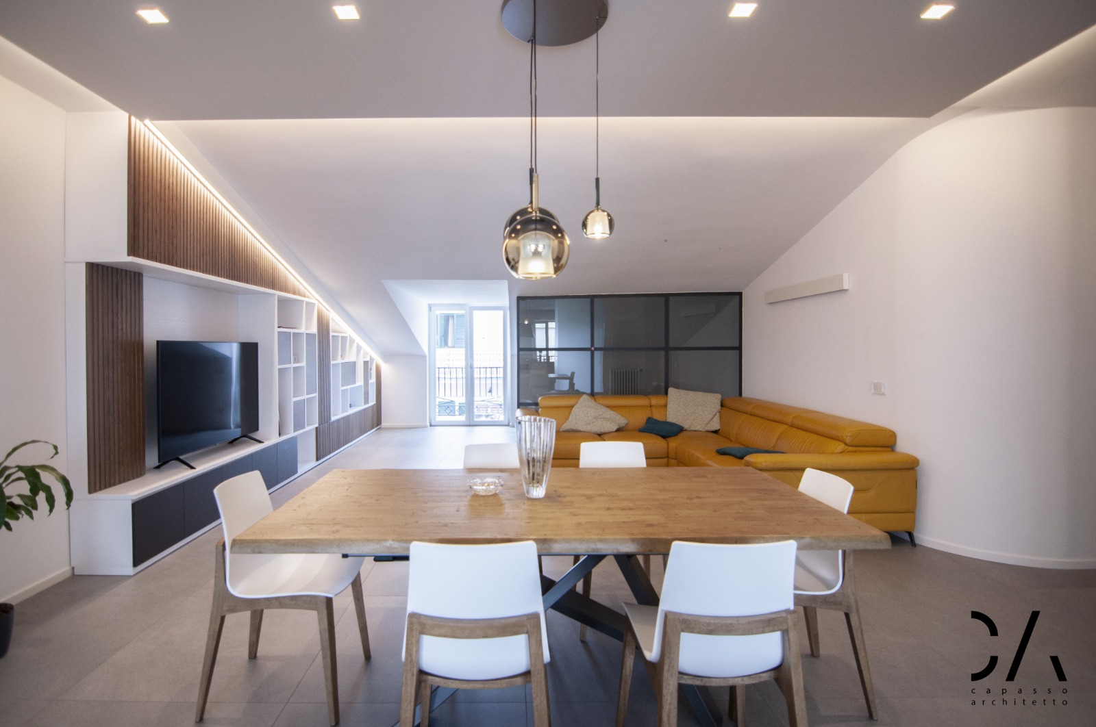 Il dialogo tra i materiali utilizzati gres, legno e vetro, il disegno degli arredi interni come la parete attrezzata e un progetto illuminotecnico che enfatizza la linea di falda, sono sicuramente gli aspetti più rappresentativi del concept, che mettono in mostra come si possa caratterizzare un progetto di architettura d’interni partendo dai limiti dell’involucro edilizio e non dai suoi pregi.