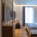 2Il legno utilizzato per la pavimentazione delle camere rende lo spazio accogliente e avvolgente, il grès dei corridoi e delle aree comuni, invece, restituisce ampiezza e luminosità agli ambienti.