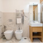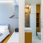 Nei bagni posti all’interno delle camere ritroviamo la congiunzione dei due elementi, grès e legno, per mantenere inalterato il leitmotiv, che ha accompagnato la progettazione.