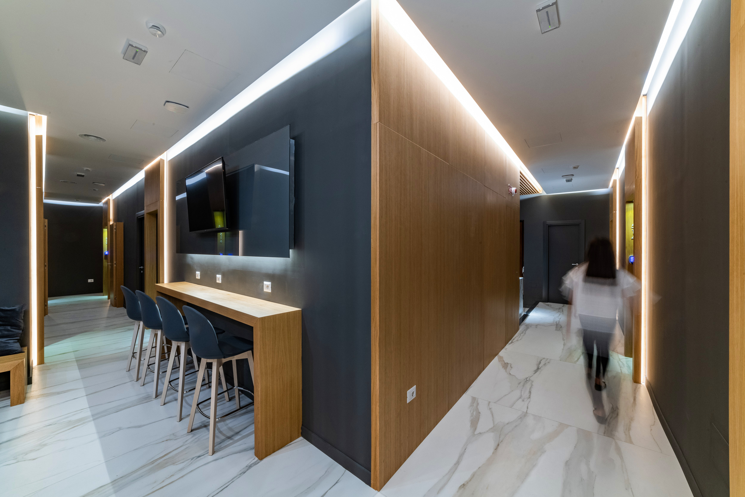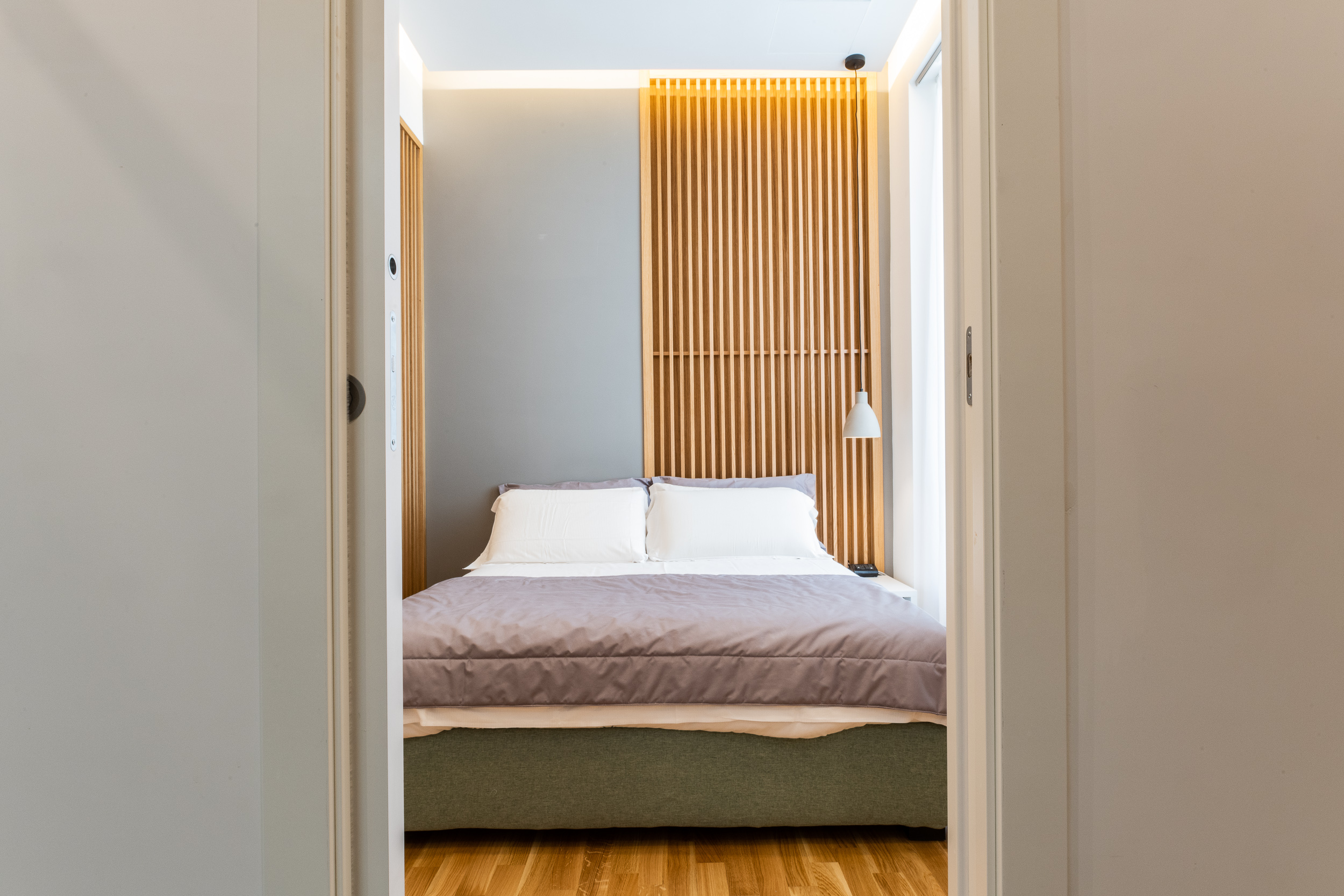 2Il legno utilizzato per la pavimentazione delle camere rende lo spazio accogliente e avvolgente, il grès dei corridoi e delle aree comuni, invece, restituisce ampiezza e luminosità agli ambienti.
