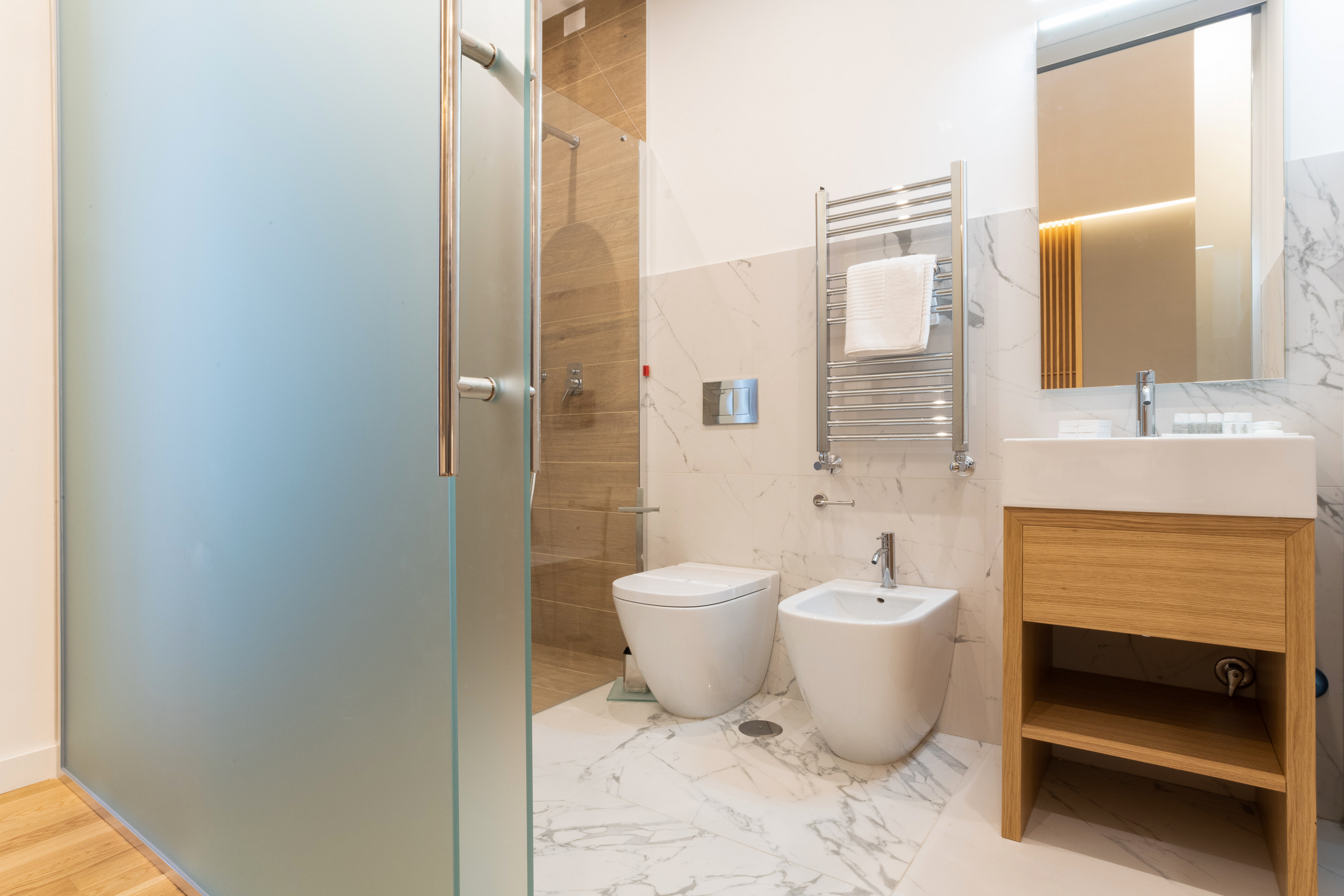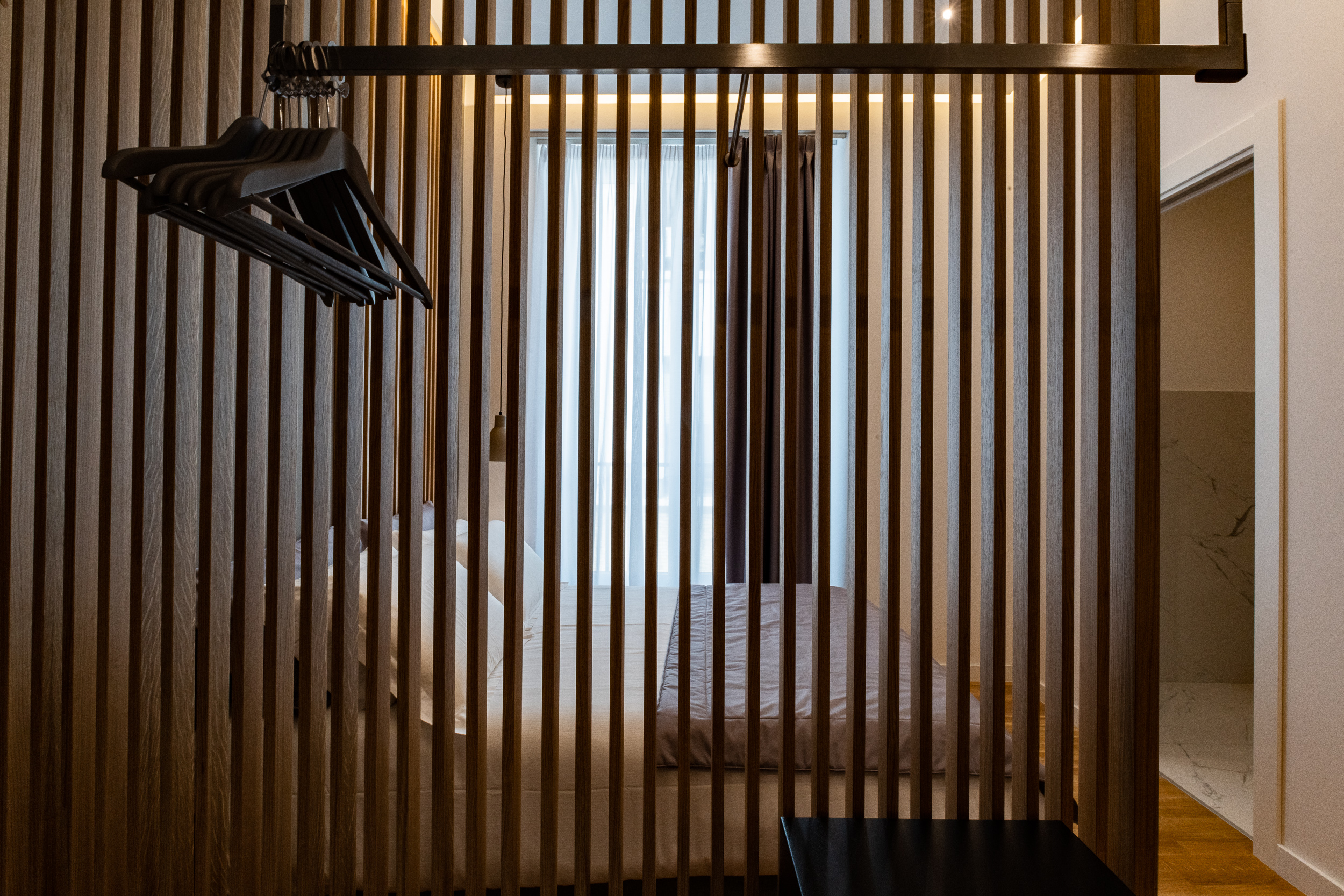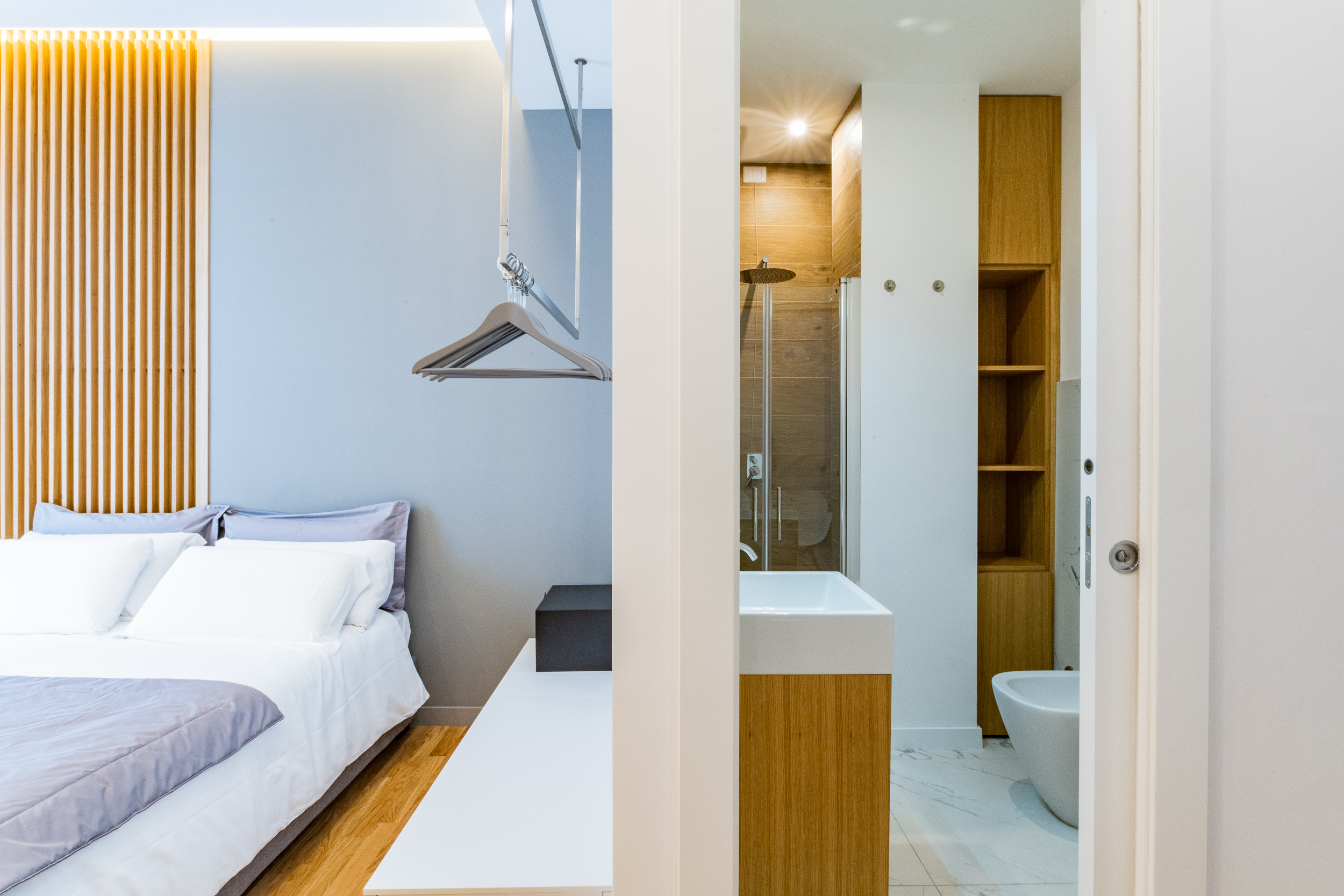 Nei bagni posti all’interno delle camere ritroviamo la congiunzione dei due elementi, grès e legno, per mantenere inalterato il leitmotiv, che ha accompagnato la progettazione.