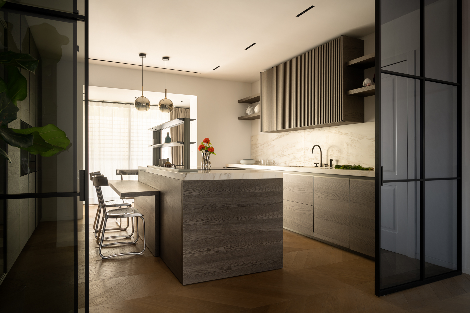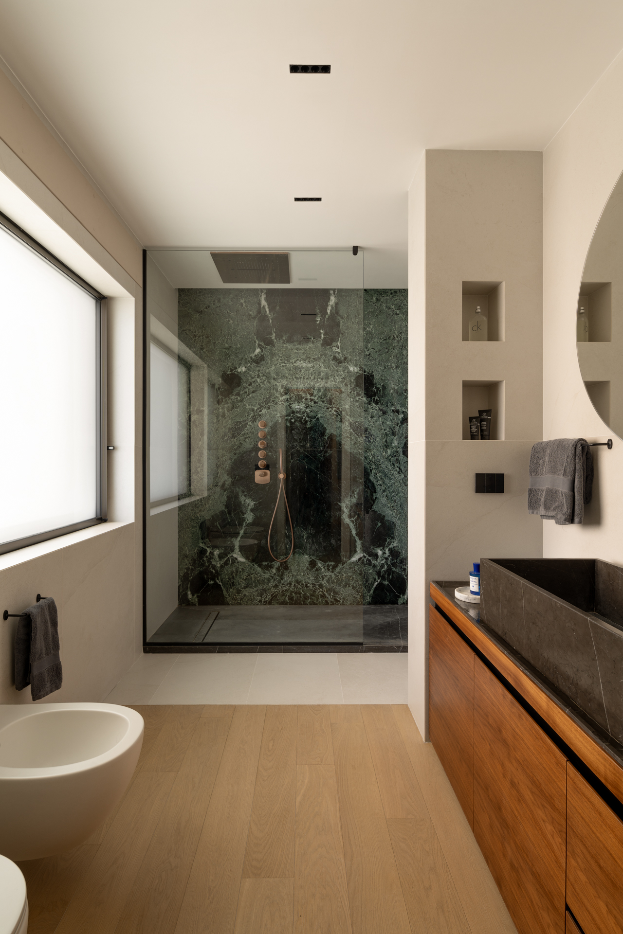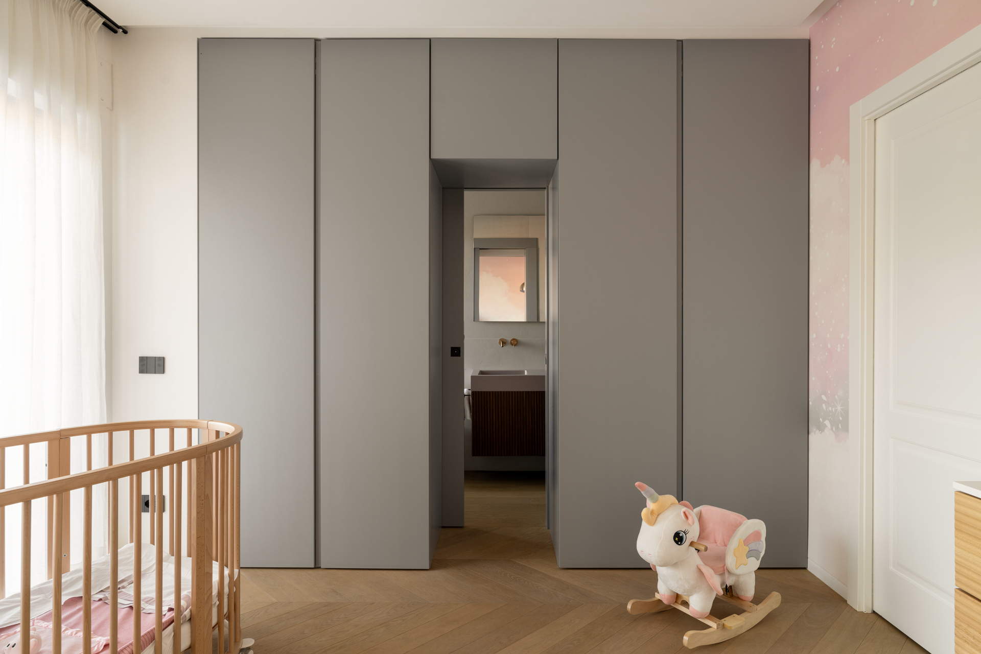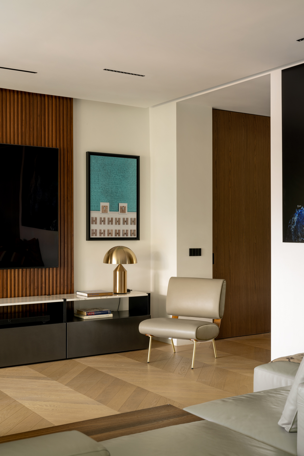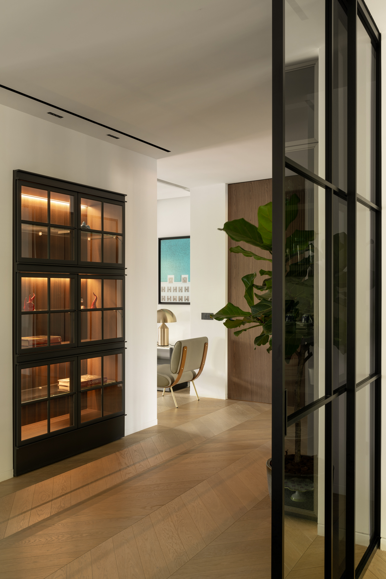 Le divisioni interne dello spazio sono pensate per garantire massima flessibilità. Porte scorrevoli in vetro o legno, completamente abbattibili, permettono di creare una continuità visiva e funzionale tra il grande living, la cucina e il giardino. Questo approccio, che distingue l’approccio alla progettazione di ZETAE Studio, esalta la fruizione degli spazi, favorendo un’esperienza abitativa circolare e immersiva. Per esaltare la fluidità degli spazi sono stati scelti pavimenti in parquet posato a spina ungherese.