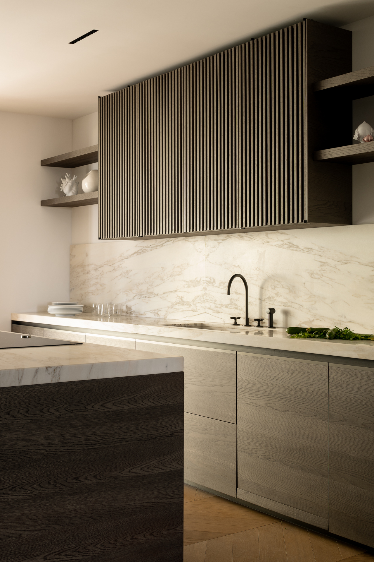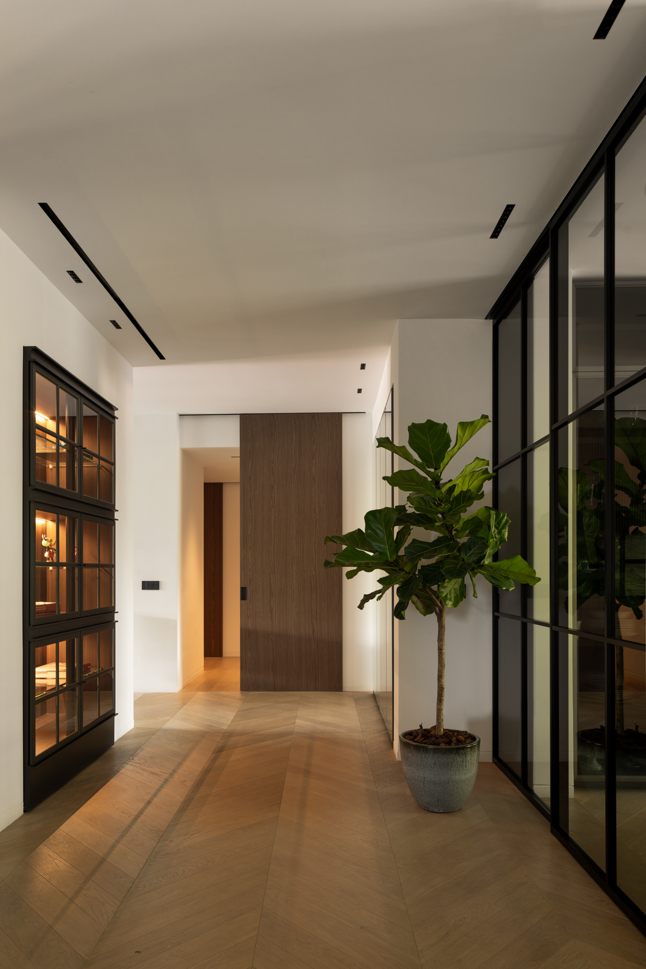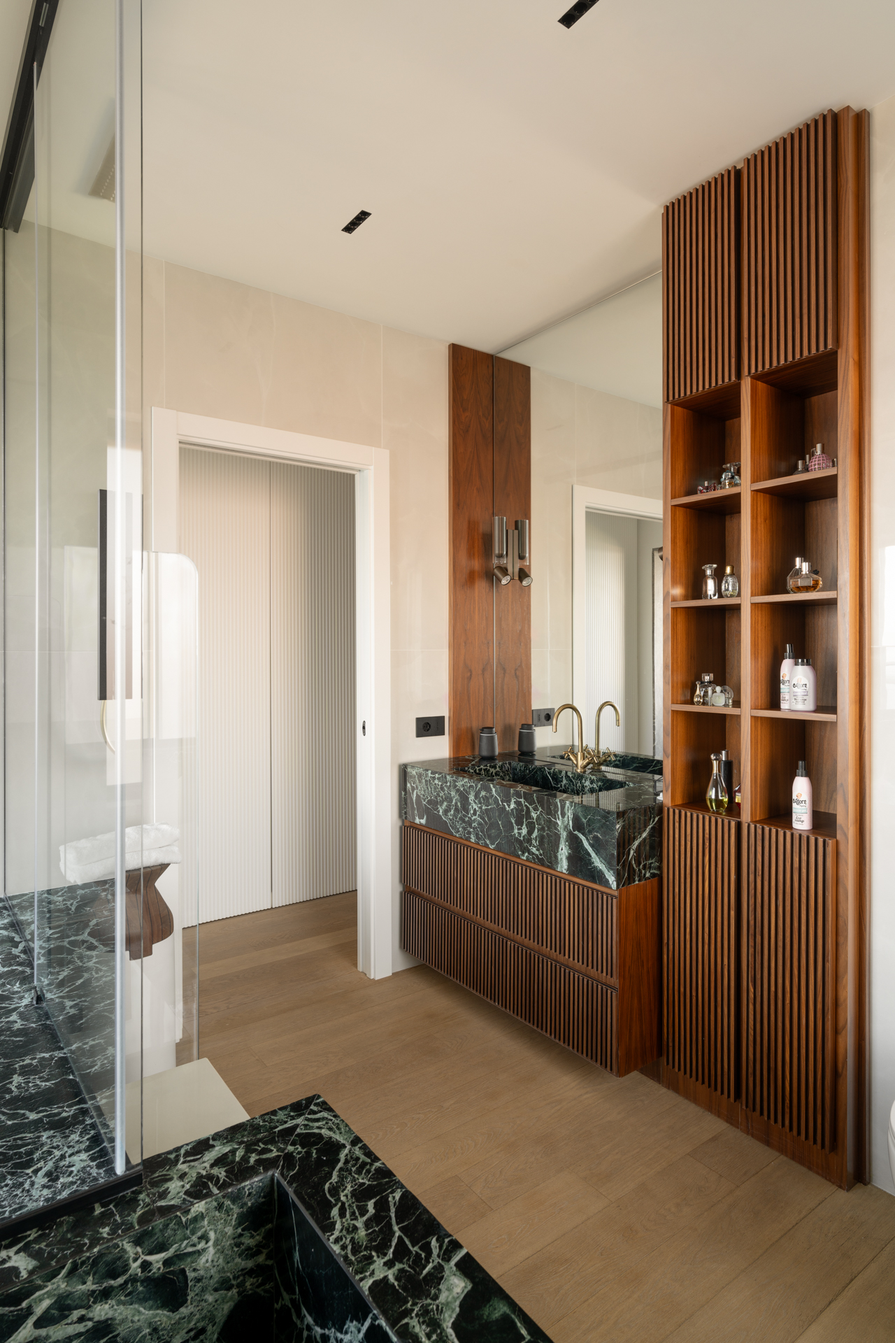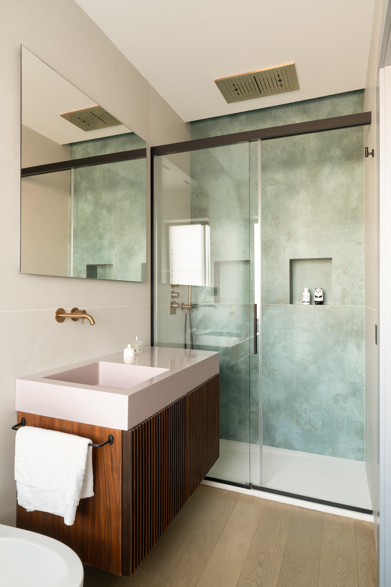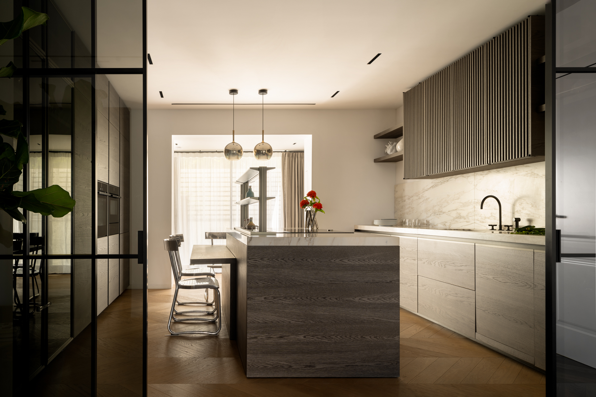 Le divisioni interne dello spazio sono pensate per garantire massima flessibilità. Porte scorrevoli in vetro o legno, completamente abbattibili, permettono di creare una continuità visiva e funzionale tra il grande living, la cucina e il giardino. Questo approccio, che distingue l’approccio alla progettazione di ZETAE Studio, esalta la fruizione degli spazi, favorendo un’esperienza abitativa circolare e immersiva. Per esaltare la fluidità degli spazi sono stati scelti pavimenti in parquet posato a spina ungherese.