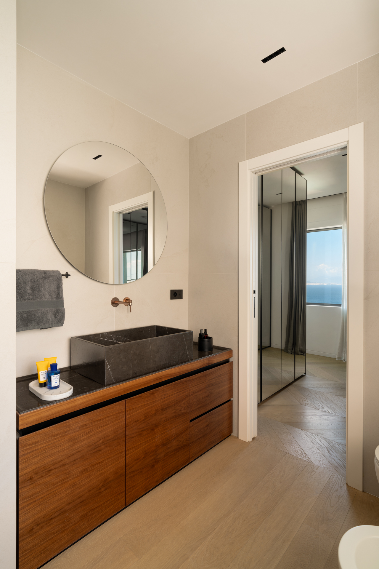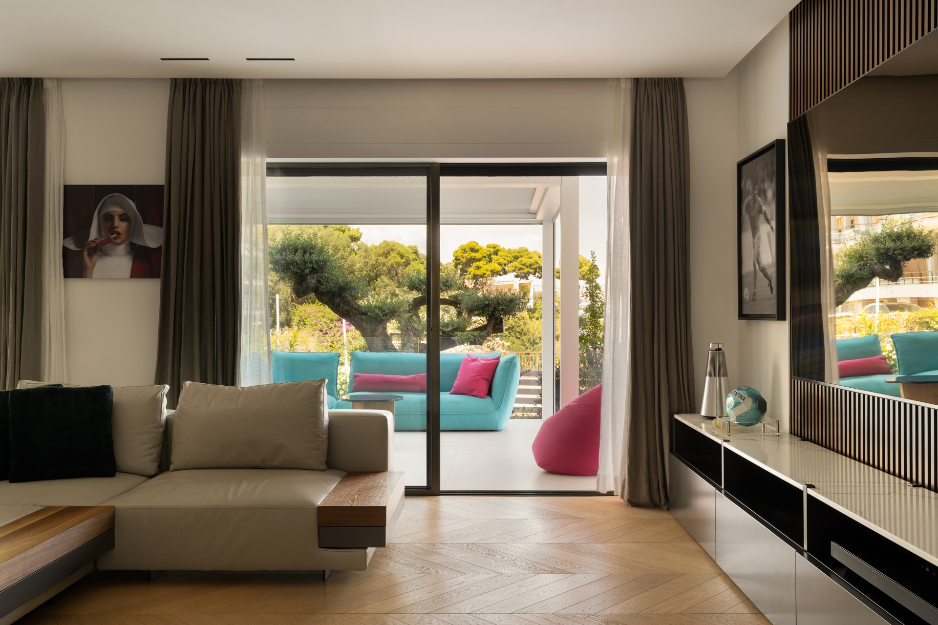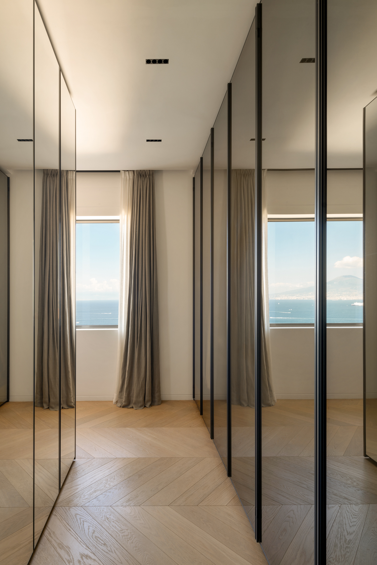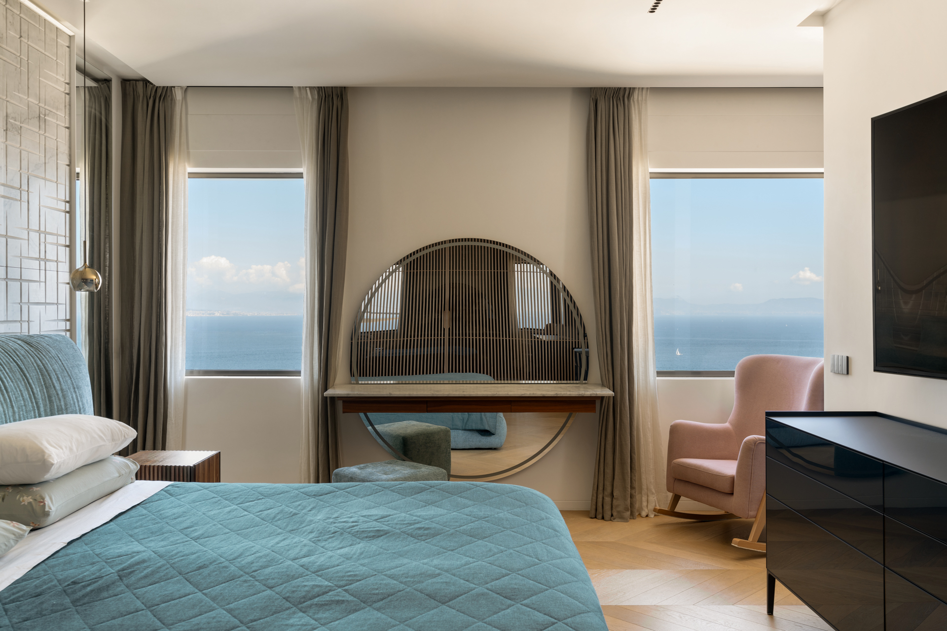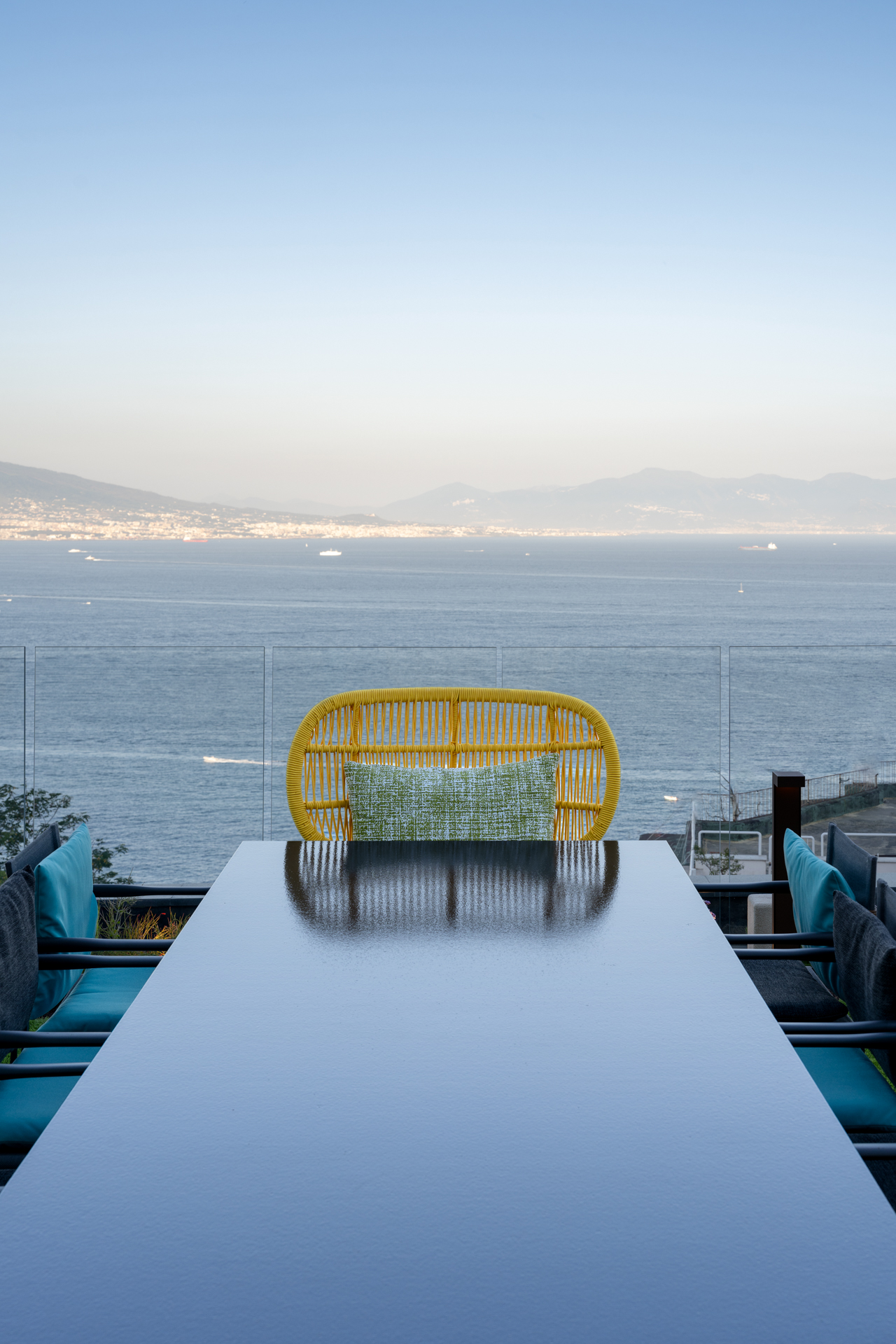 Gli ambienti sono stati valorizzati grazie agli arredi scelti, un mix di pezzi di design e creazioni su misura firmate ZETAE. Le tonalità calde, scelte per dialogare con la luce naturale, accentuano il senso di comfort e armonia. Gli infissi scorrevoli a scomparsa totale diventano protagonisti, eliminando ogni barriera tra interno ed esterno. La luce invade gli spazi e regala scorci mozzafiato. L’effetto è sbalorditivo: ogni stanza si trasforma in un quadro vivente del Golfo.