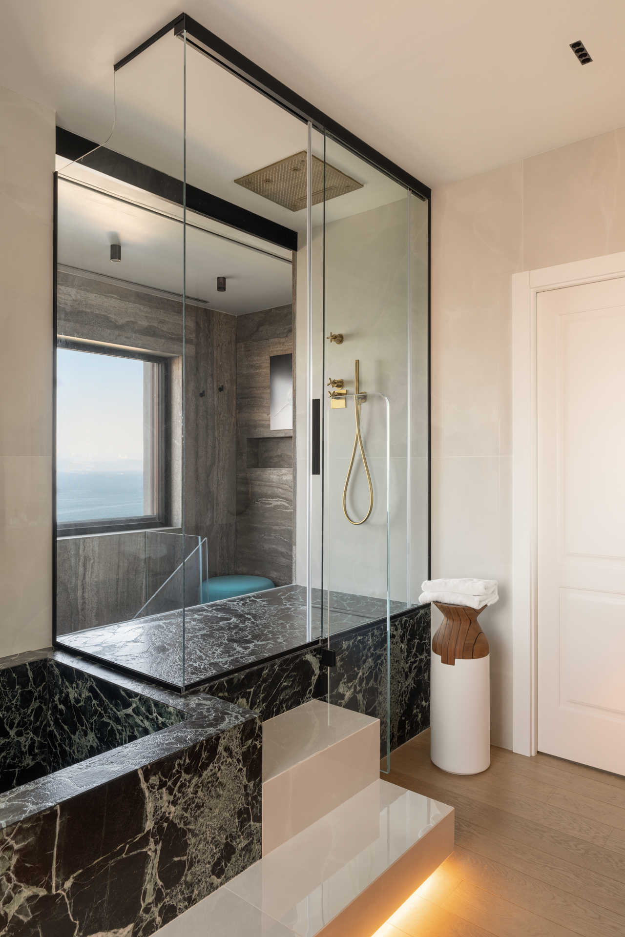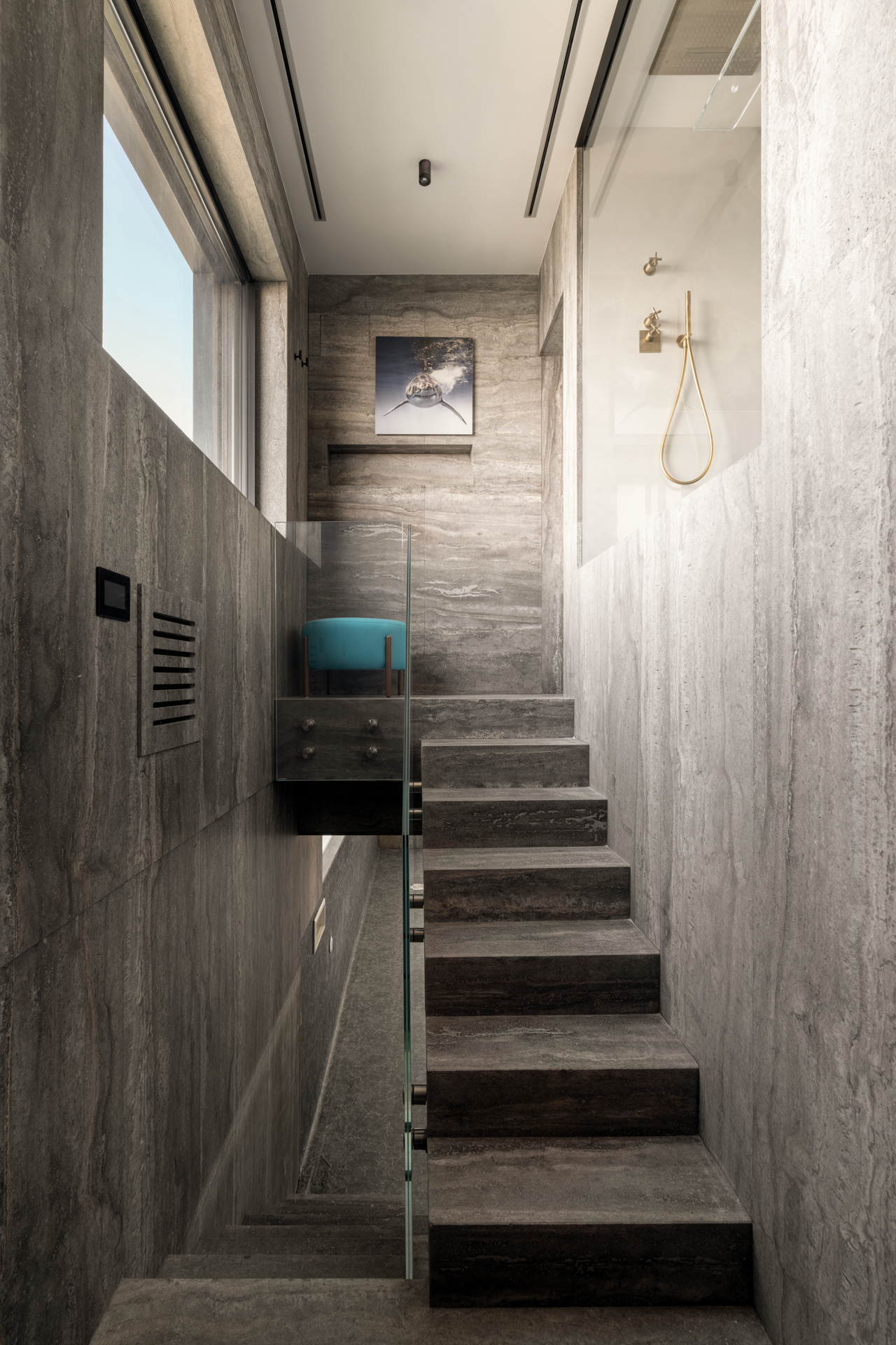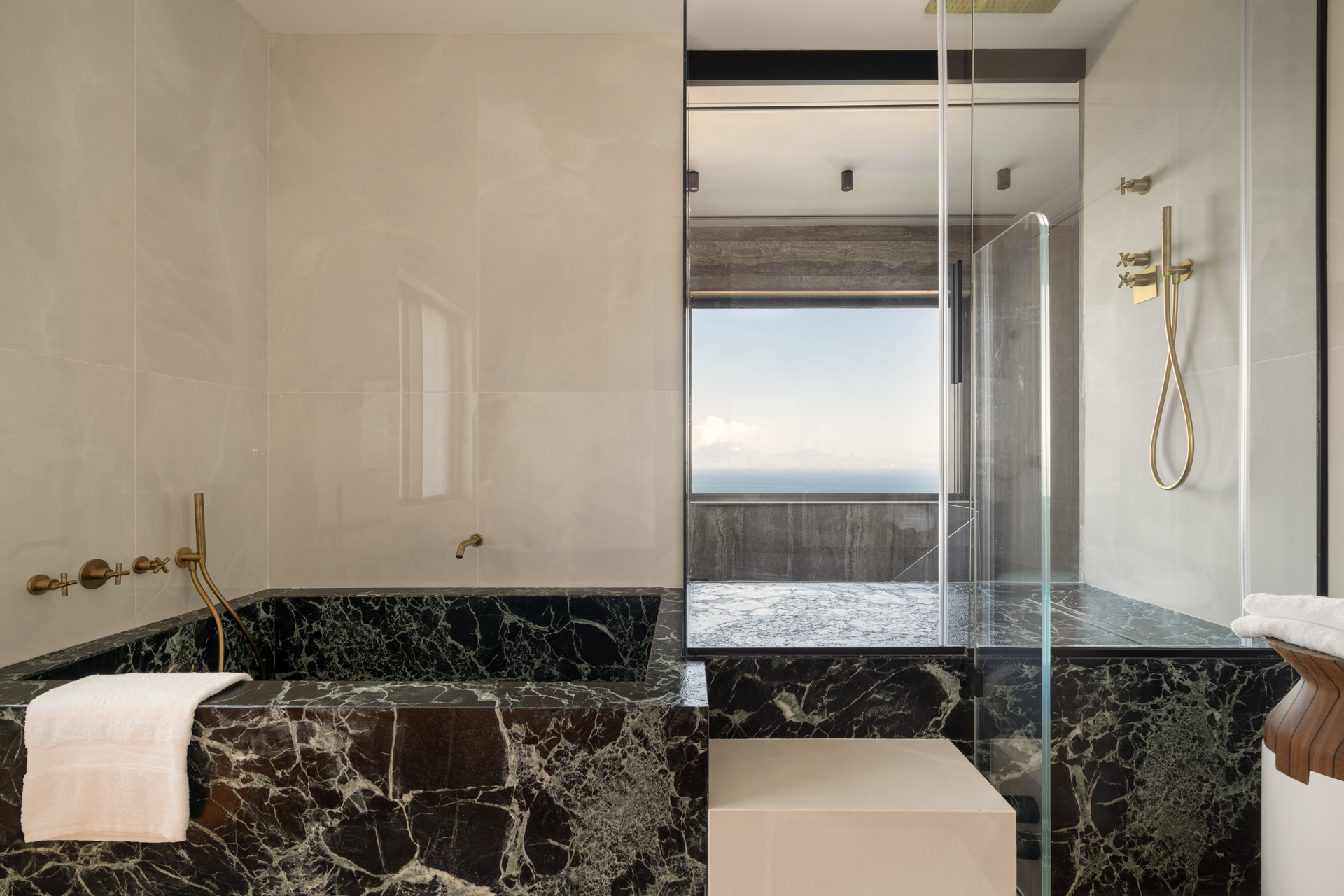 L’ambiente include un accesso diretto, tramite una scala interna in marmo, a una “private spa” progettata con una piscina riscaldata e un’area wellness esclusiva regalano momenti di puro relax, mentre i colori del cielo e del mare, visibili dalle ampie aperture, contribuiscono al benessere psicofisico.