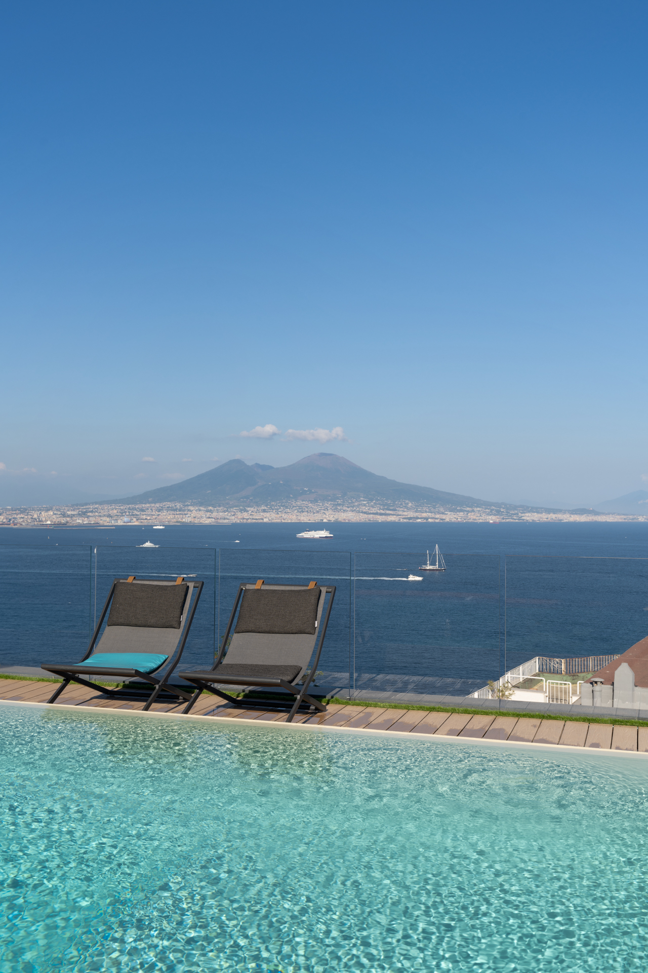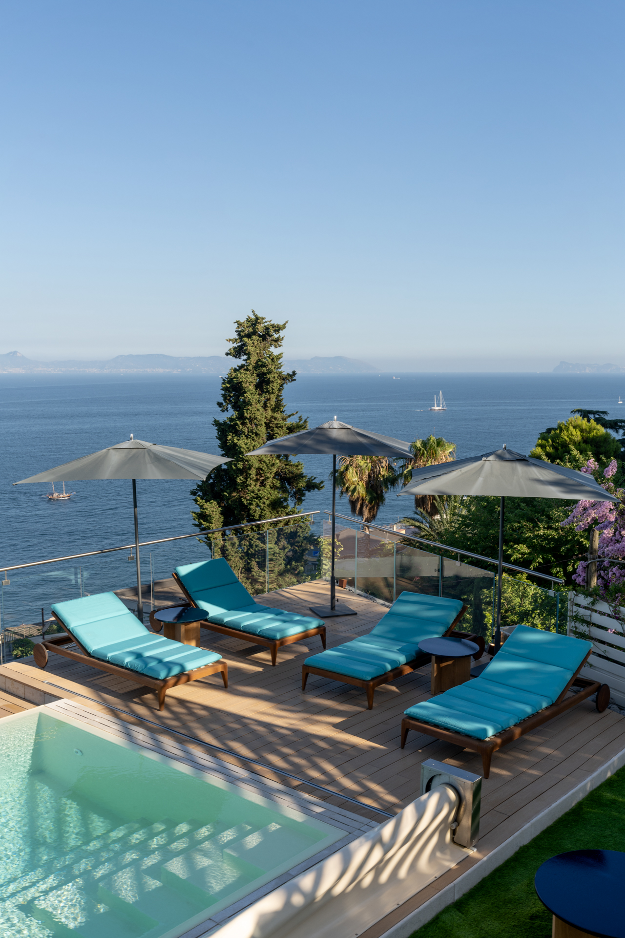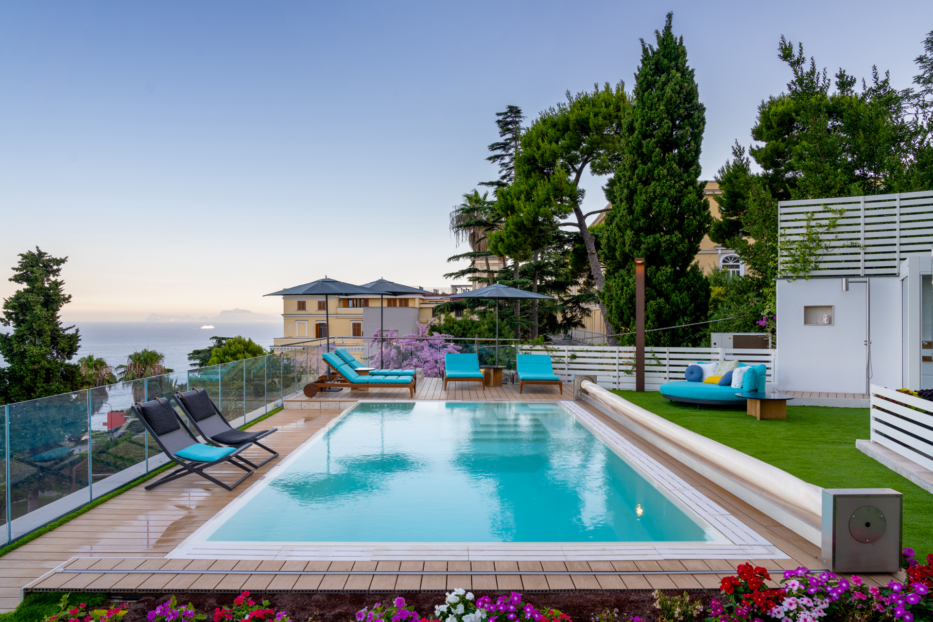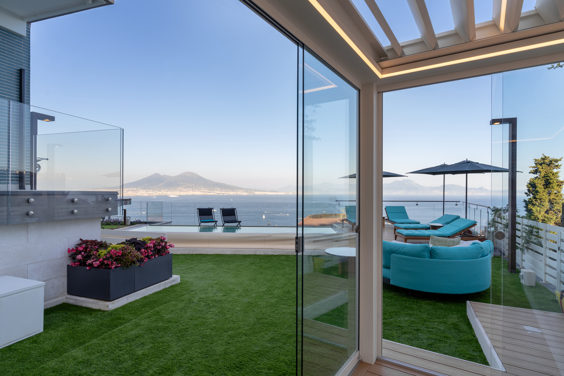 Gli spazi esterni sono stati progettati con la stessa attenzione ai dettagli riservata agli interni. Il giardino, con viste spettacolari sul Vesuvio, la penisola sorrentina e l’isola di Capri, è un luogo incantato. Piante e fiori selezionati creano un’atmosfera unica, mentre la piscina a sfioro, che sembra fondersi con il mare, è una dichiarazione di eleganza e modernità. Le scelte illuminotecniche trasformano il giardino in uno spazio magico nelle ore serali, perfetto per cene all’aperto o bagni notturni. Non manca una cucina esterna su misura, realizzata in Corian, acciaio e legno di okumè, che unisce praticità e design ricercato.