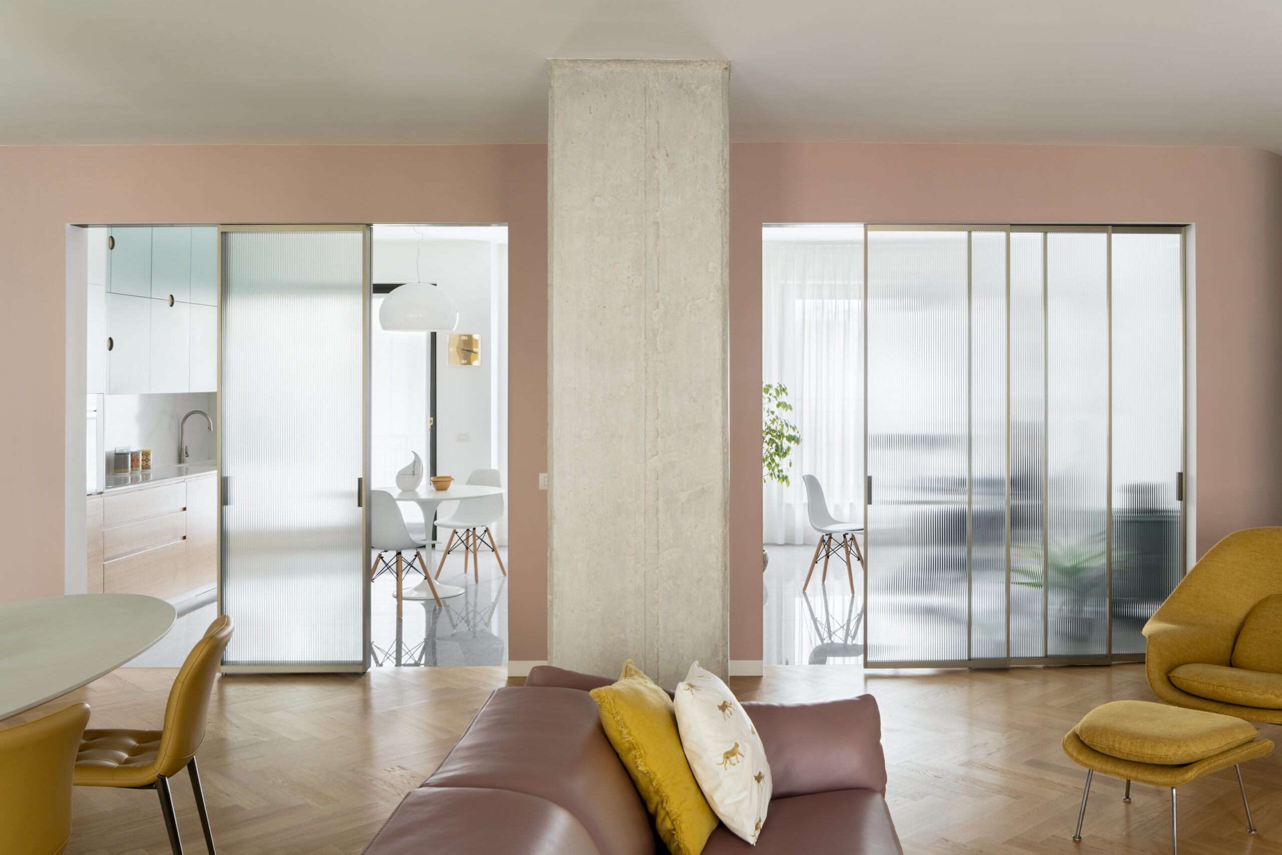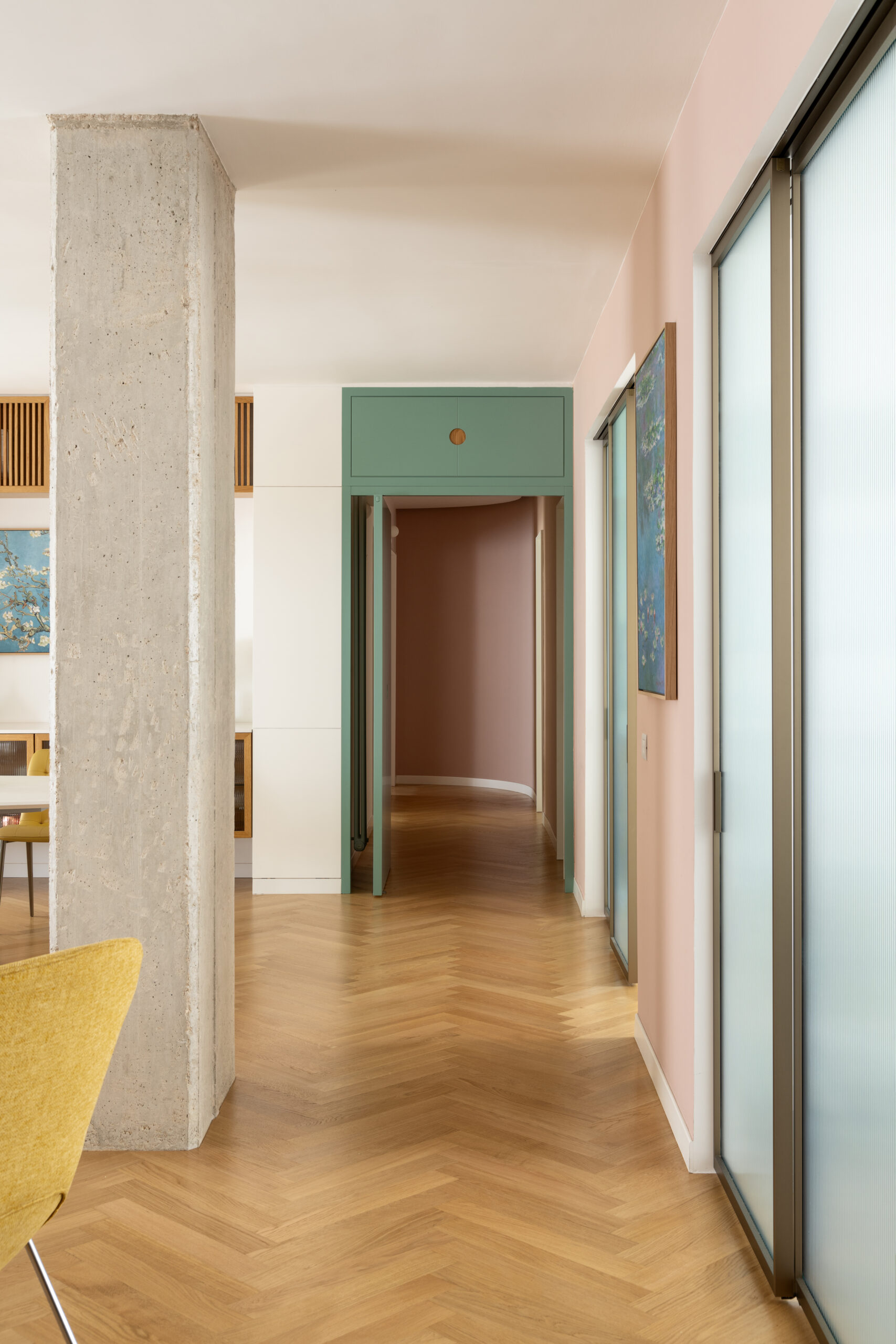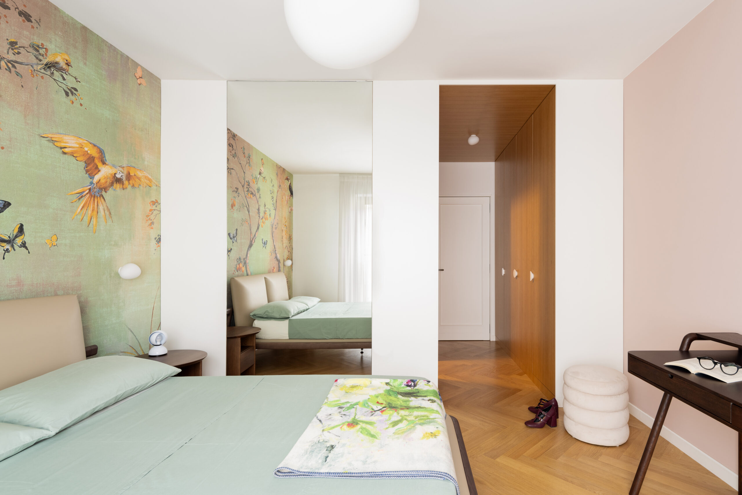 Uno degli elementi distintivi del progetto è una parete color cipria, smussata sui due lati, che attraversa l’intero appartamento: dall’ingresso fino alla camera padronale. Questa divisione concettuale separa le due anime della casa. Da un lato, la cucina, lo studio e i bagni sono caratterizzati da pavimenti in graniglia; dall’altro, il living e le camere da letto si vestono di un elegante parquet di rovere a spina italiana.