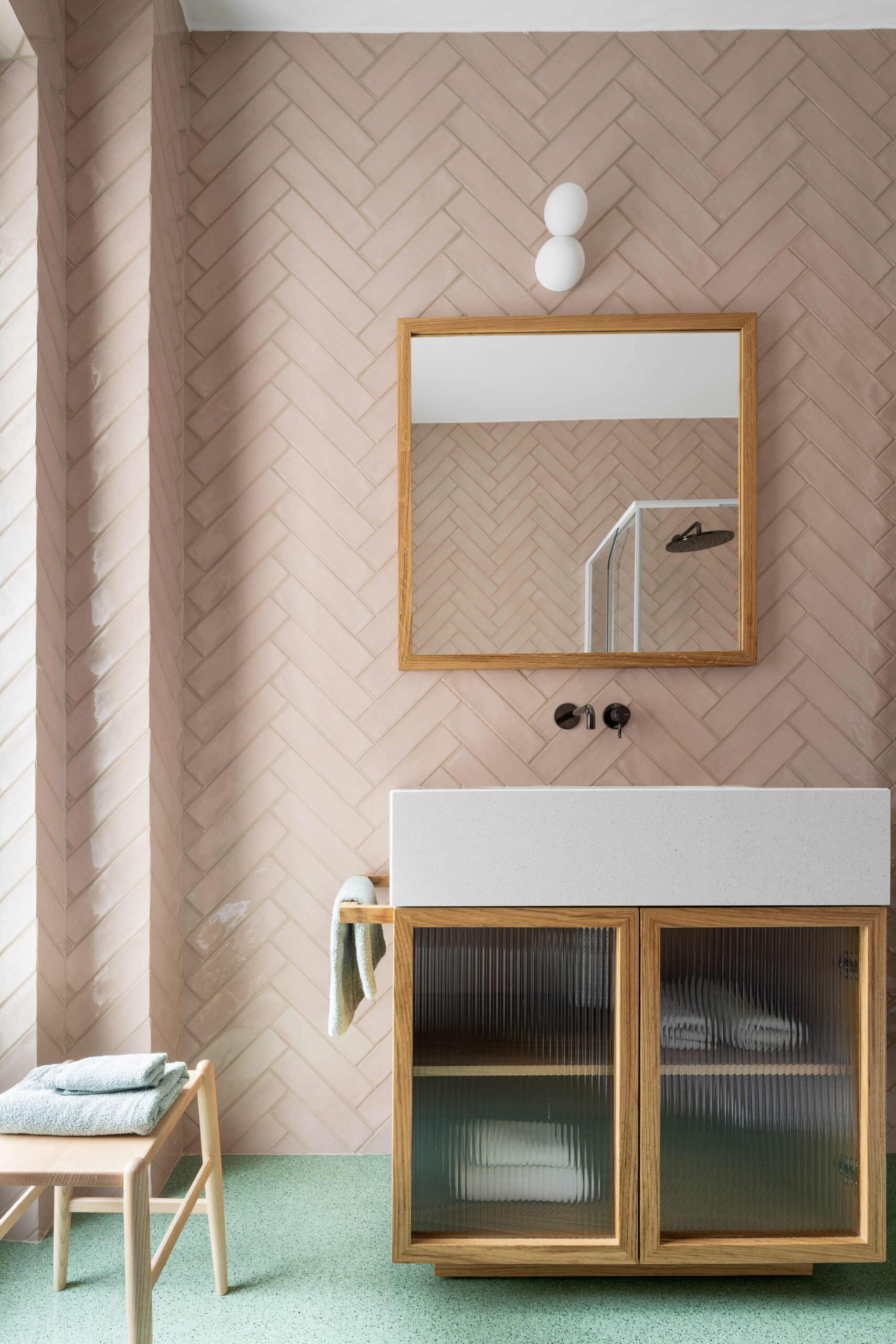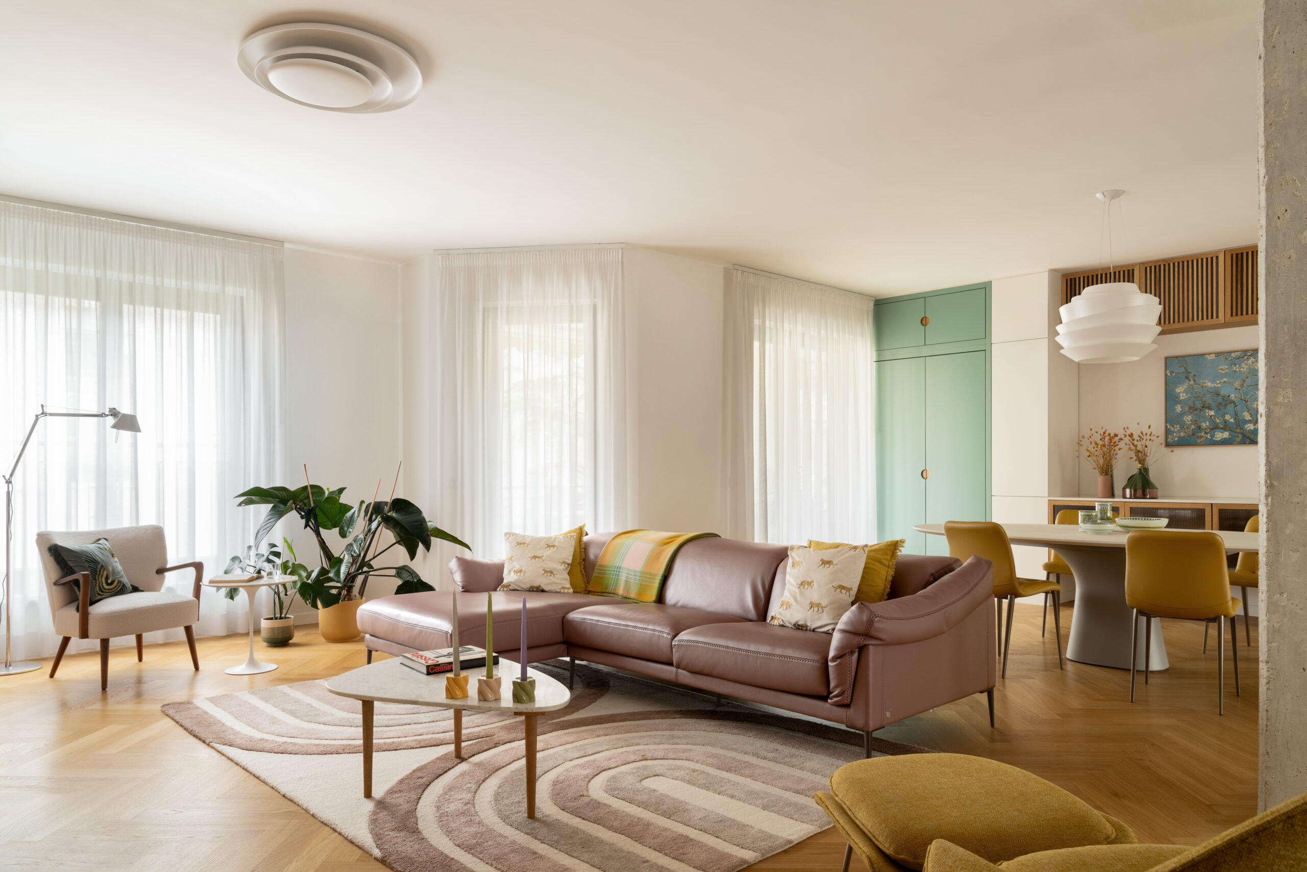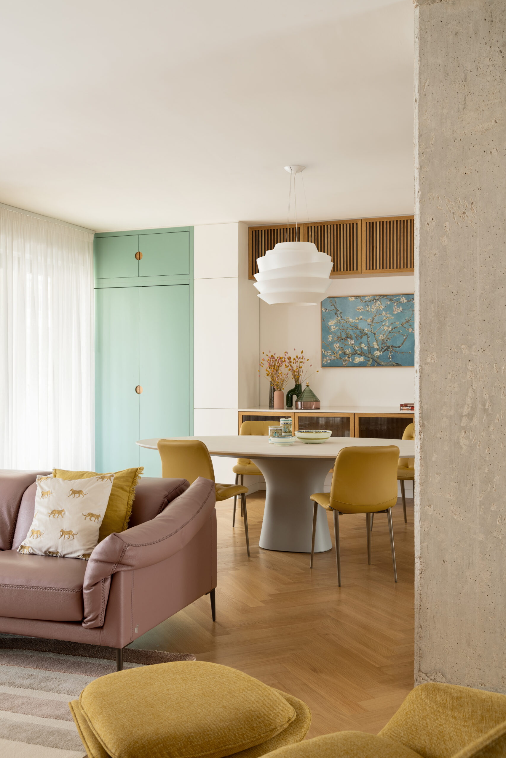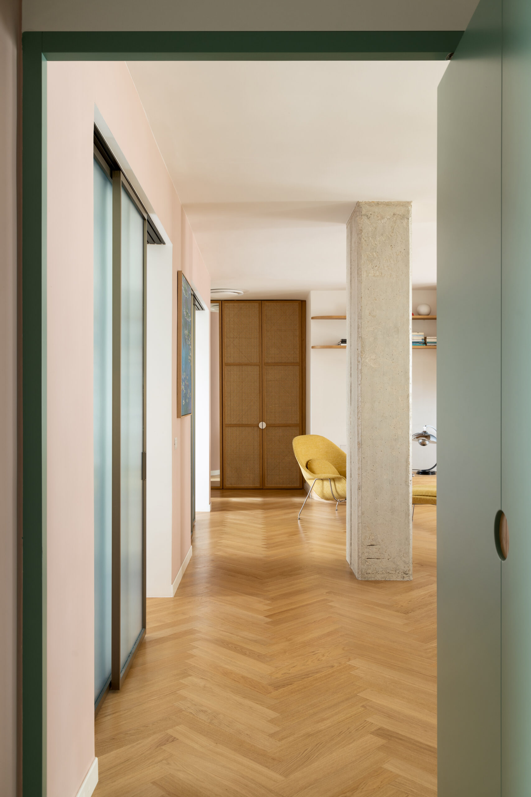 Uno degli elementi distintivi del progetto è una parete color cipria, smussata sui due lati, che attraversa l’intero appartamento: dall’ingresso fino alla camera padronale. Questa divisione concettuale separa le due anime della casa. Da un lato, la cucina, lo studio e i bagni sono caratterizzati da pavimenti in graniglia; dall’altro, il living e le camere da letto si vestono di un elegante parquet di rovere a spina italiana.
