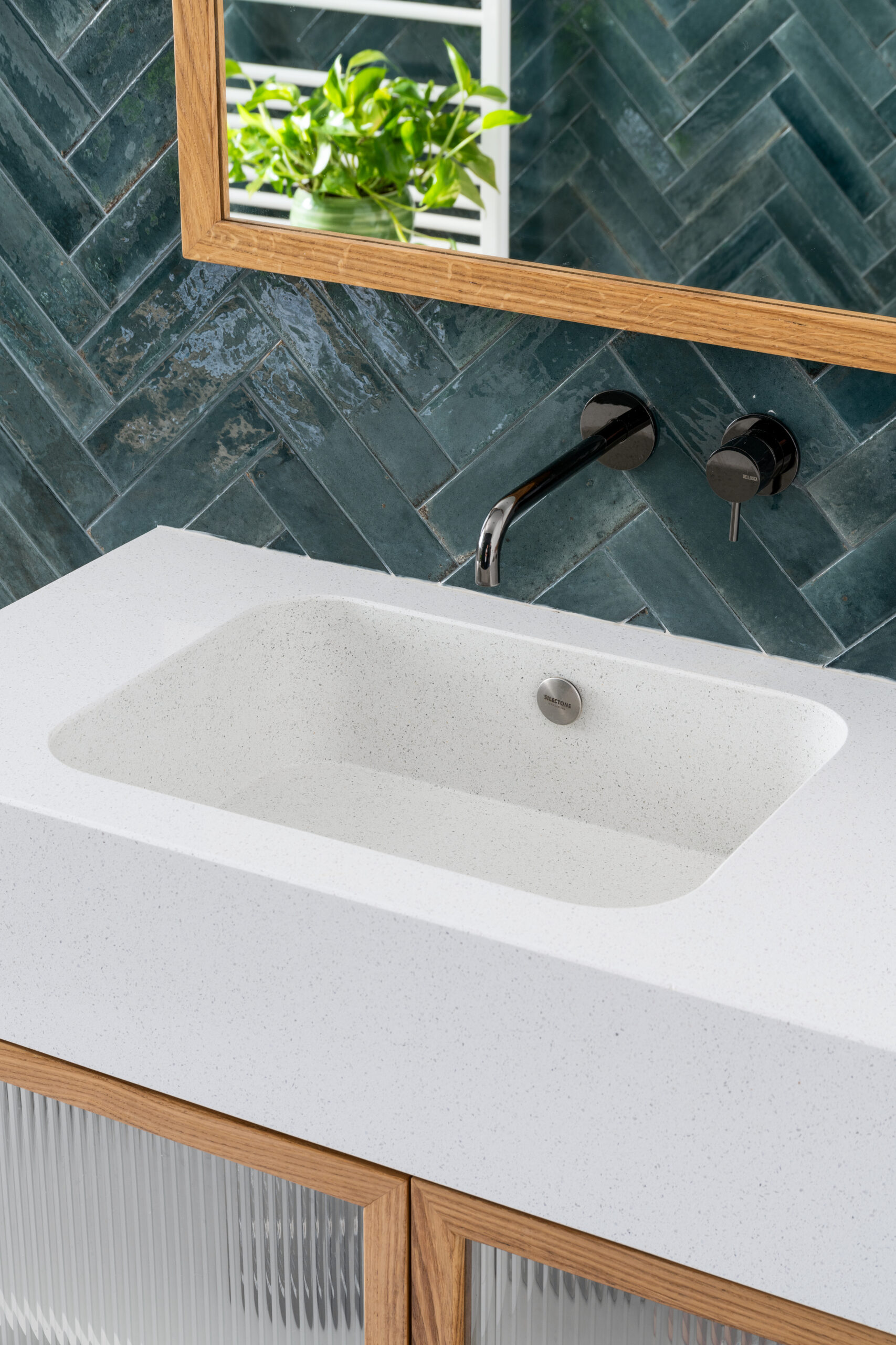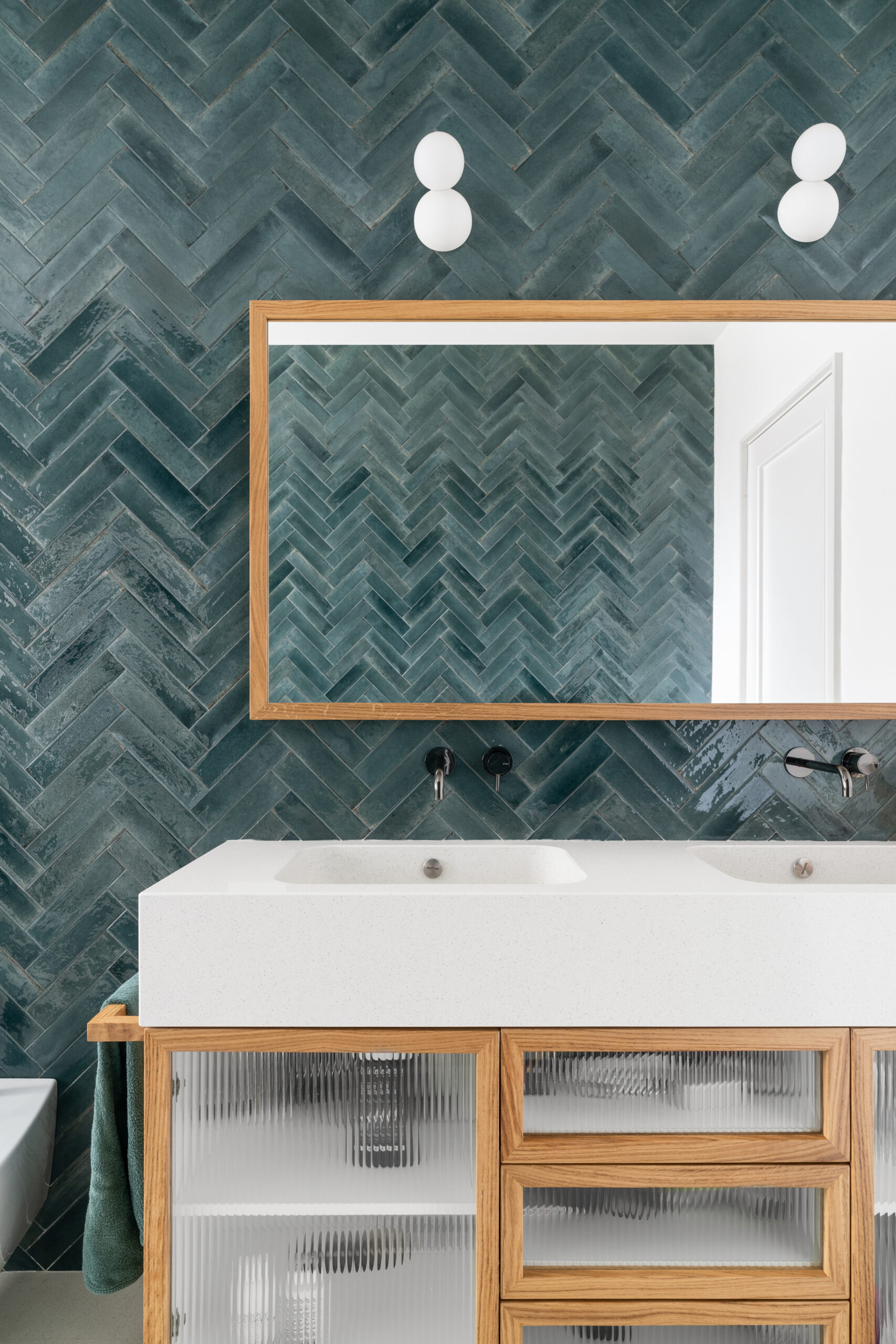 Attraversata la porta a bilico in legno laccato verde, si accede alla zona notte, un ambiente rilassante ed etereo che conduce ai due bagni e alle camere da letto. I bagni, rivestiti interamente con piastrelle colorate posate a spina italiana, si distinguono per i pavimenti in graniglia verde e bianca e per i mobili su misura con piani e vasche in graniglia, oltre a ante in rovere e vetro cannettato.