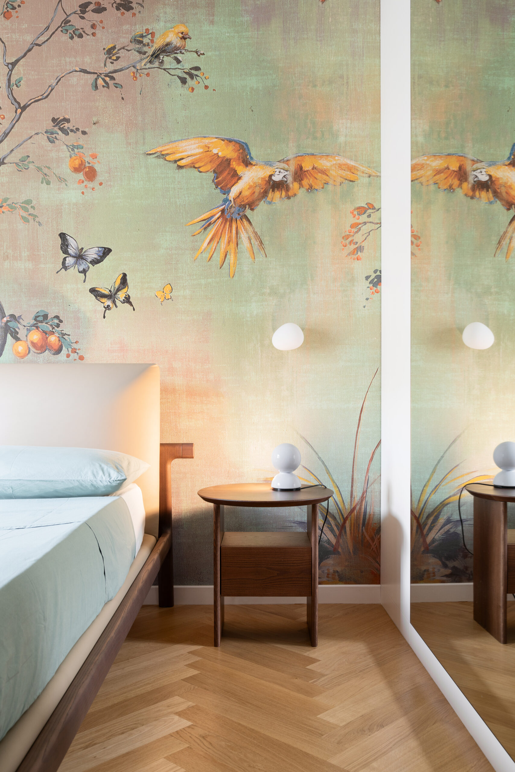 La camera matrimoniale è uno spazio di puro comfort, decorato con carta da parati dall’ambientazione tropicale e boiseries in legno laccato. L’ingresso alla stanza, che funge da filtro tra il disimpegno e la zona più intima, è caratterizzato da un armadio e una boiserie in rovere che riveste le pareti della cabina armadio. Il letto, in legno massello, si distingue per le sue linee essenziali ed eleganti, completando l’atmosfera raffinata della stanza.