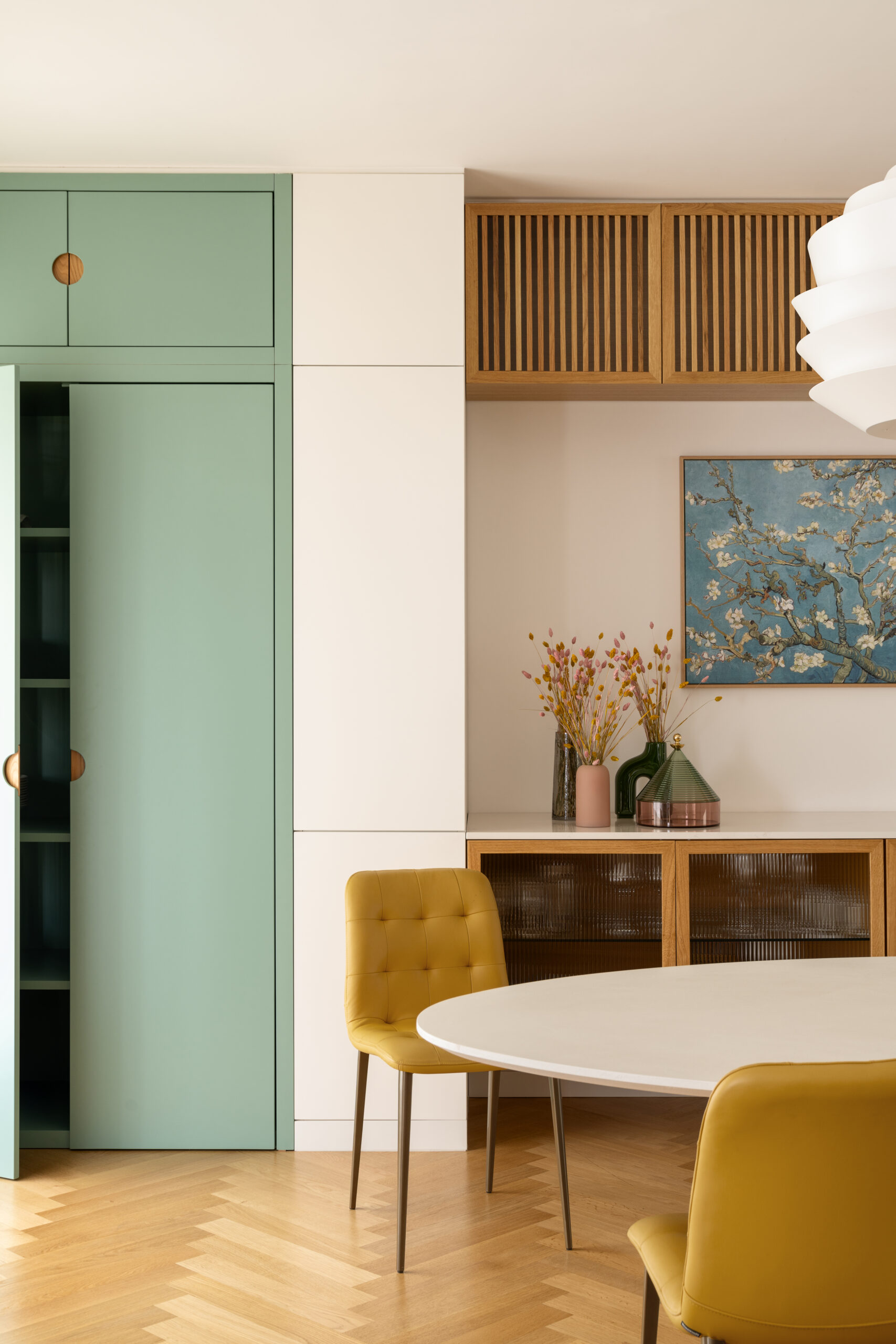 L’ingresso e il soggiorno sono impreziositi da arredi d’autore e mobili su misura. Una cappottiera in rovere con ante rivestite di specchi e paglia di Vienna accoglie gli ospiti all’entrata. Una panca bassa in rovere, con angoli smussati, si integra armoniosamente con la parete del camino e funge anche da contenitore. Inoltre, una parete attrezzata, composta da elementi in legno laccato verde e bianco, vetro cannettato e rovere, incorpora una madia, mobili contenitori e una porta a bilico che conduce alla zona notte.